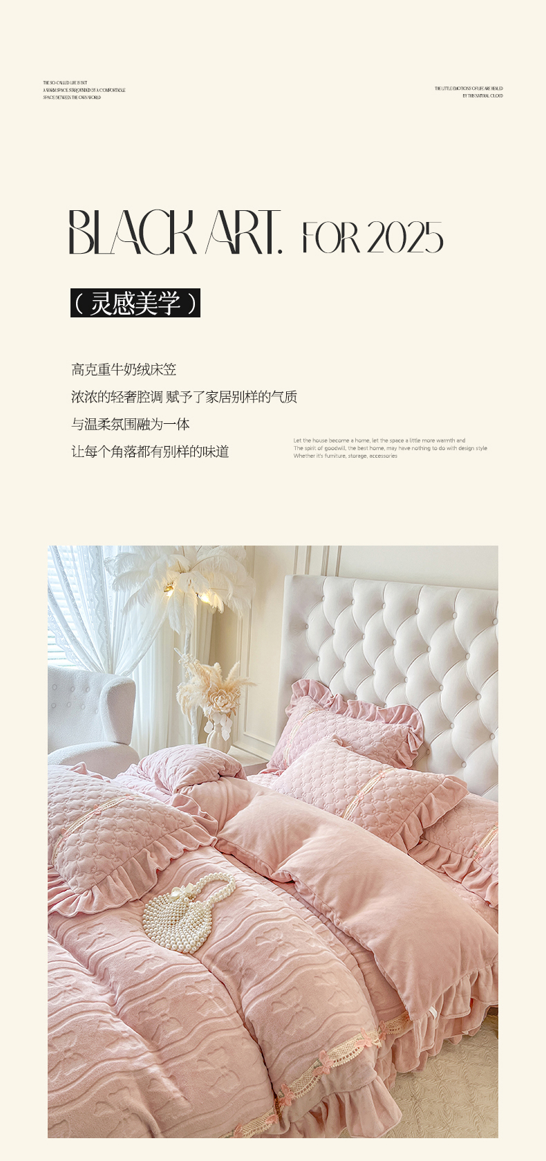 (总)瑞宝 2025新款雕花牛奶绒花边夹棉床盖四件套-莫妮卡,奶昔白,抹茶绿,奶茶咖,少女粉,雾蓝