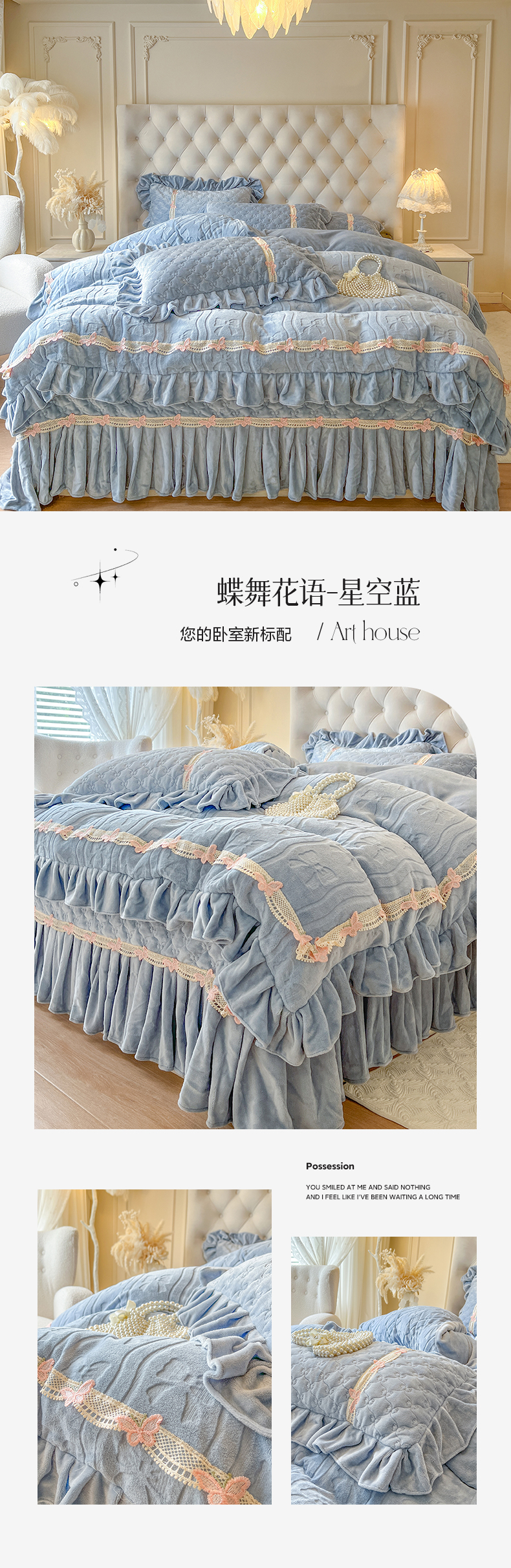 瑞宝 2025新款牛奶绒花边床盖四件套-蝶舞花语(控价 298起 ) 蝶舞花语-星空蓝