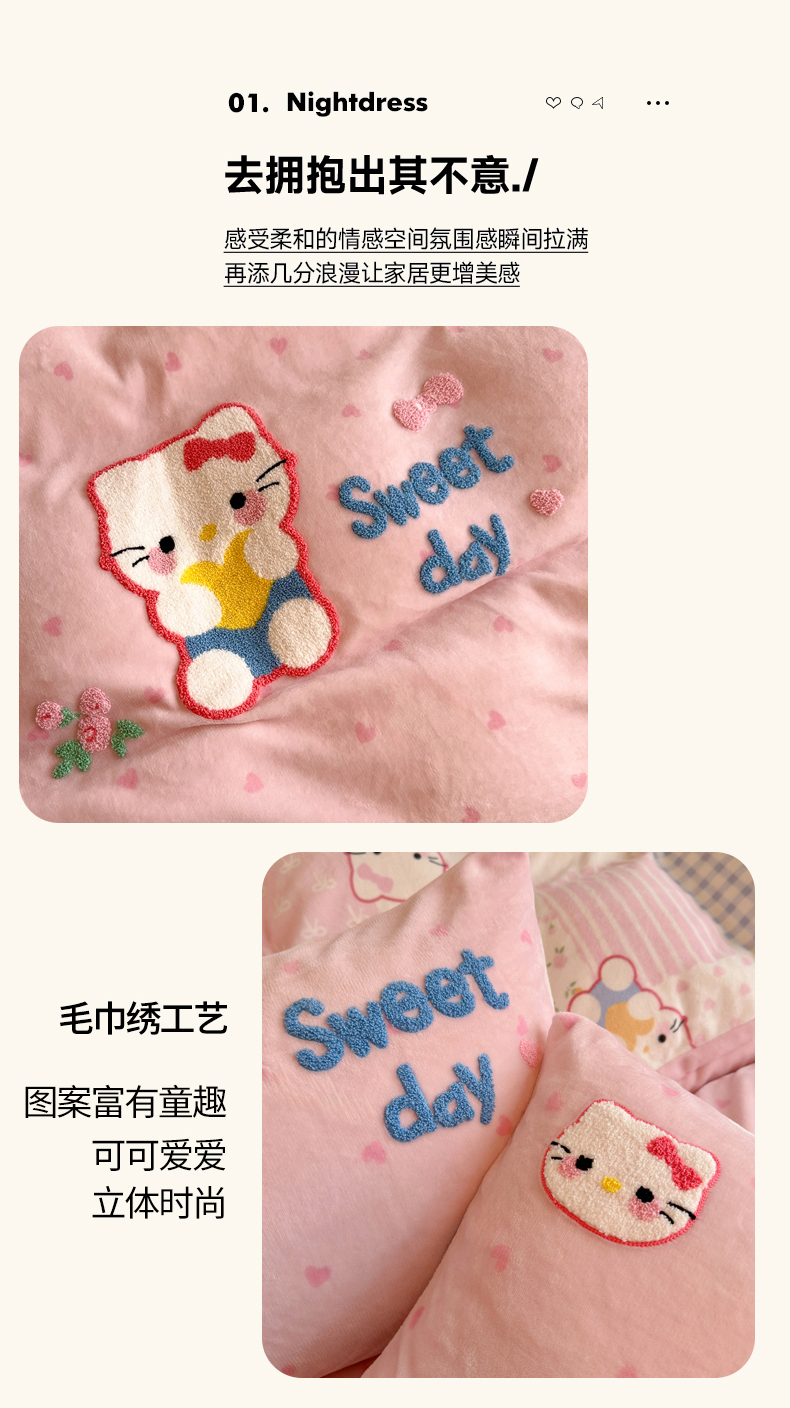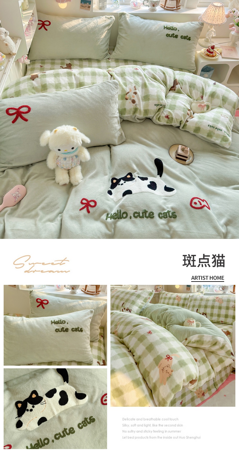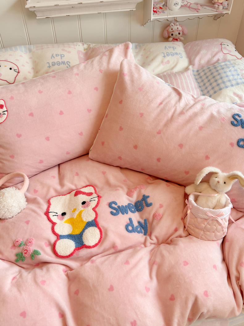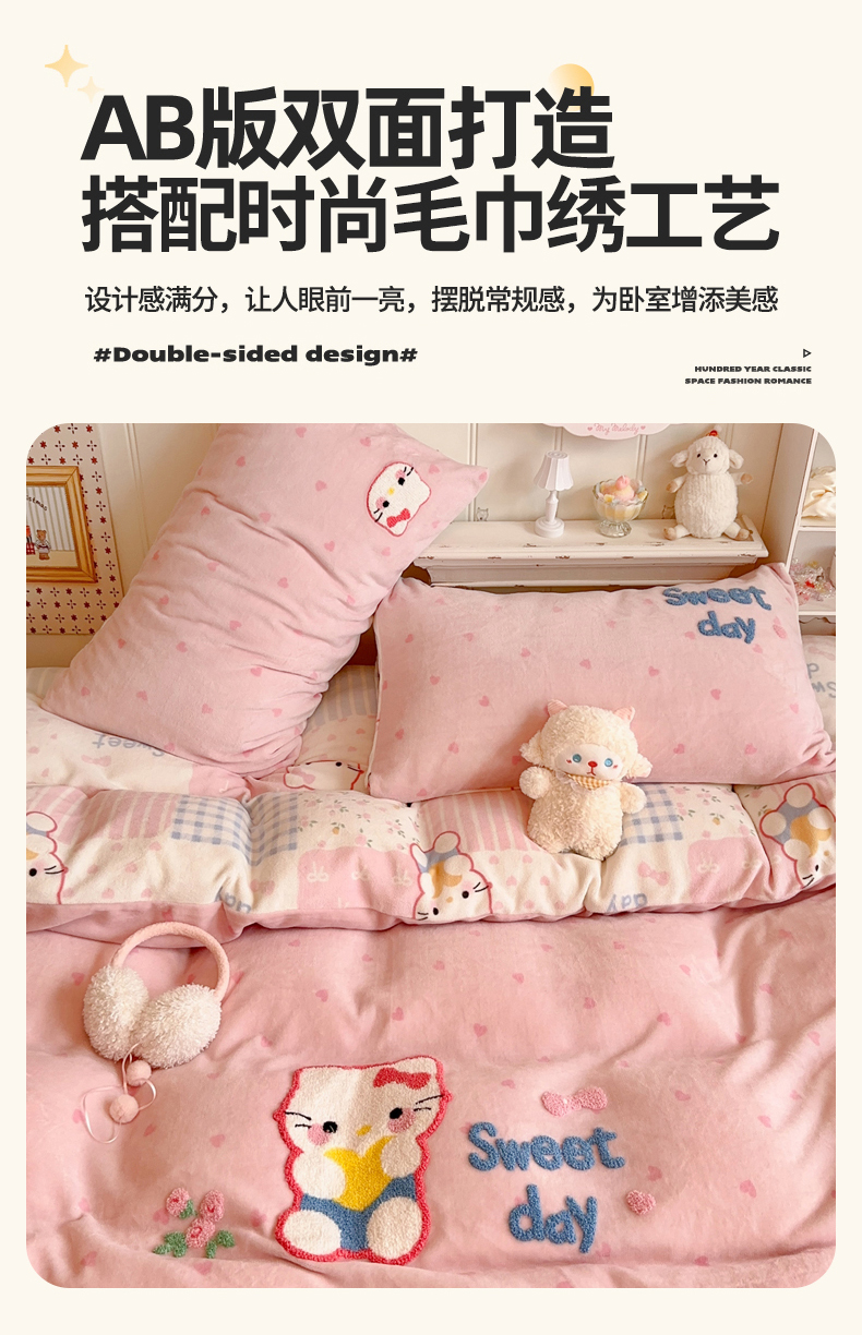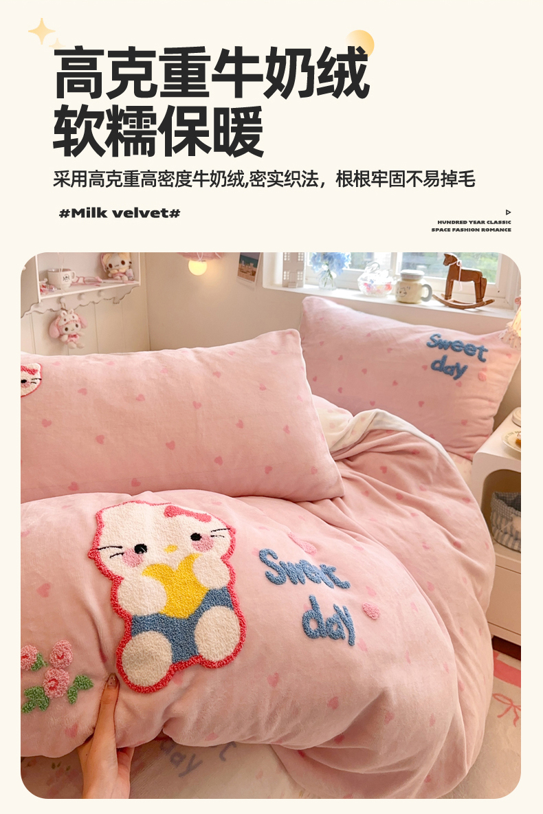 商品名称:Sweet dreams甜梦 2025新款全消光牛奶绒毛巾绣印花四件套 爱心粉猫