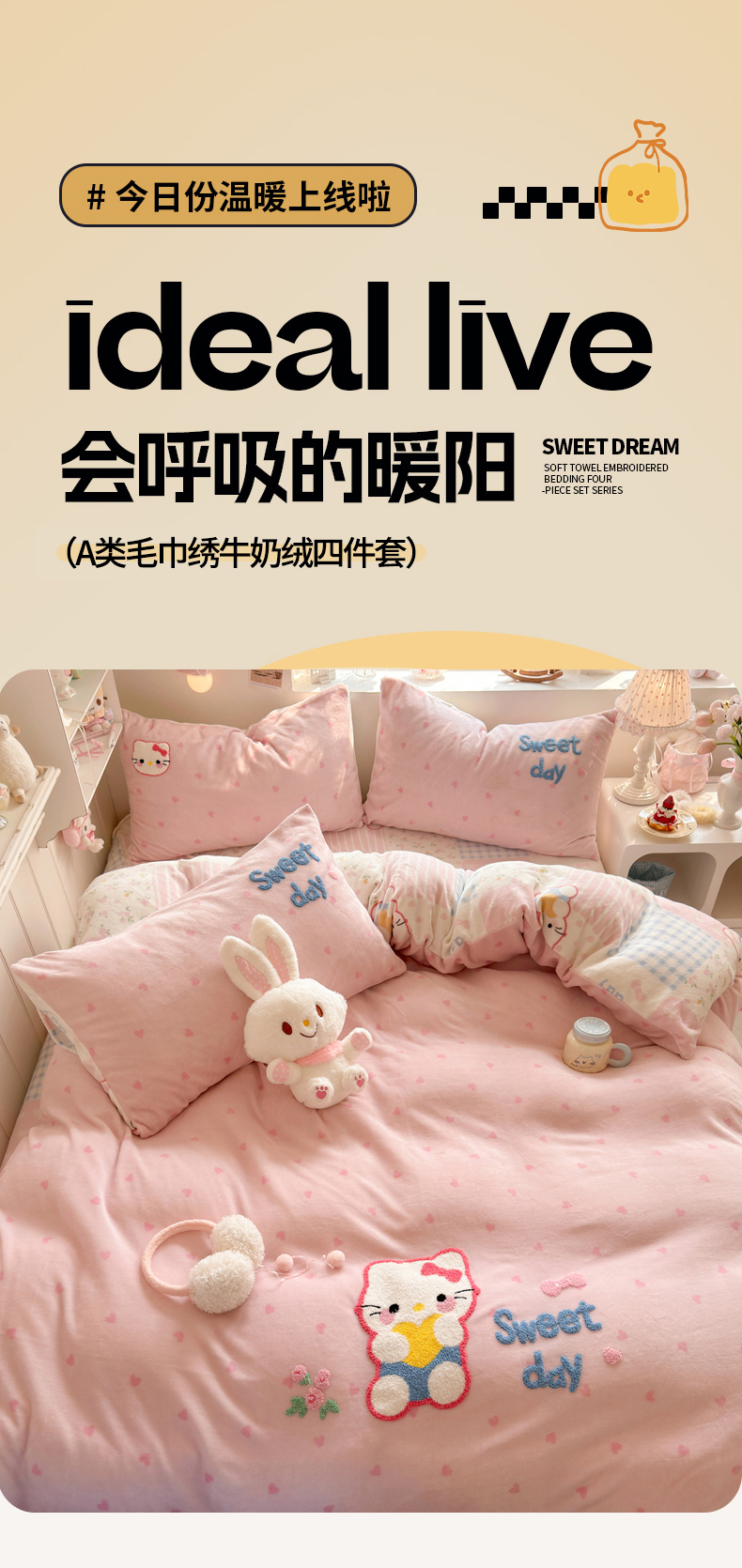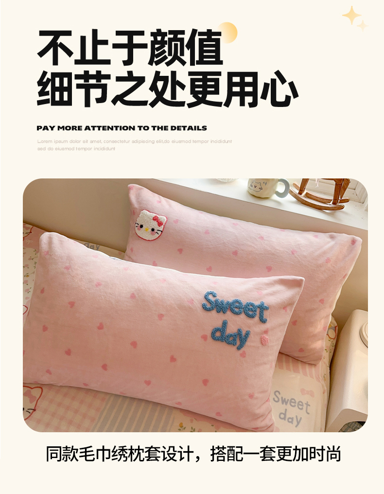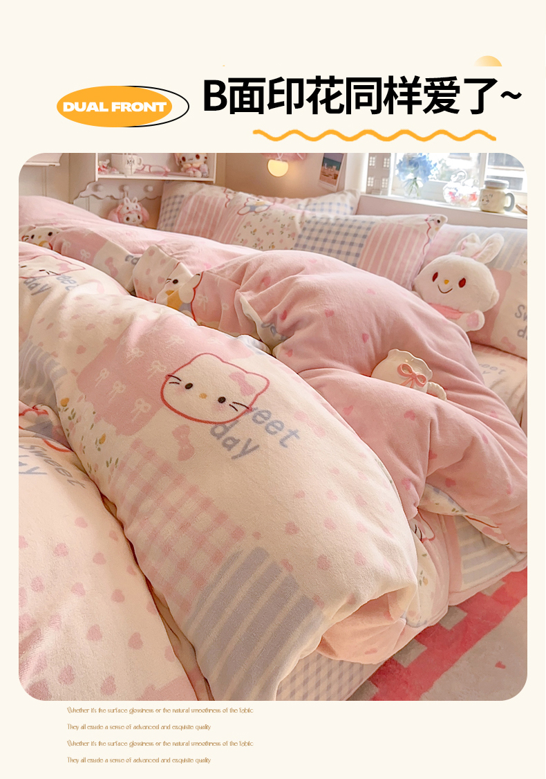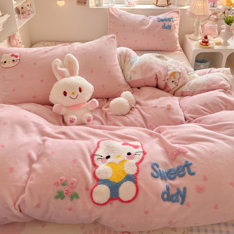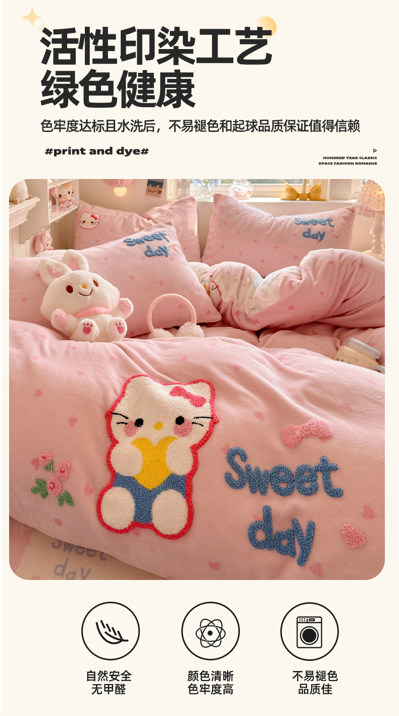 商品名称:Sweet dreams甜梦 2025新款全消光牛奶绒毛巾绣印花四件套 爱心粉猫