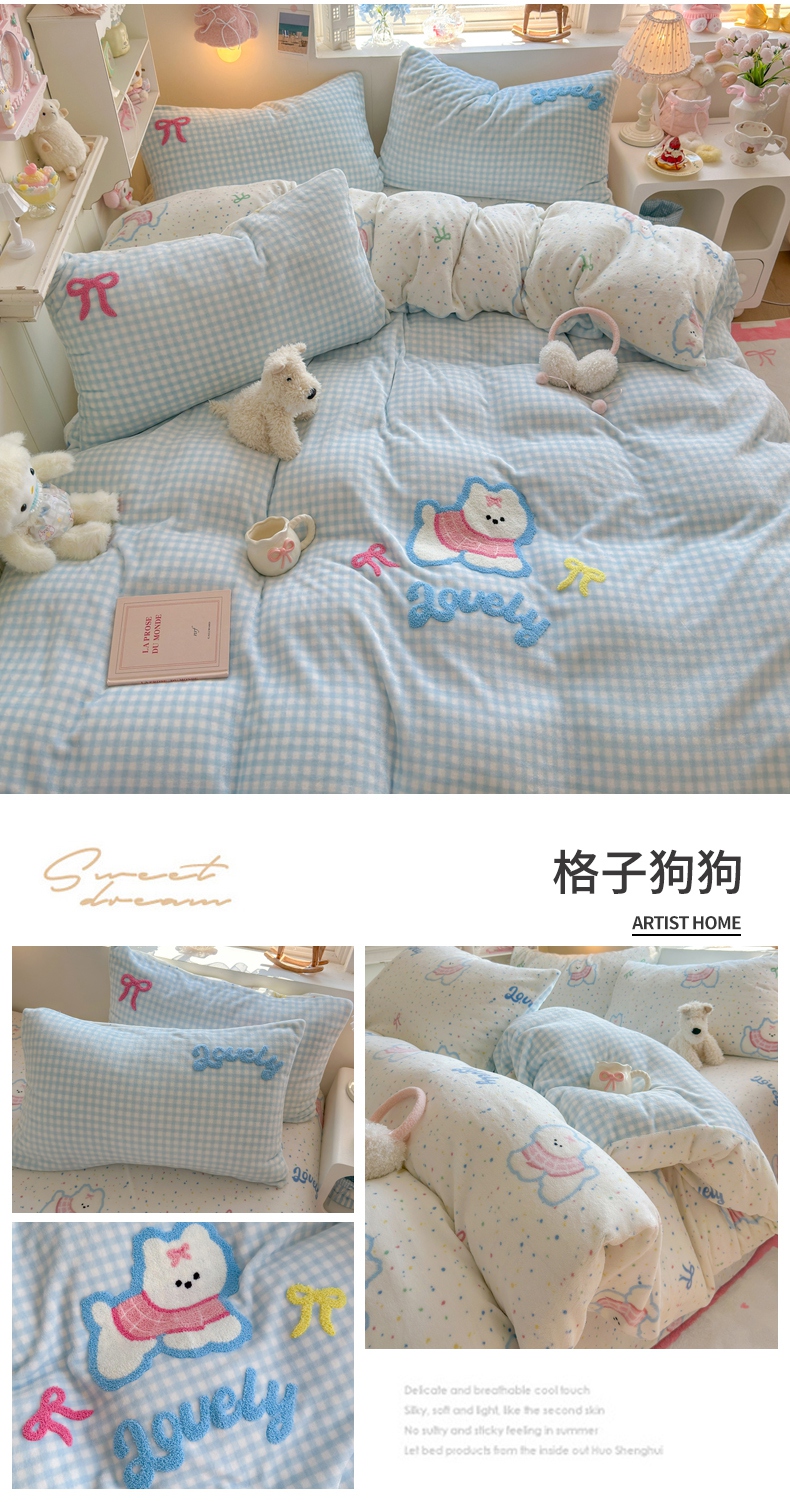 (总)Sweet dreams甜梦 2025新款双层纱豆豆绒棉加绒四件套,楼兰米,千颂伊蓝,花梦时,童趣王国,条纹小熊仔,水蜜桃,朱古力小奶狗,绘梨黑,温婉话语,郁金花海