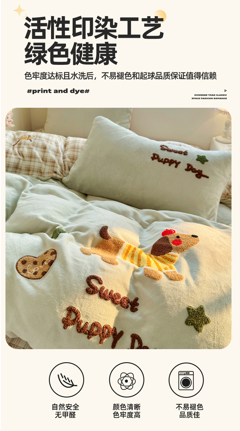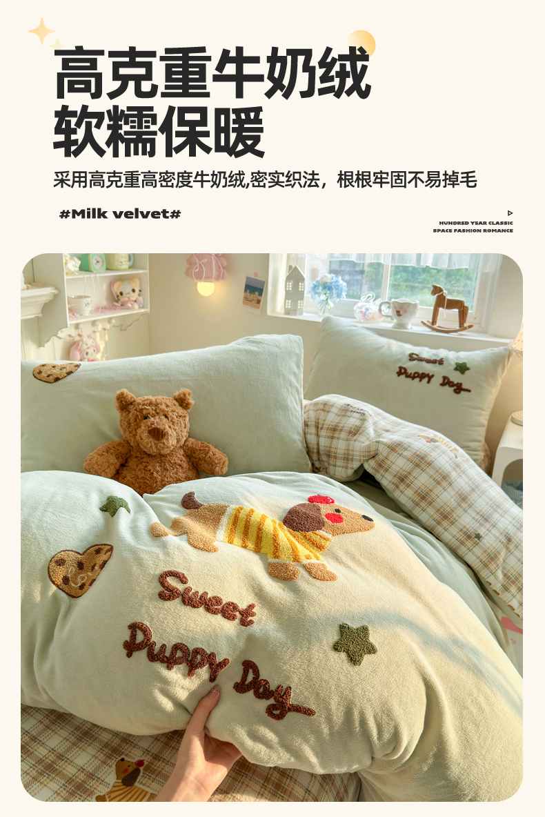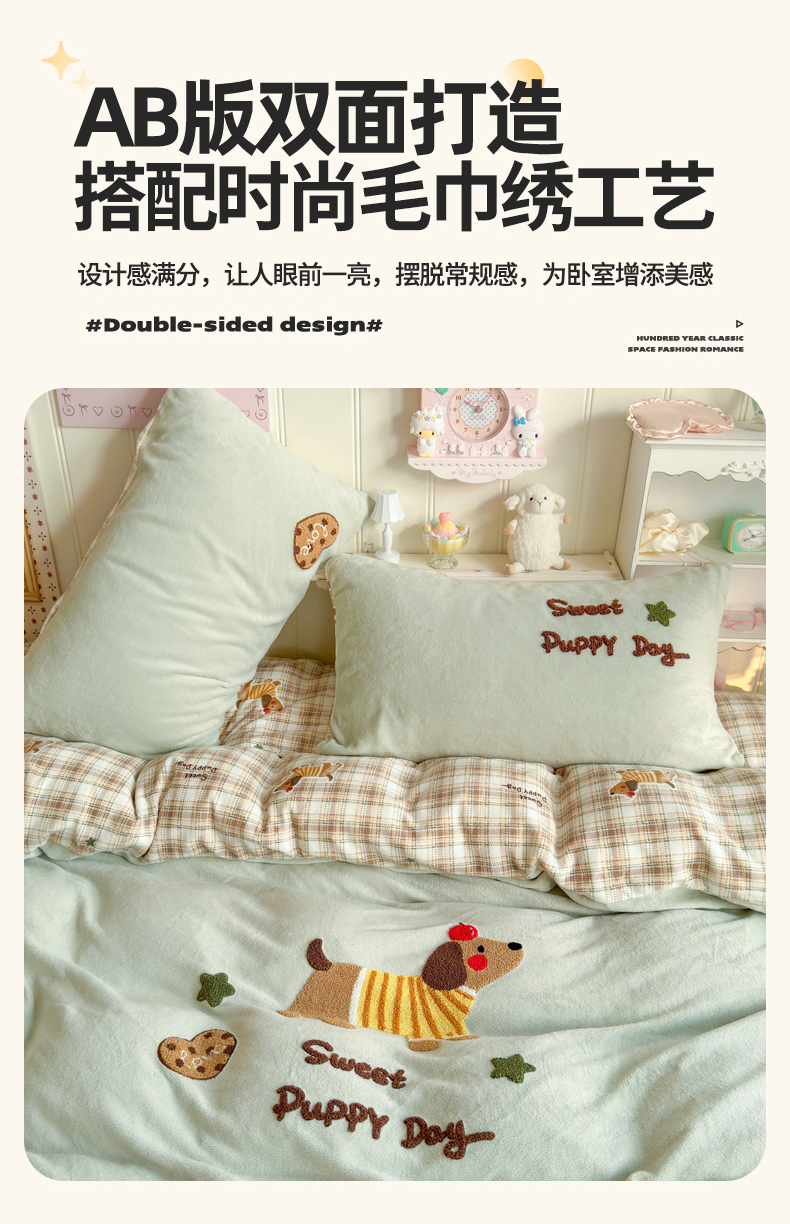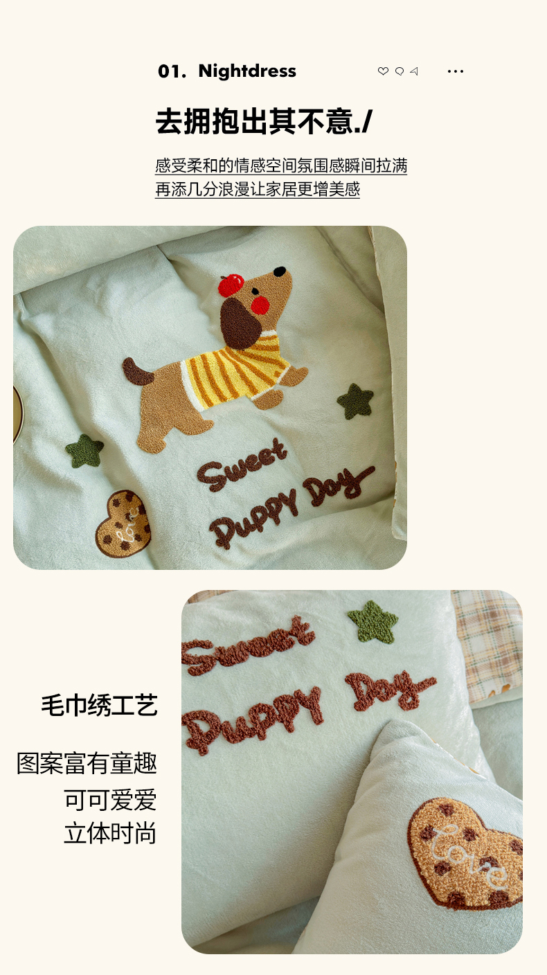 商品名称:Sweet dreams甜梦 2025新款全消光牛奶绒毛巾绣印花四件套 苹果腊肠狗