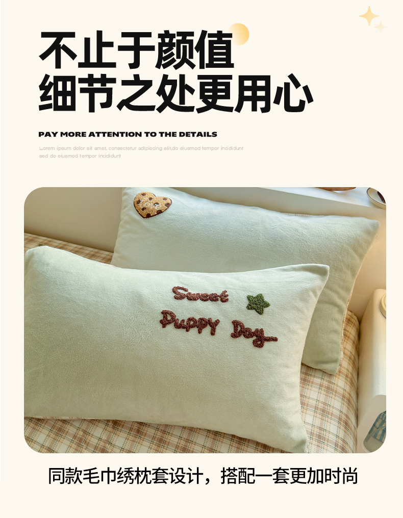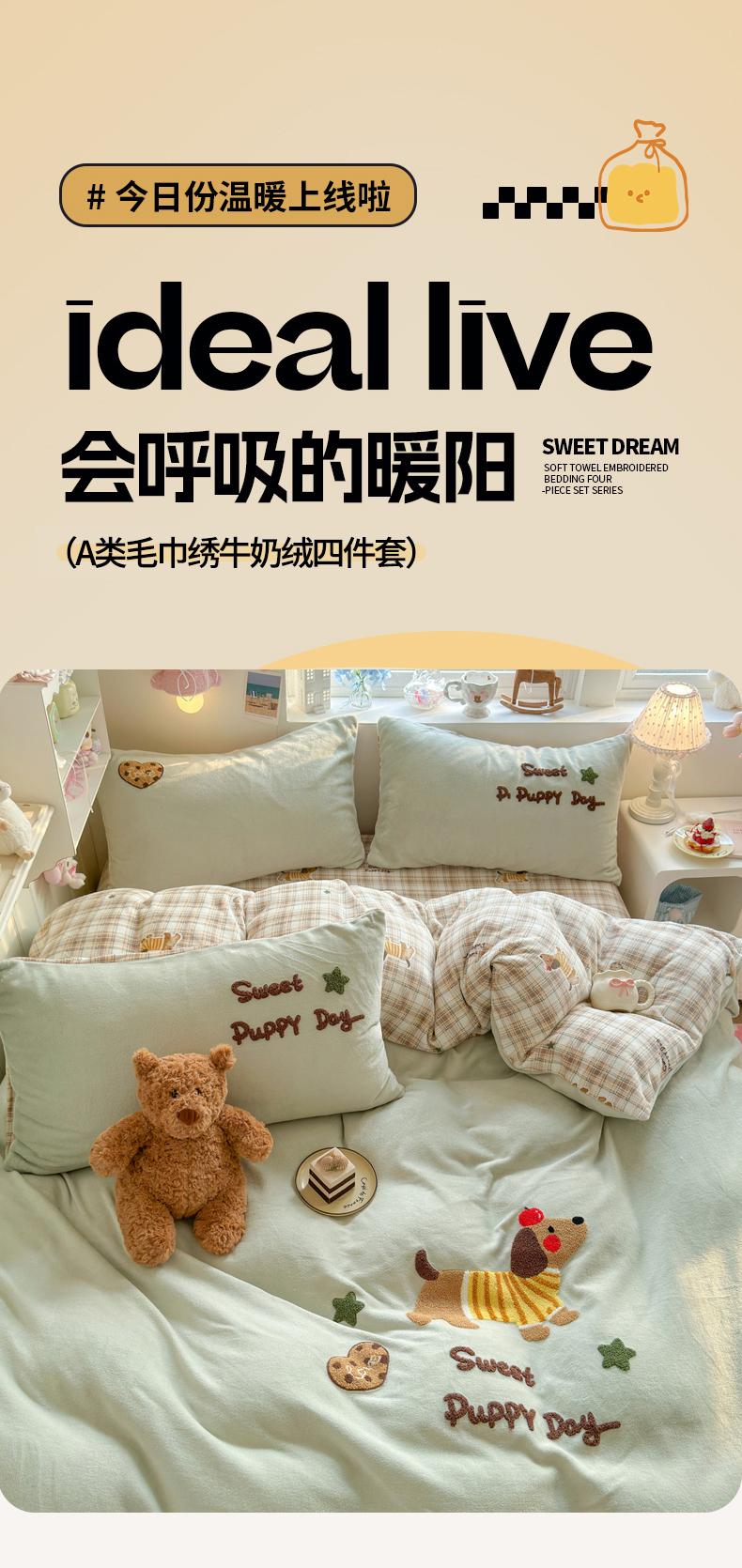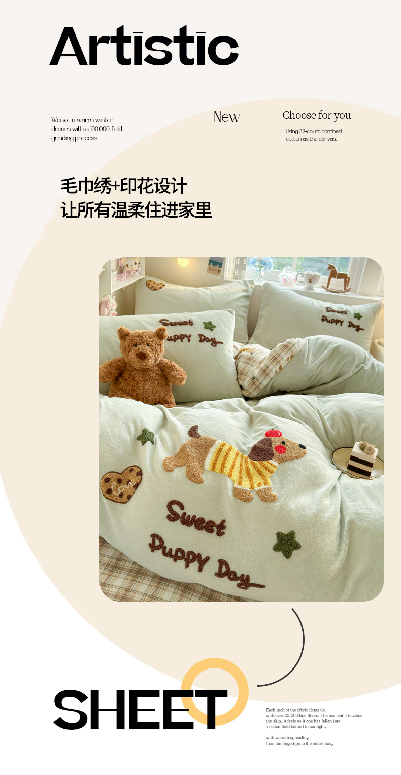 商品名称:Sweet dreams甜梦 2025新款全消光牛奶绒毛巾绣印花四件套 苹果腊肠狗