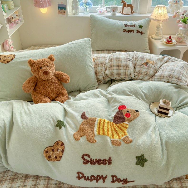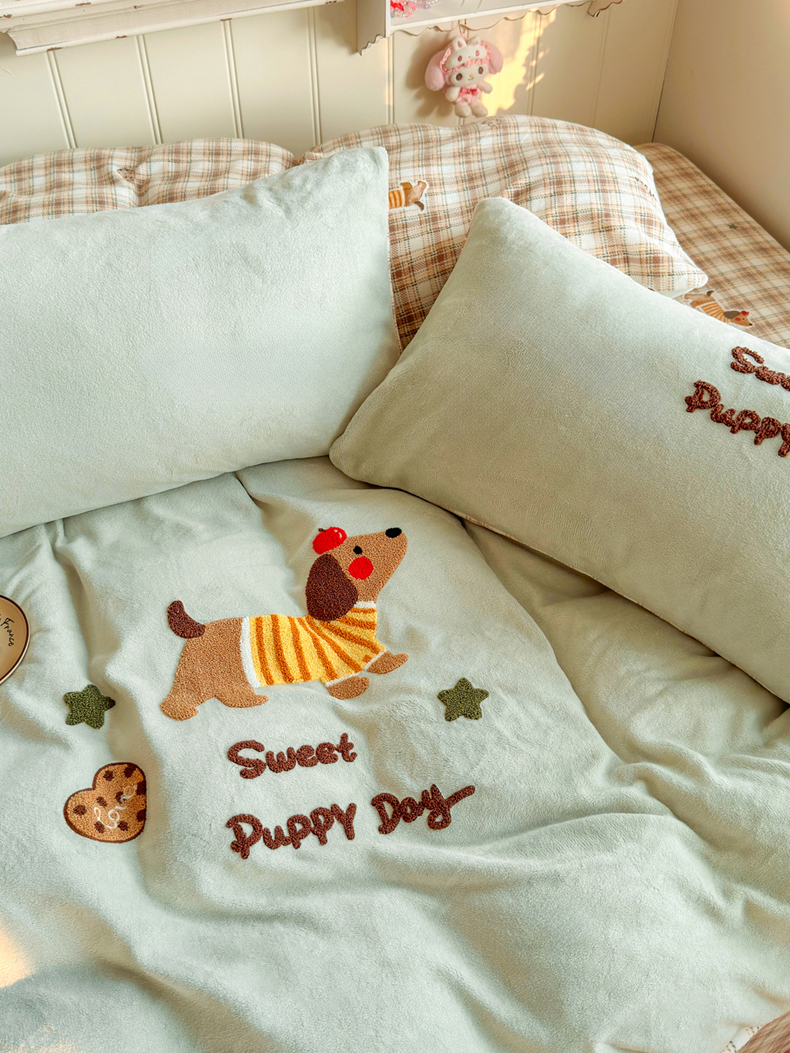 Sweet dreams甜梦 2025新款全消光牛奶绒毛巾绣印花四件套 苹果腊肠狗