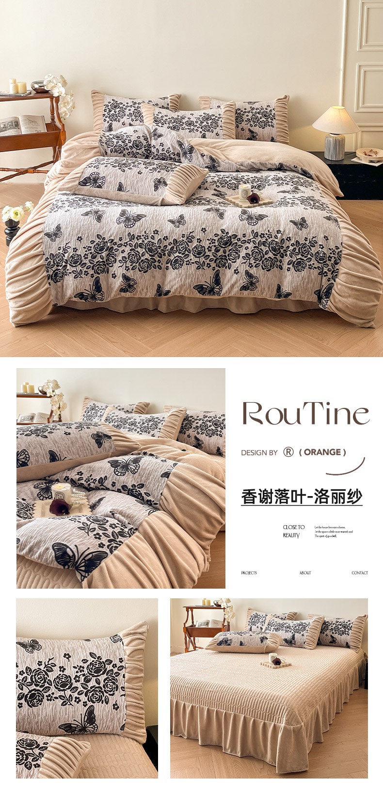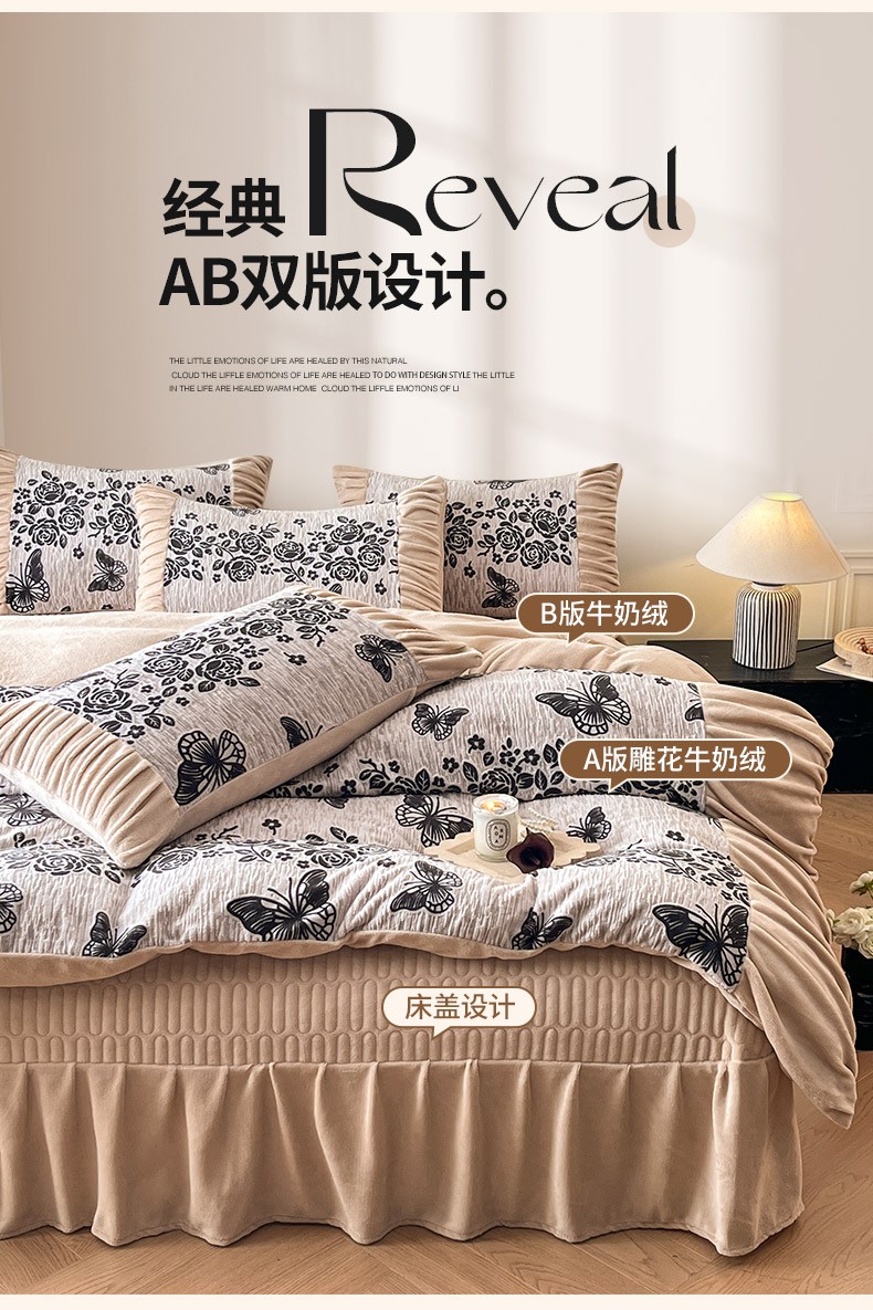 (总)金阳光家纺 2025新款雕花绒色烂牛奶绒法式泡泡袖牛奶绒床单床盖四件套