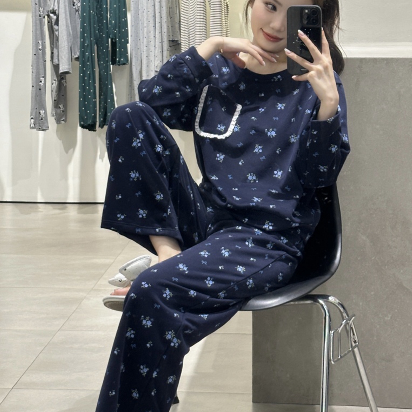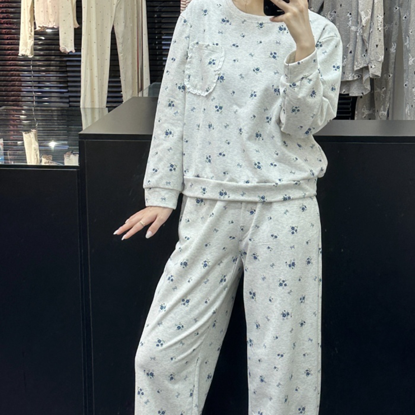 妍景家居生活馆 2025新款卫衣碎花圆领套装 浅灰