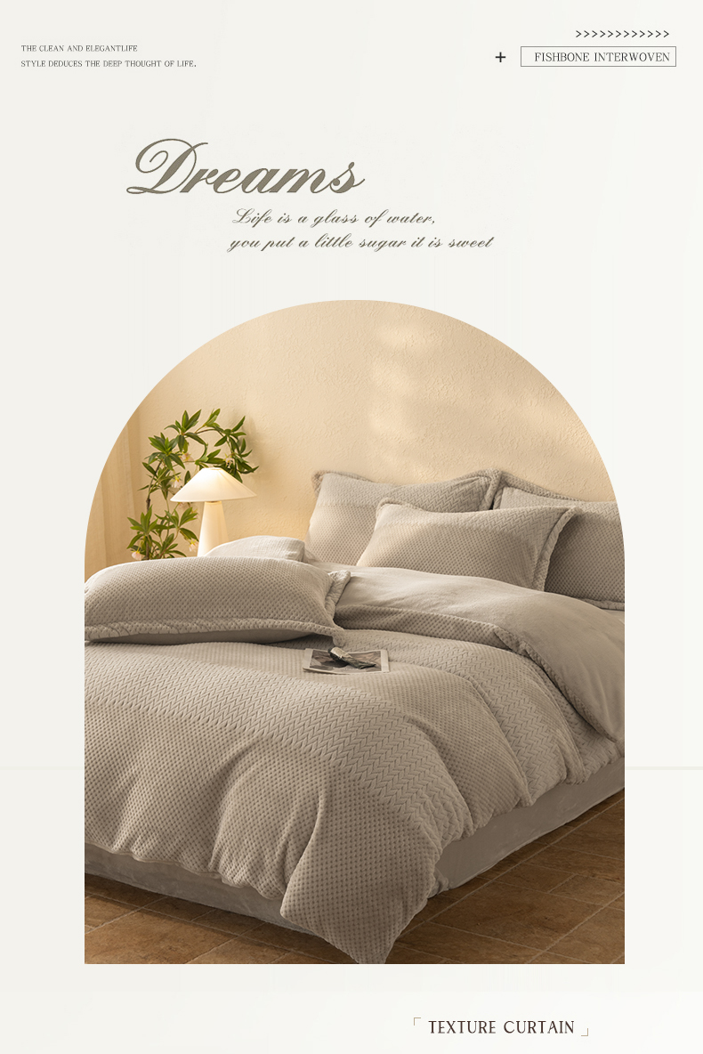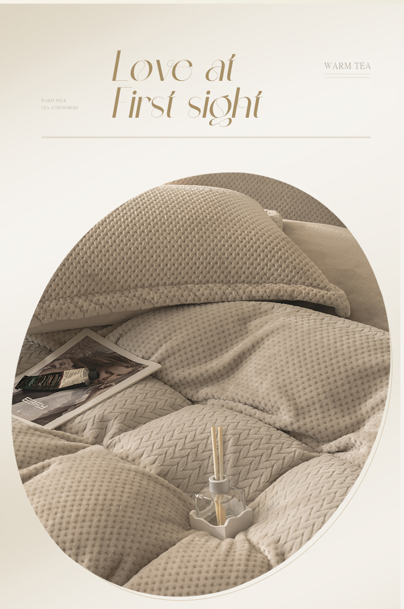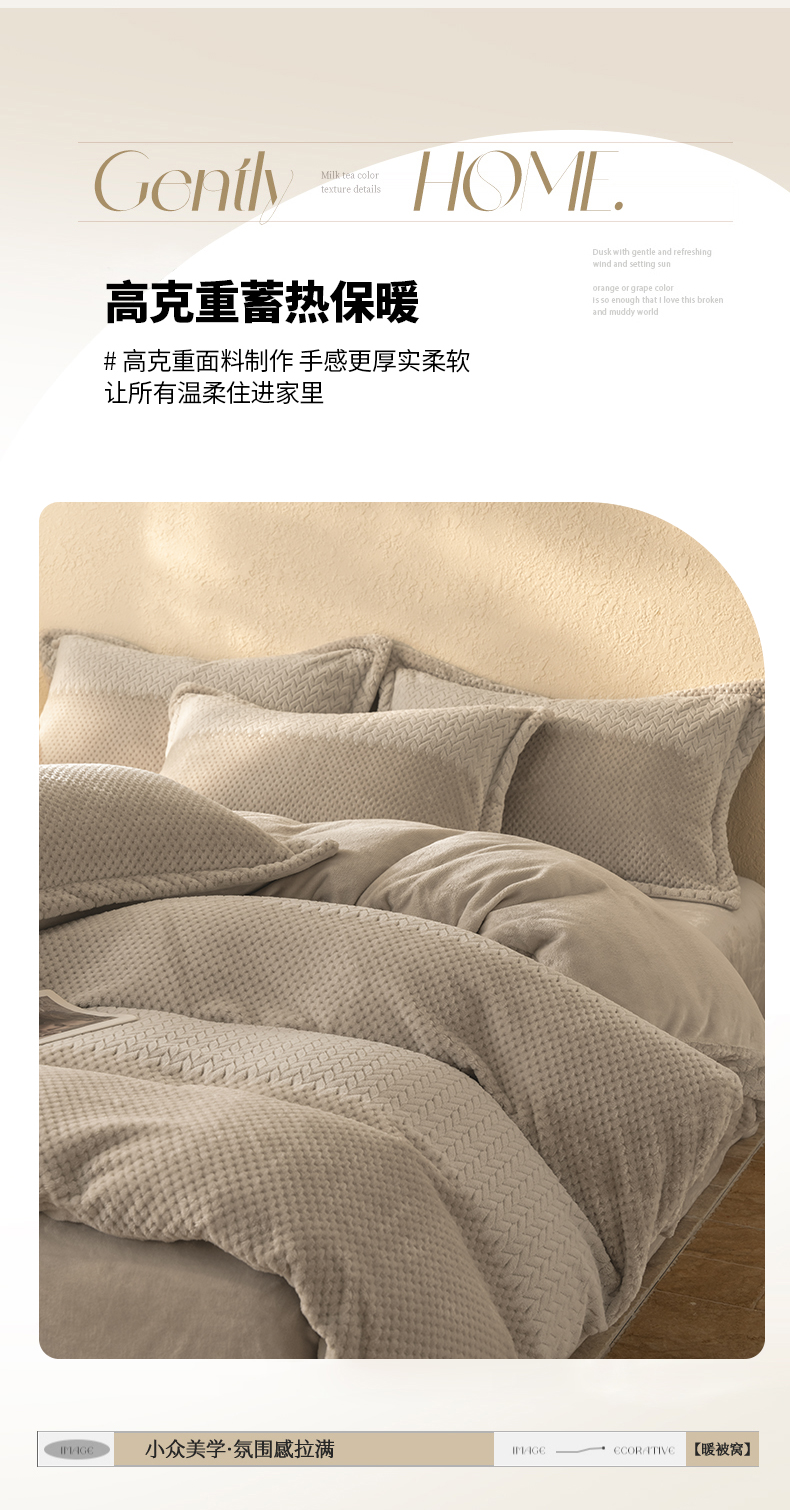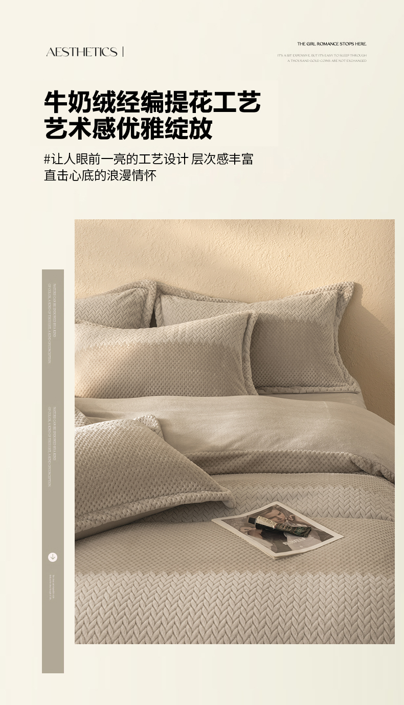 当前位置: 91家纺网 > 商品网购 > 床品套件 > 四件套 > 牛奶绒四件套 > 源舍家纺 2025新款色织拼色编织提花轻奢牛奶绒四件套(场景二) 织锦-咖韵