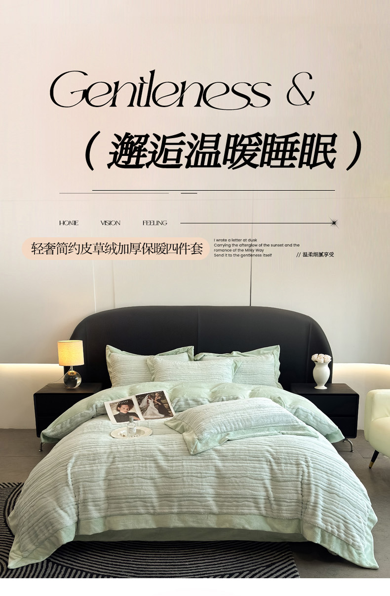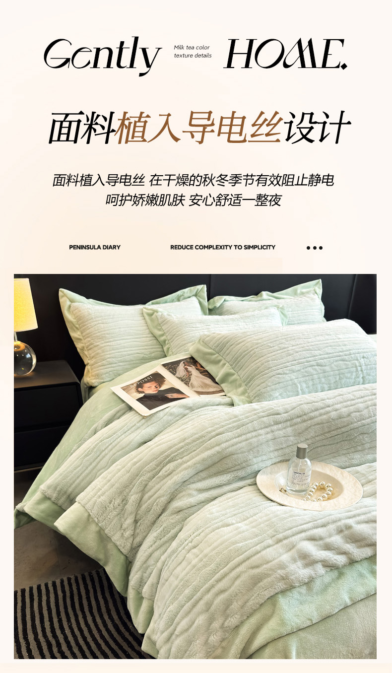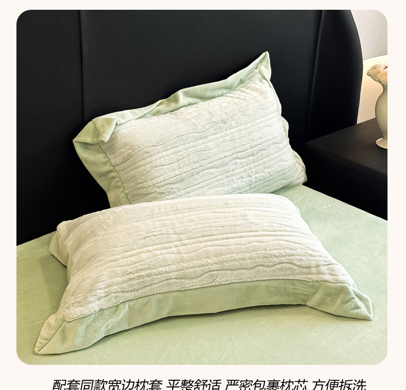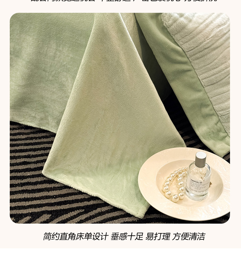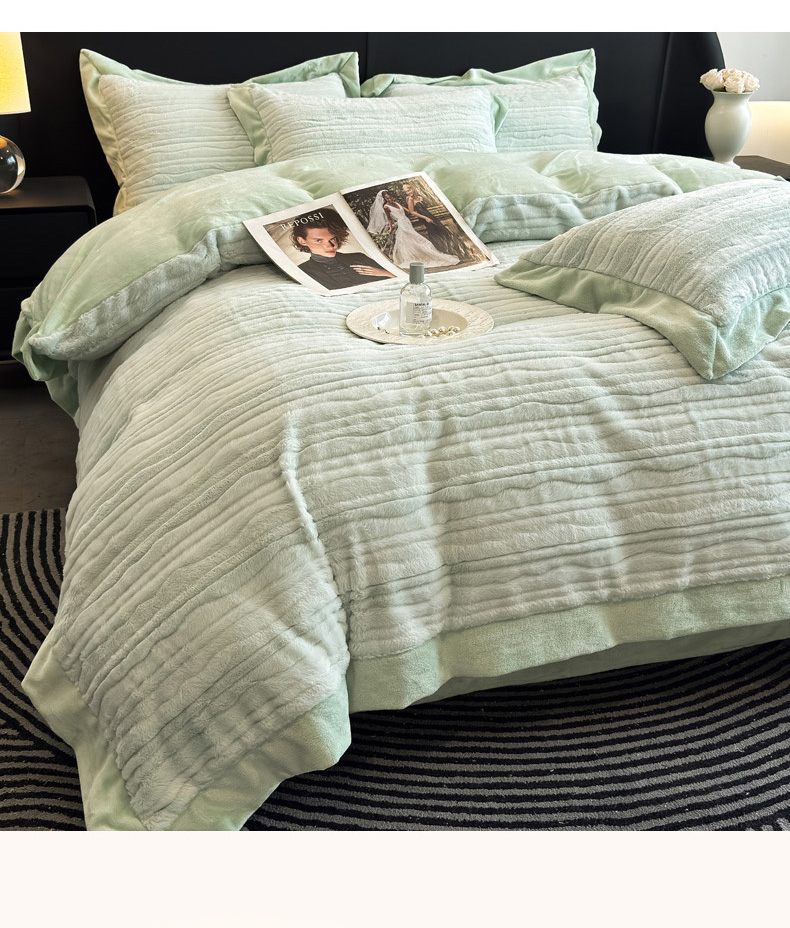 商品名称:九花鹿 2025新款380克宽边丹麦皮草绒四件套-波纹系列 波纹-清新绿