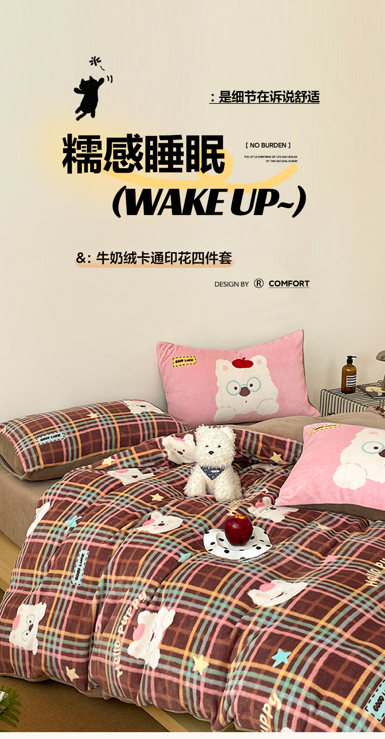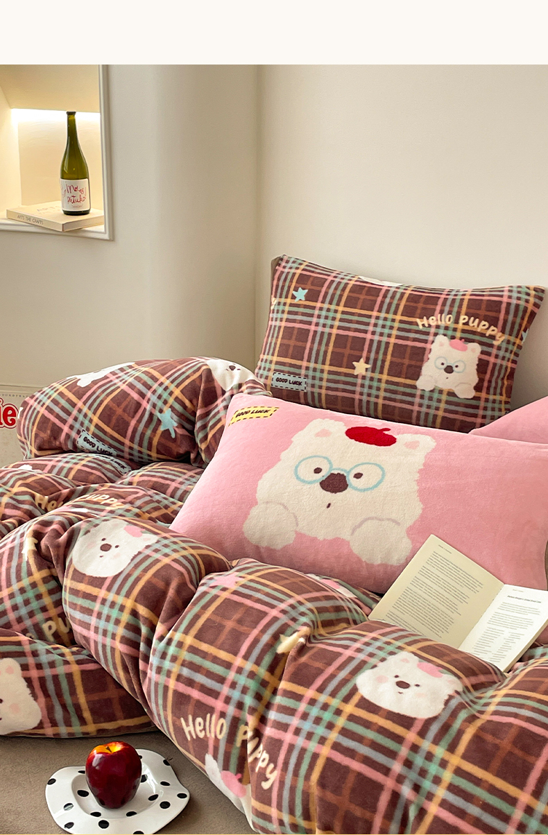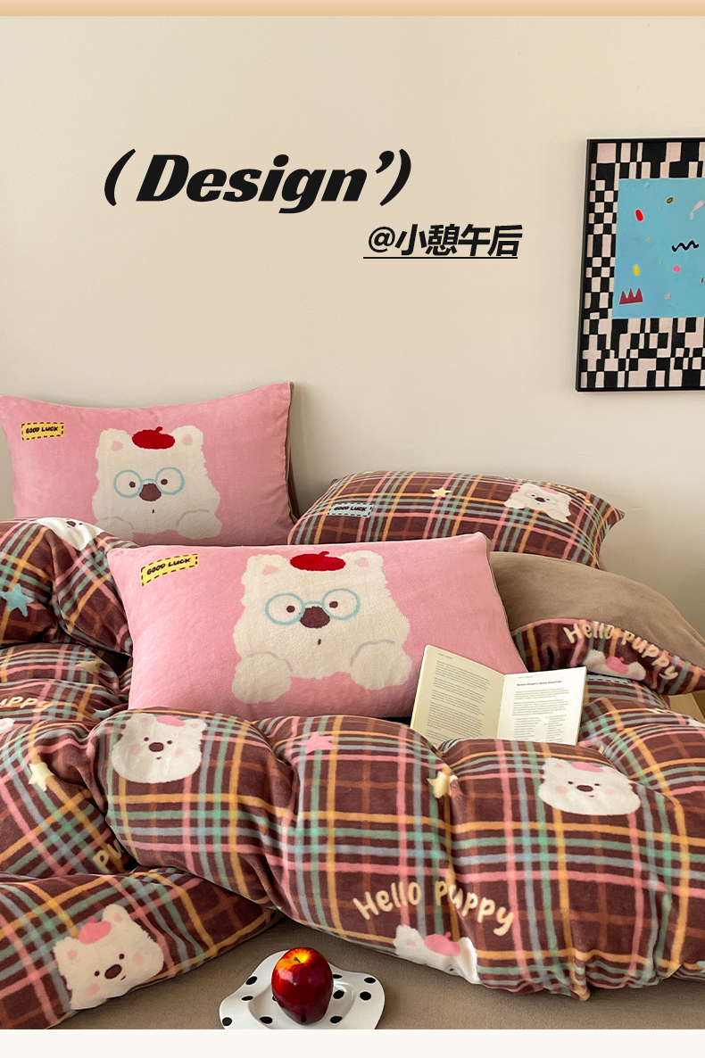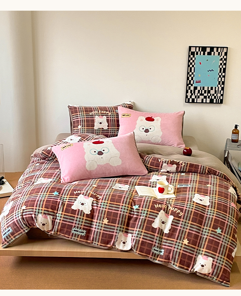 当前位置: 91家纺网 > 商品网购 > 床品套件 > 四件套 > 牛奶绒四件套 > 摩妮卡 2025新款牛奶绒枕套混搭卡通复古四件套 粉帽小狗