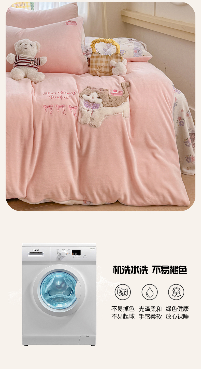 商品名称:润肤居 2025新款卡通贴布绣牛奶绒系列四件套 美美猫