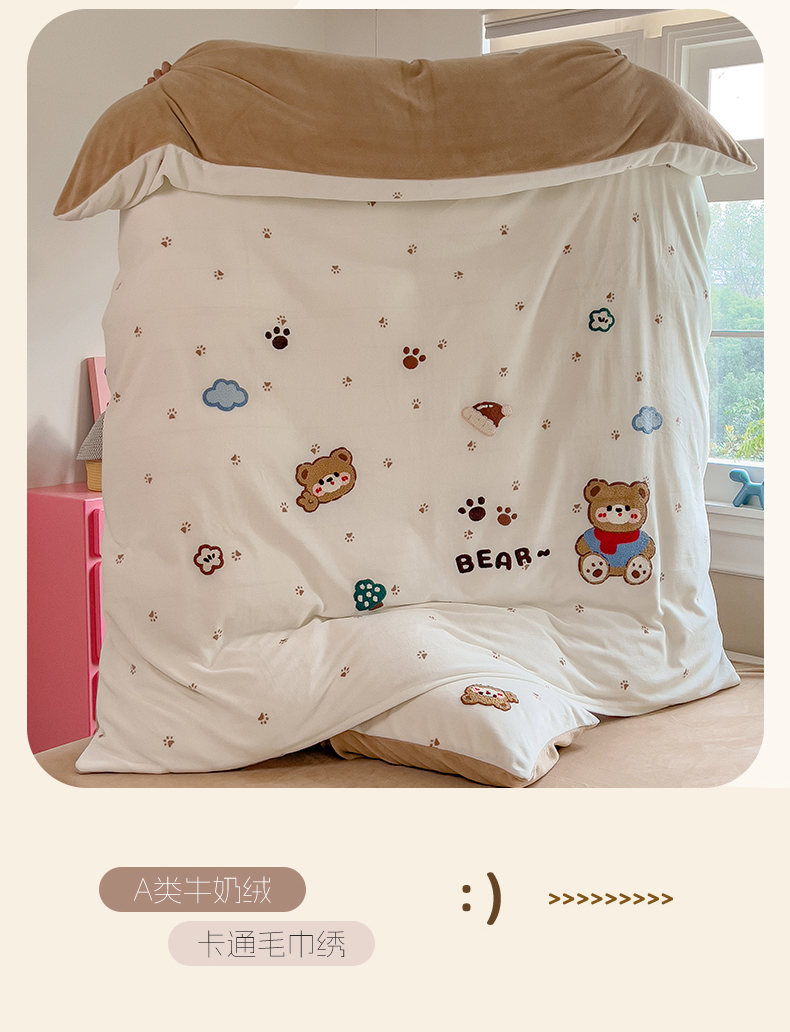 (总)兄弟坊 2025新款A类牛奶绒印花毛巾绣四件套,毛巾绣-暖暖熊,毛巾绣-粉小兔,毛巾绣-绿森林,毛巾绣-马戏团,毛巾绣-小花园