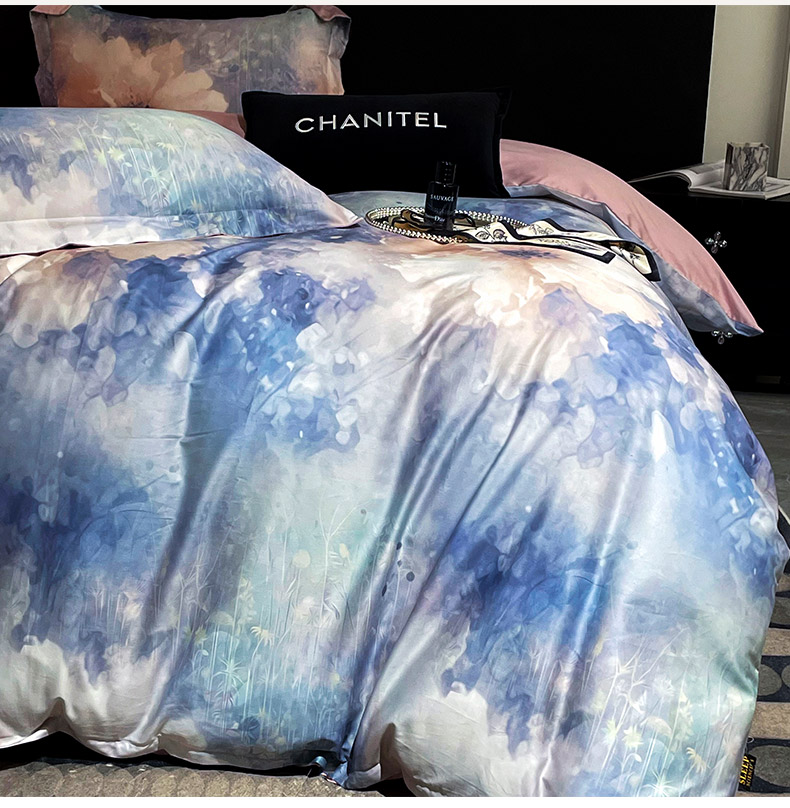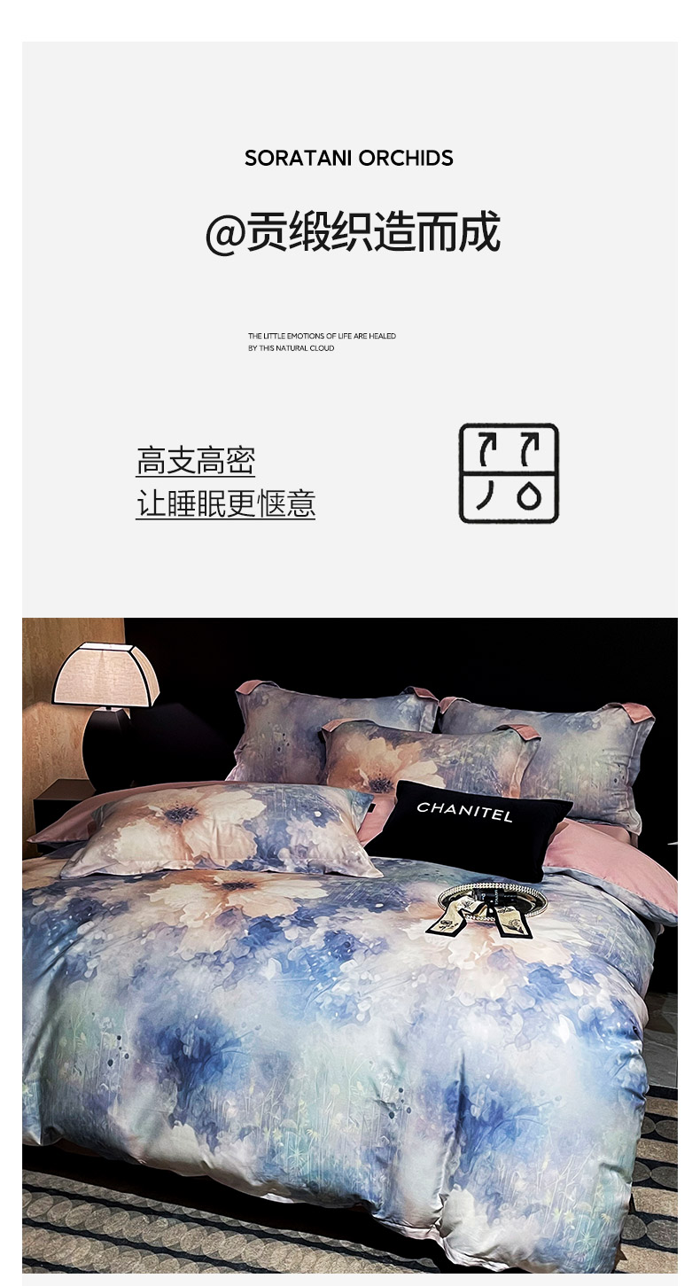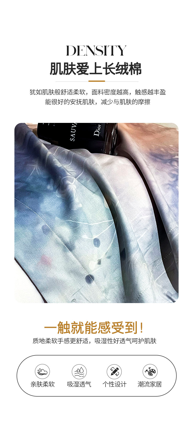 大渔生活 2025新款贡缎长绒棉高品数码印花四件套 云花漾蓝