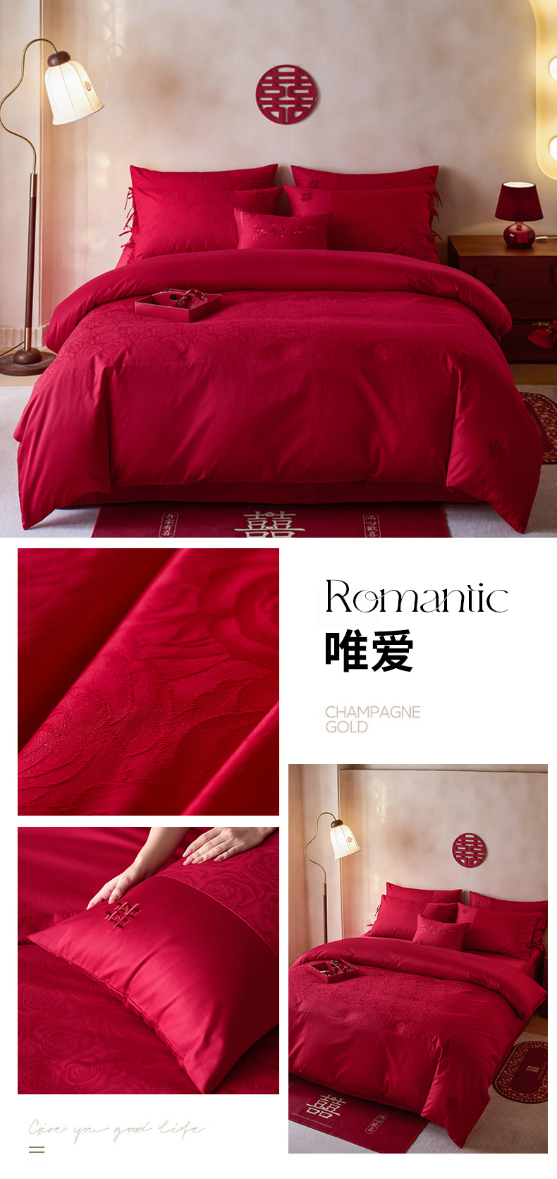 (总)红番天婚庆 2025新款小红书热卖款仿丝棉提花时尚婚庆系列四件套多件套,唯爱,禧妆
