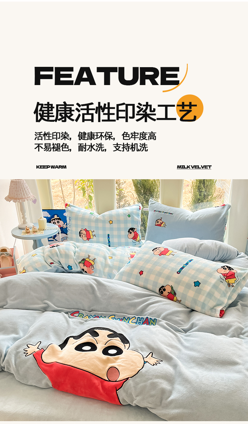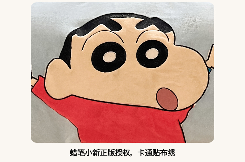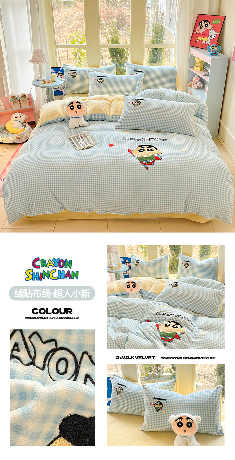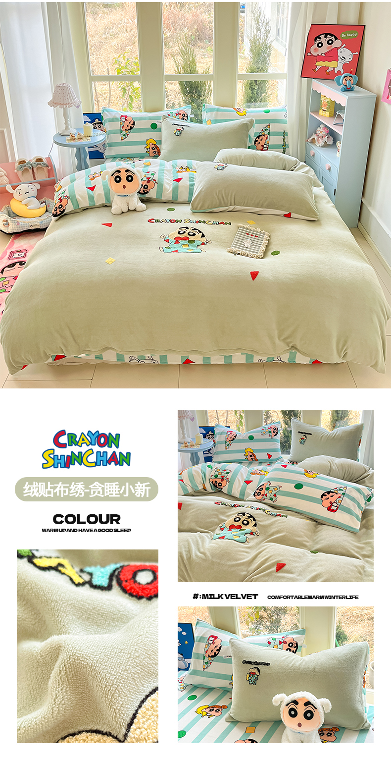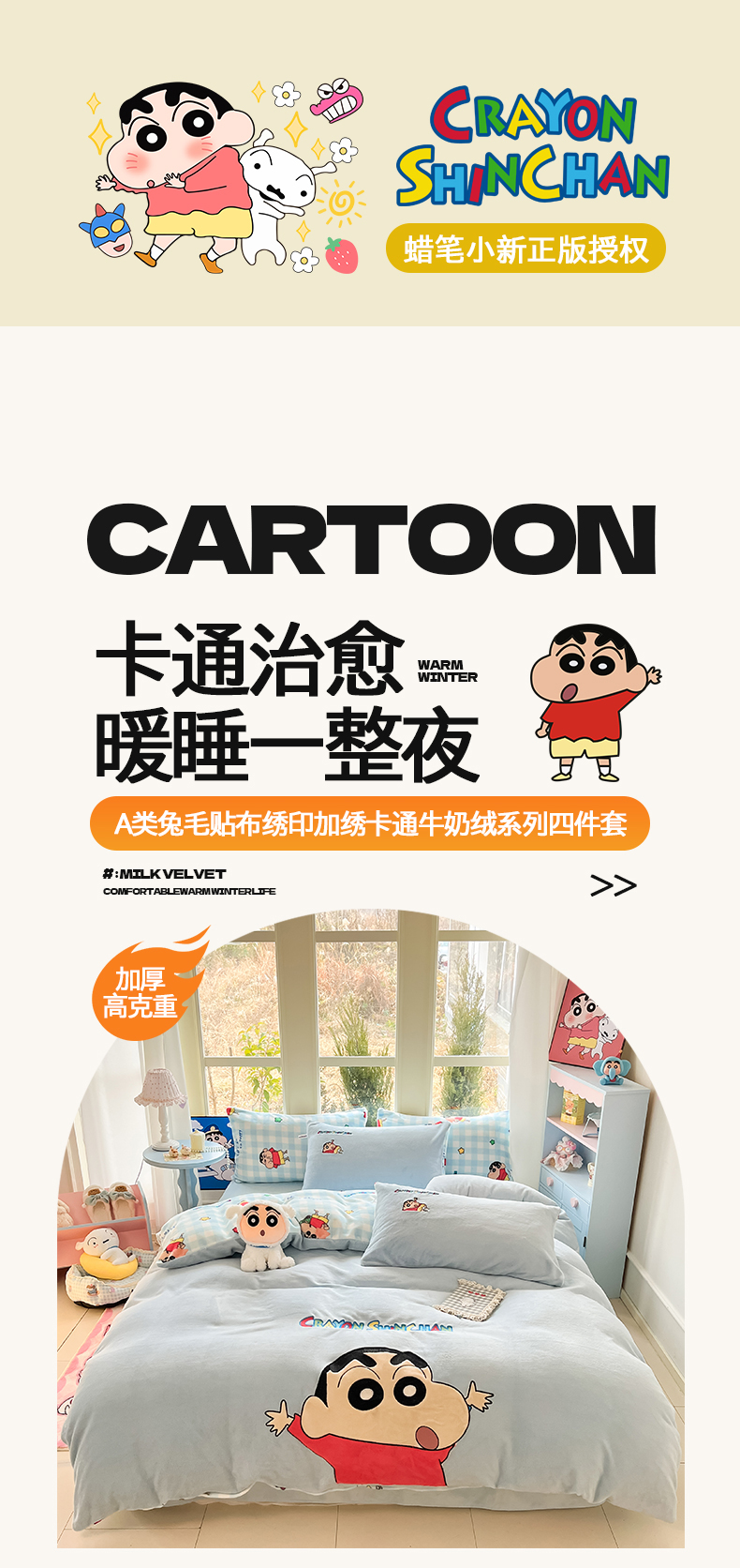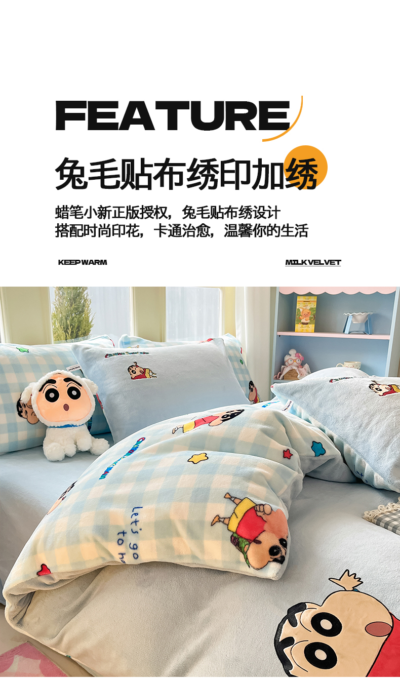 商品名称:桃子家居 2026新款A类蜡笔小新授权兔毛贴布绣毛巾绣印加绣卡通加厚牛奶绒系列四件套 绒贴布绣-快乐小新