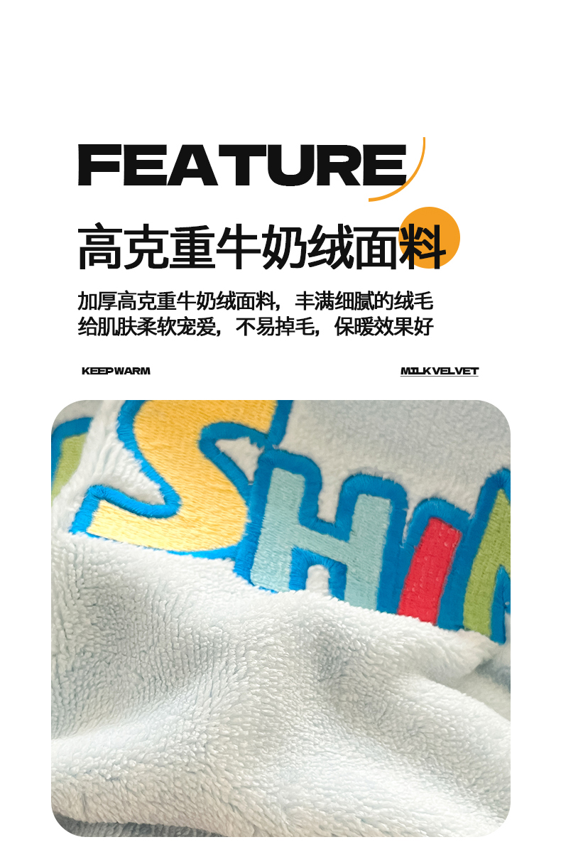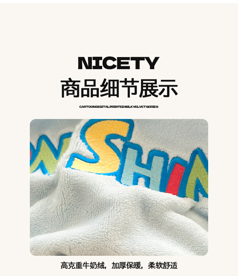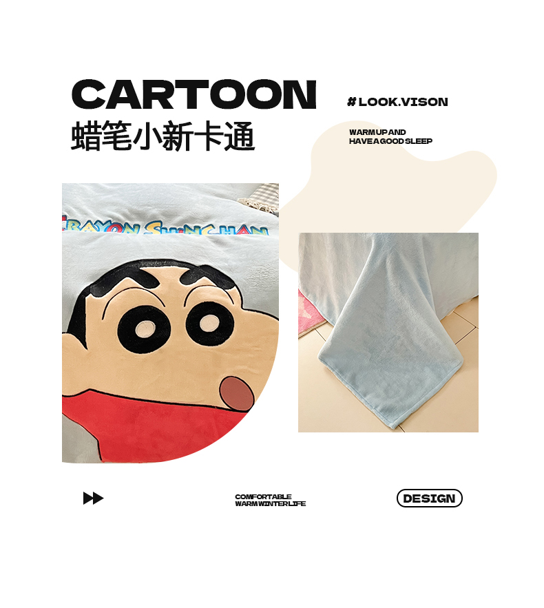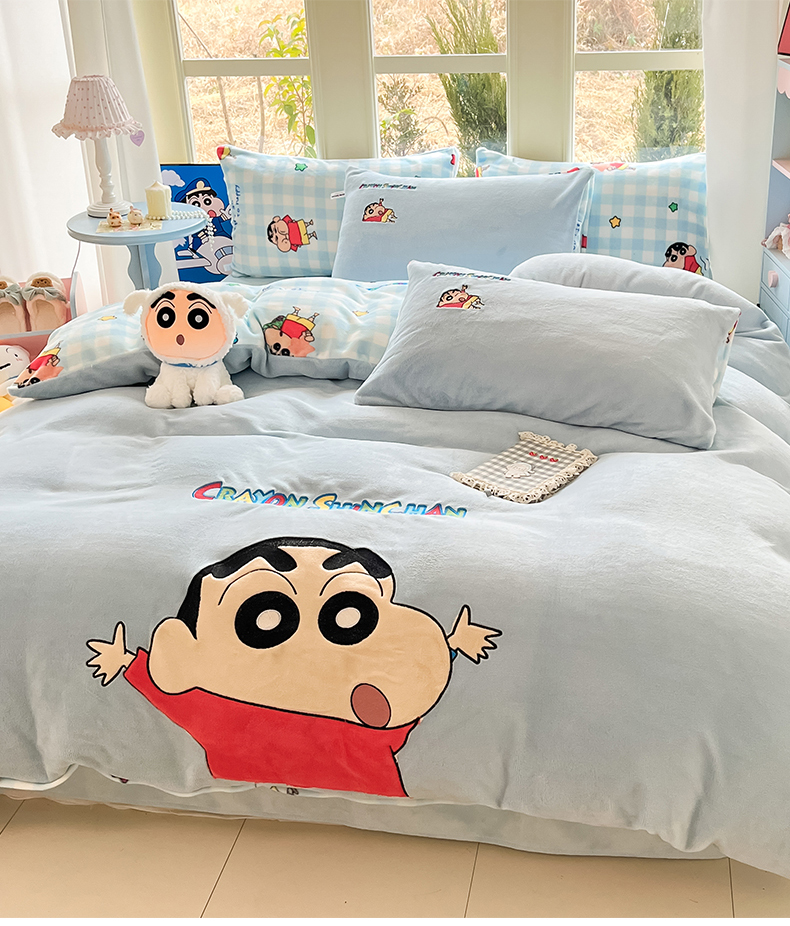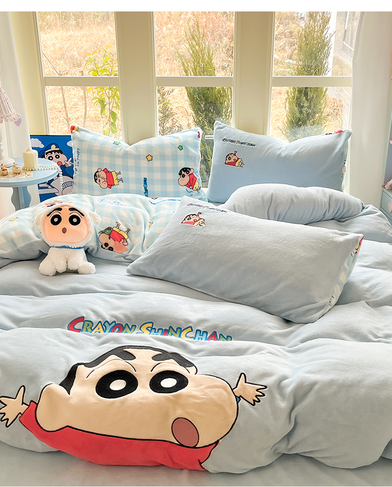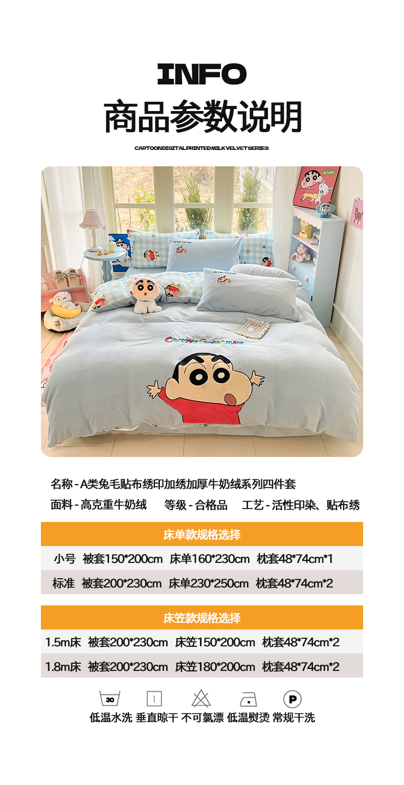 商品名称:桃子家居 2026新款A类蜡笔小新授权兔毛贴布绣毛巾绣印加绣卡通加厚牛奶绒系列四件套 绒贴布绣-快乐小新