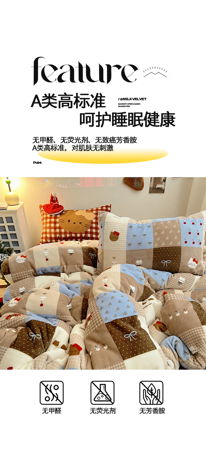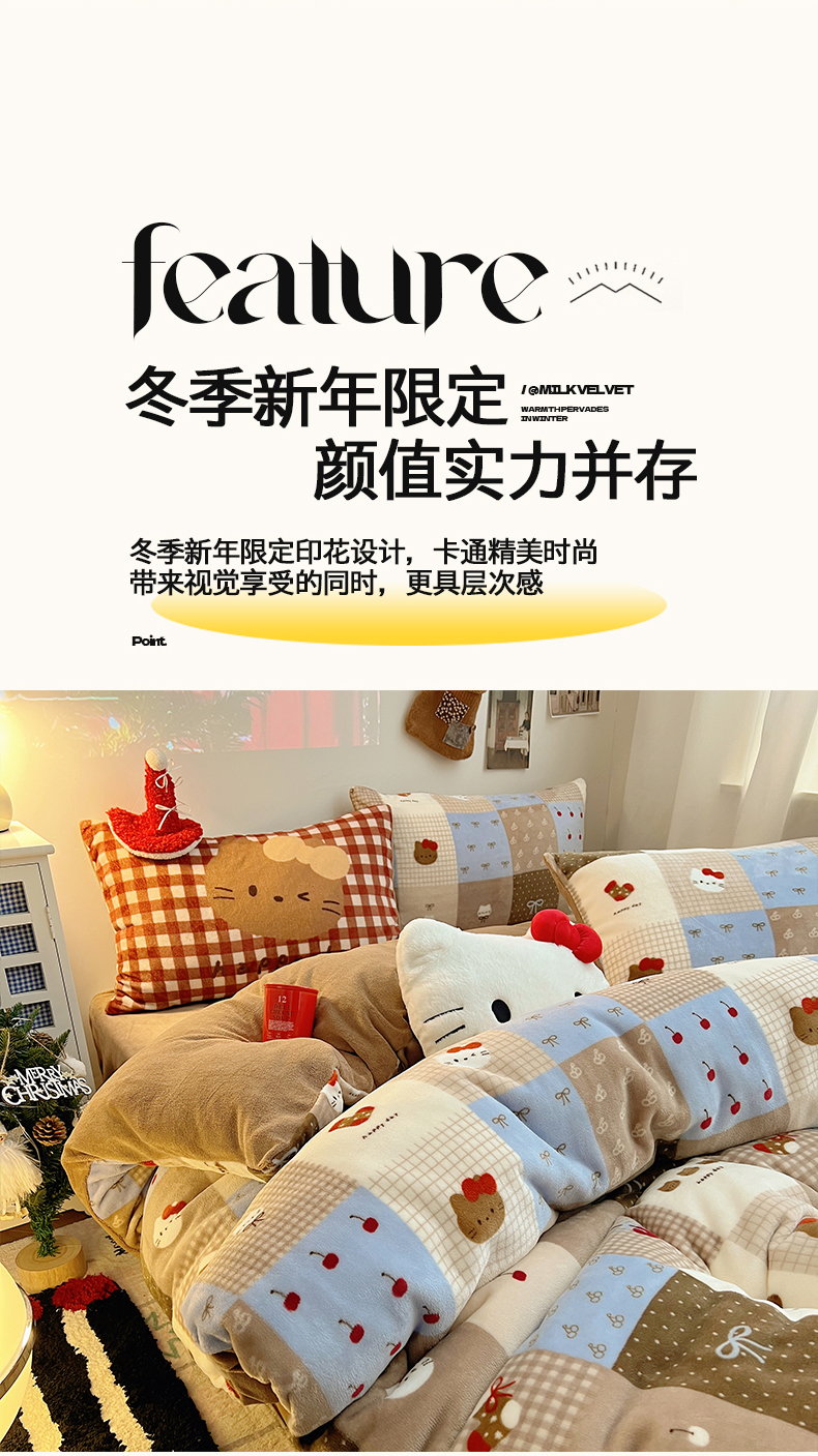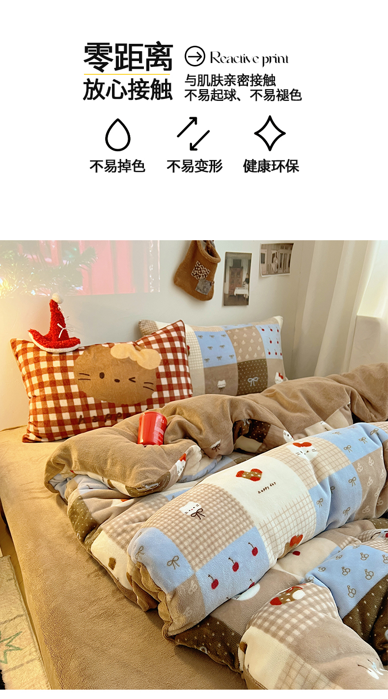 商品名称:桃子家居 2026新款A类数码印花混搭冬季新年限定猫咪小马加厚牛奶绒四件套 绒-樱桃猫猫咖
