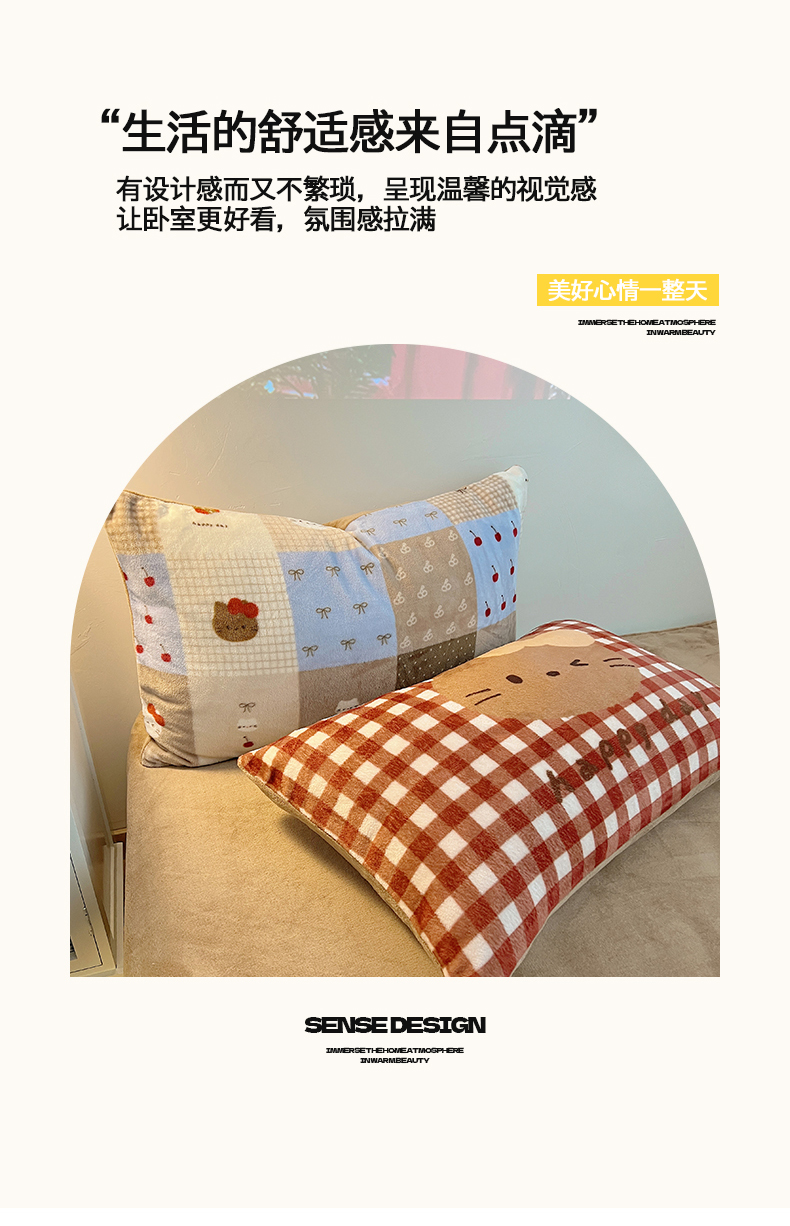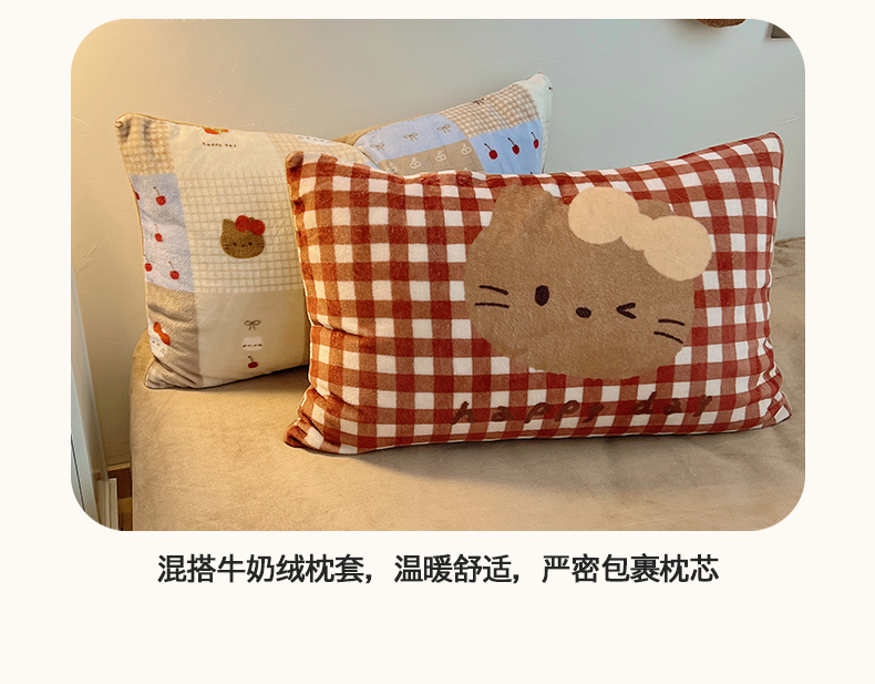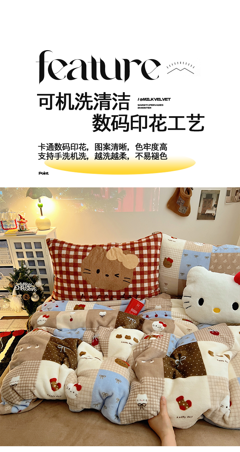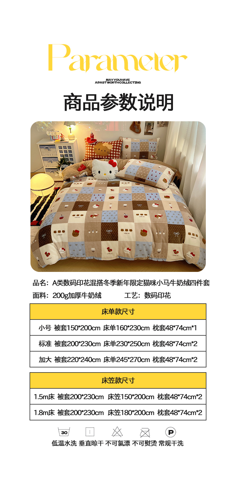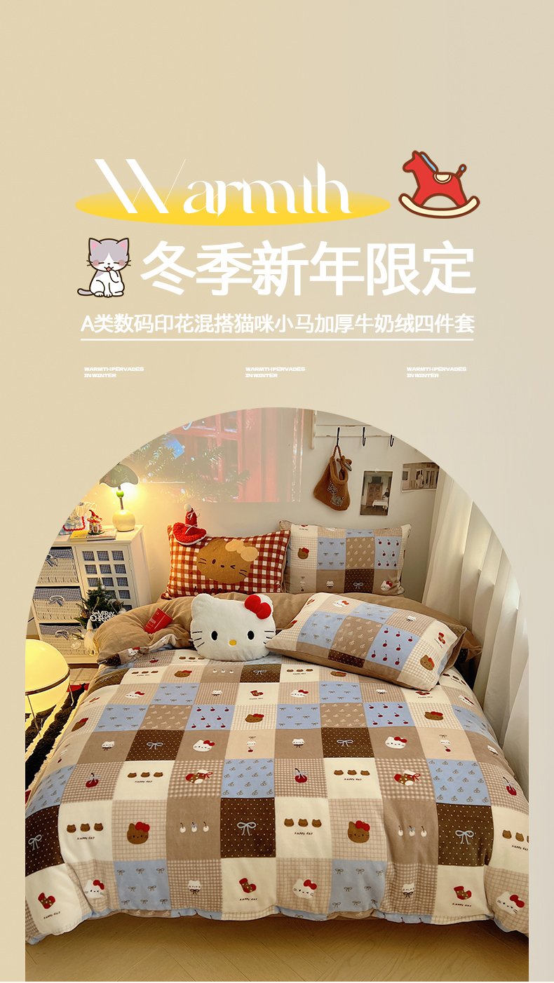 桃子家居 2026新款A类数码印花混搭冬季新年限定猫咪小马加厚牛奶绒四件套 绒-樱桃猫猫咖
