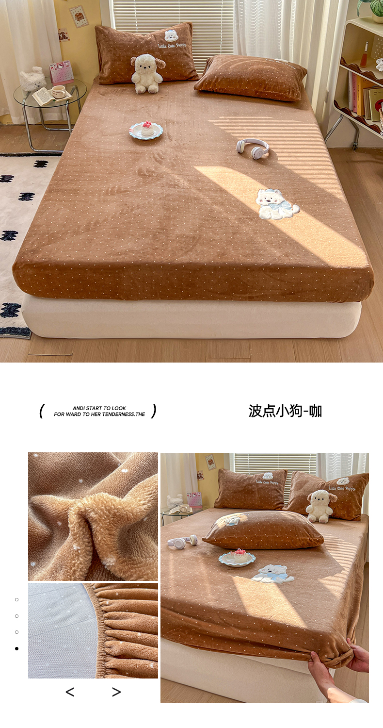 • 91家纺网 家纺一手货源 找家纺 十里居 2026新款韩系牛奶绒兔毛贴布绣床笠三件套四件套 波点小狗咖