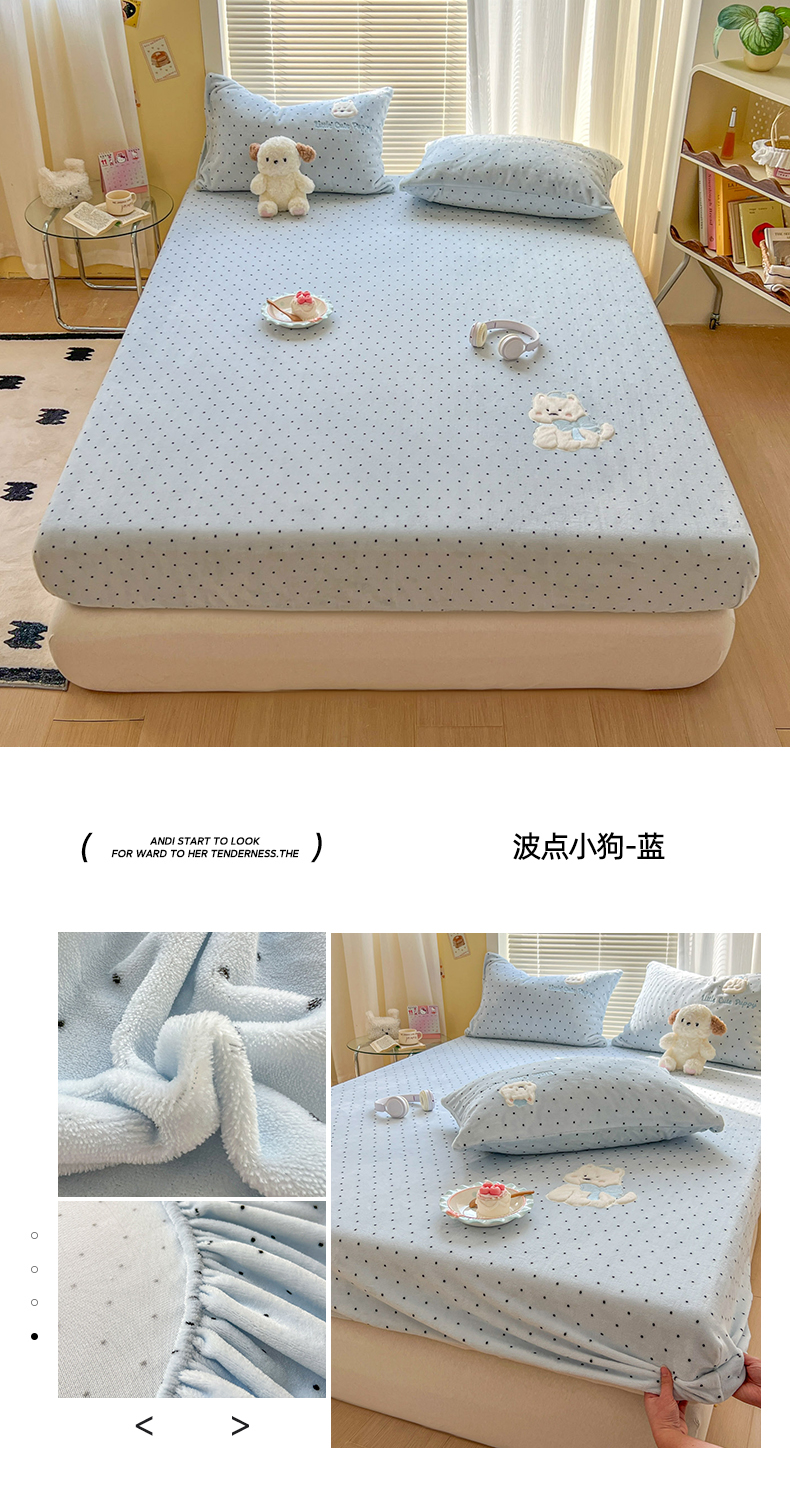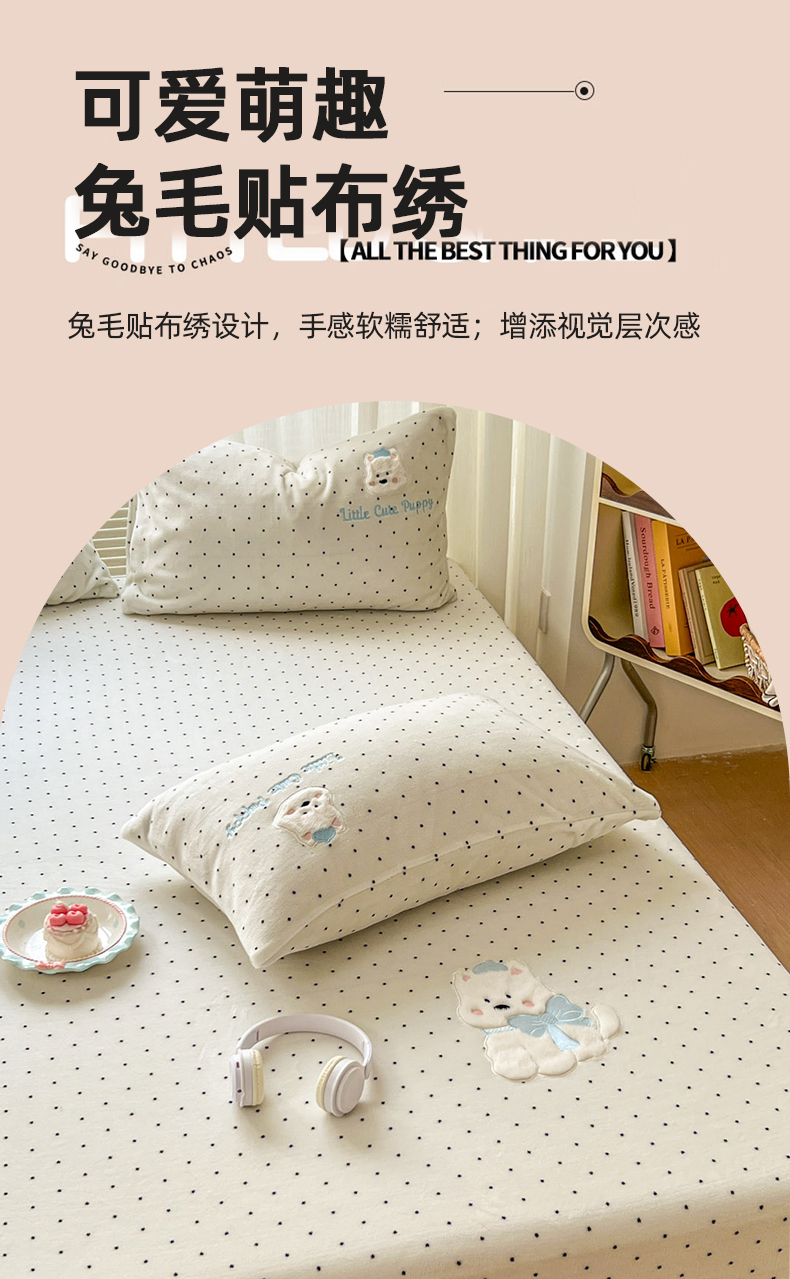 (总)十里居 2026新款韩系牛奶绒兔毛贴布绣床笠三件套四件套,波点小狗蓝,波点小狗白,波点小狗粉,波点小狗咖