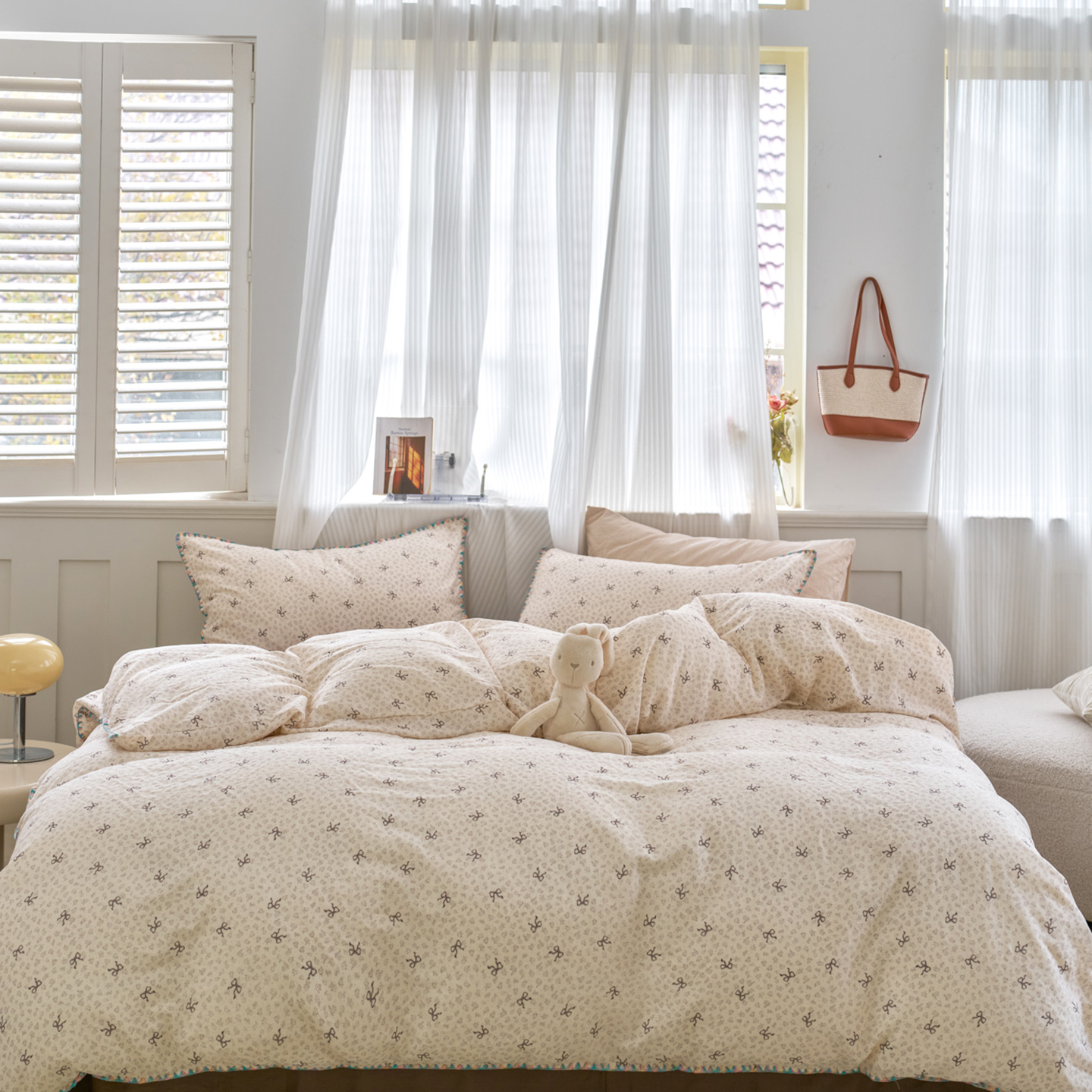 洋铭区(原狠狠爱) 2026新款春季全棉彩边双层纱四件套 奶茶蝴蝶结