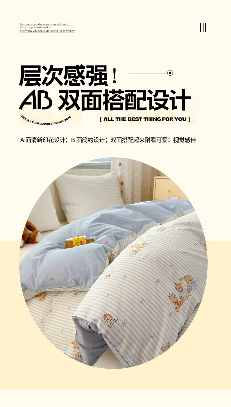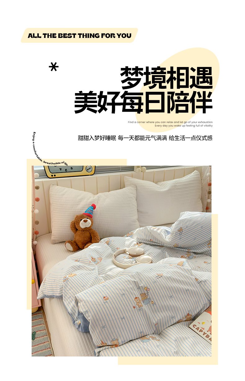 • 91家纺网 家纺一手货源 找家纺 梵克保罗 2026春夏新款ins小清新40支全棉13372四件套学生三件套单被套单枕套系列-第二批(单被套) 幸福小熊