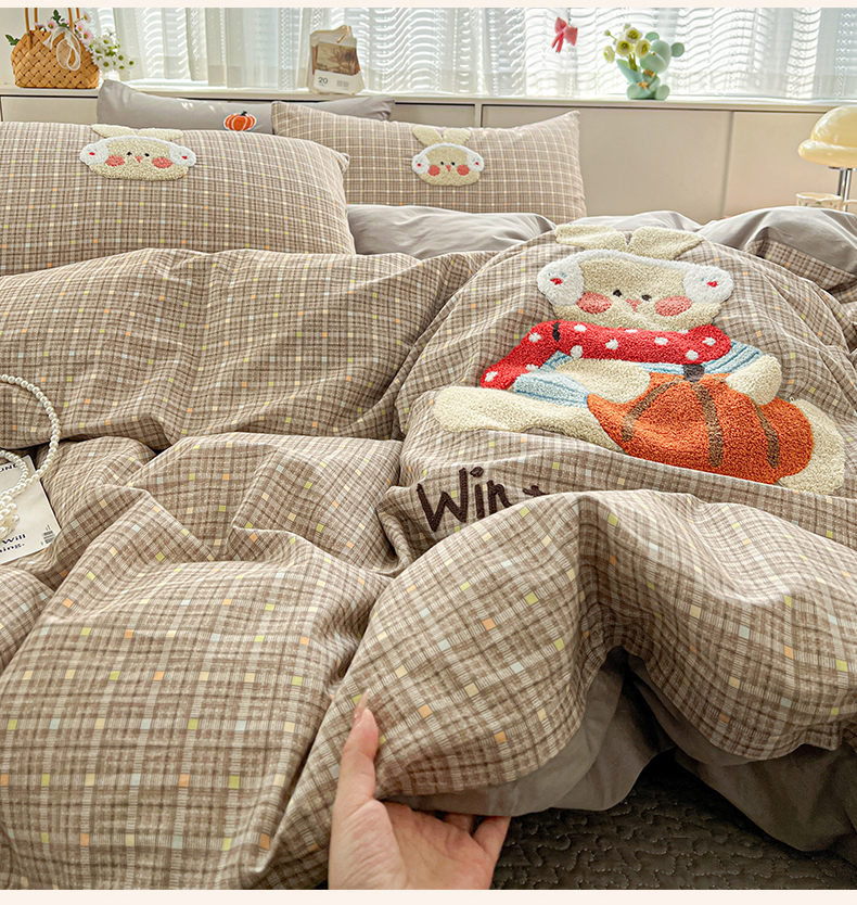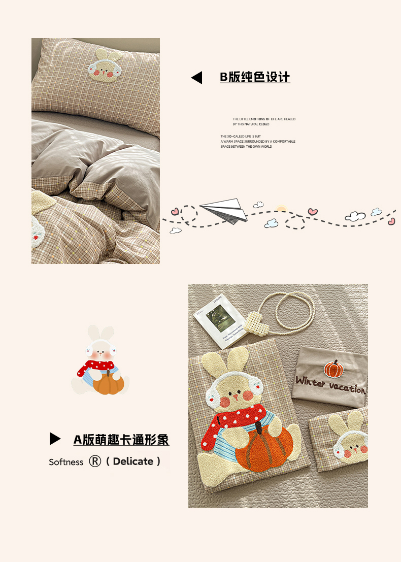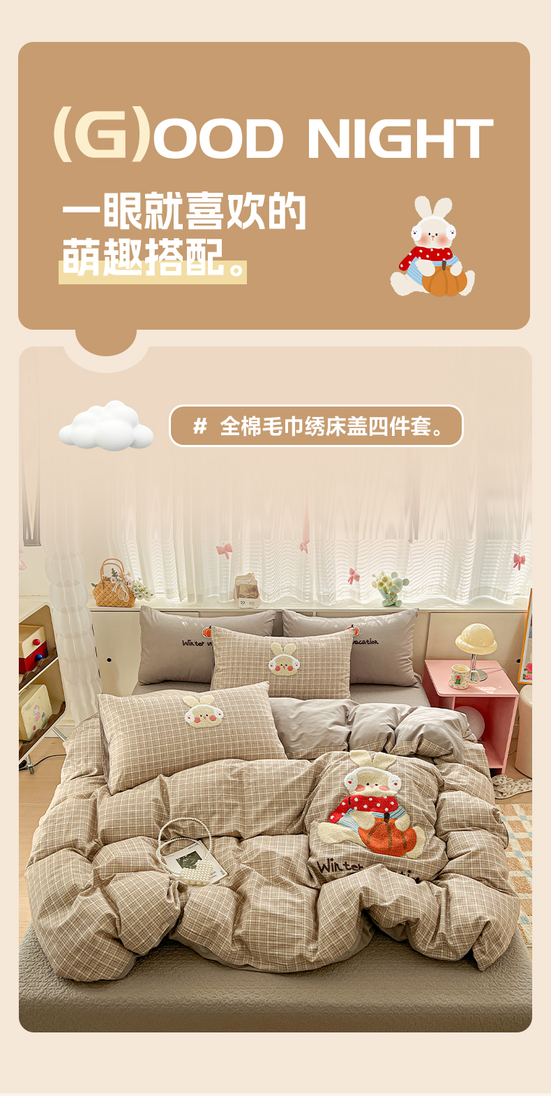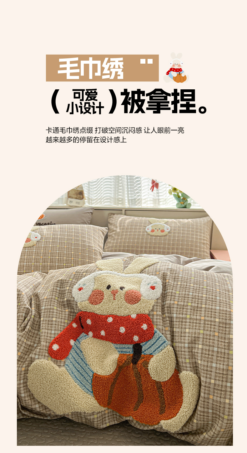 鑫喜莱家纺 2026新款全棉纯棉13372床盖款原创毛巾绣四件套 南瓜小兔
