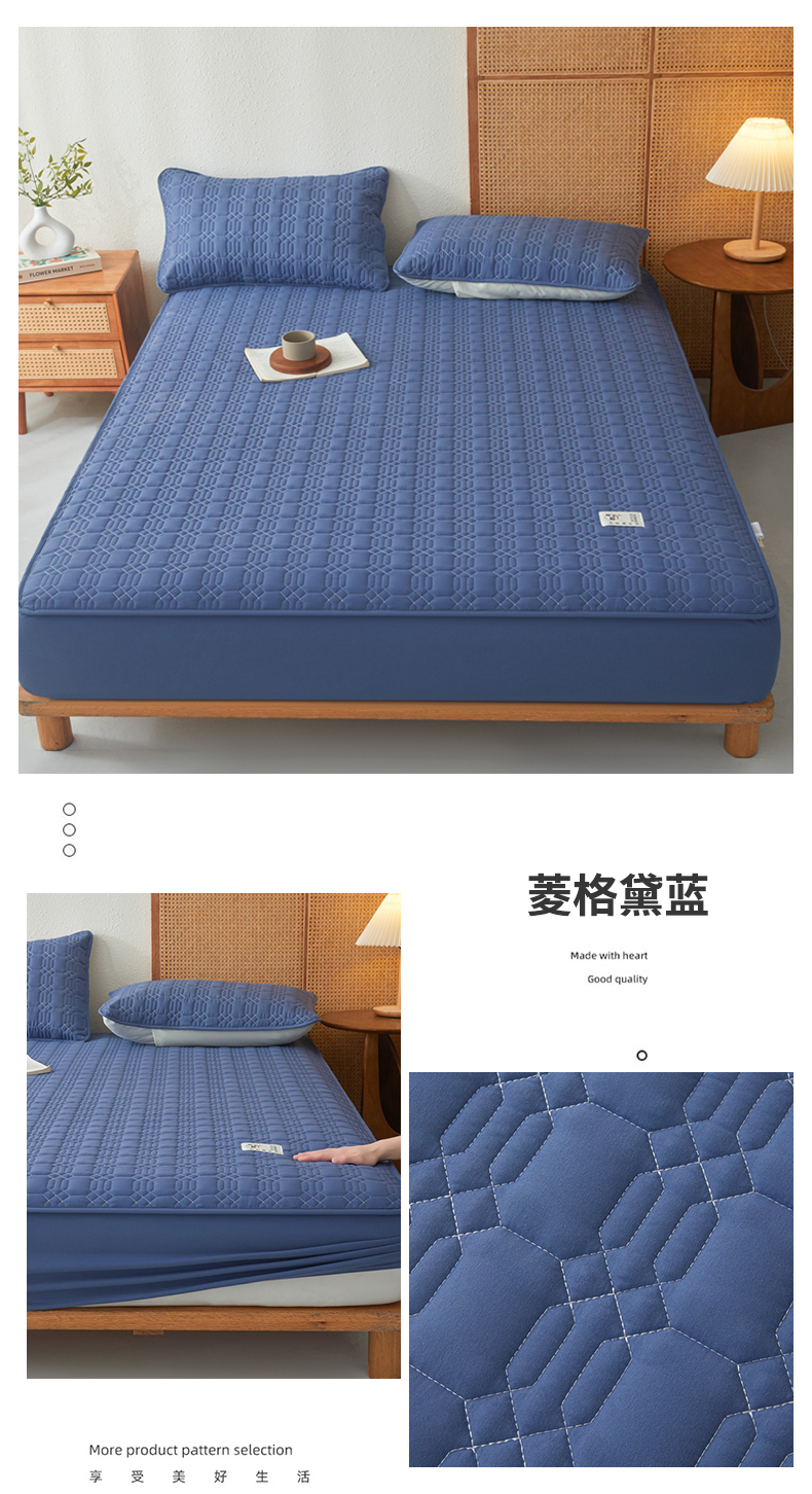 • 91家纺网 家纺一手货源 找家纺 邵依家纺 2026新款原棉防水床笠系列 爱心黛蓝