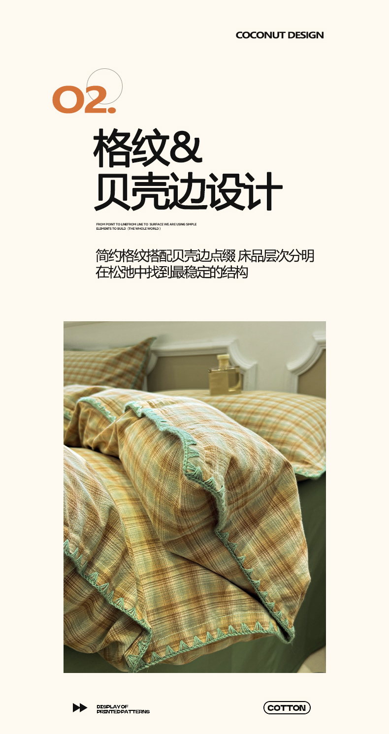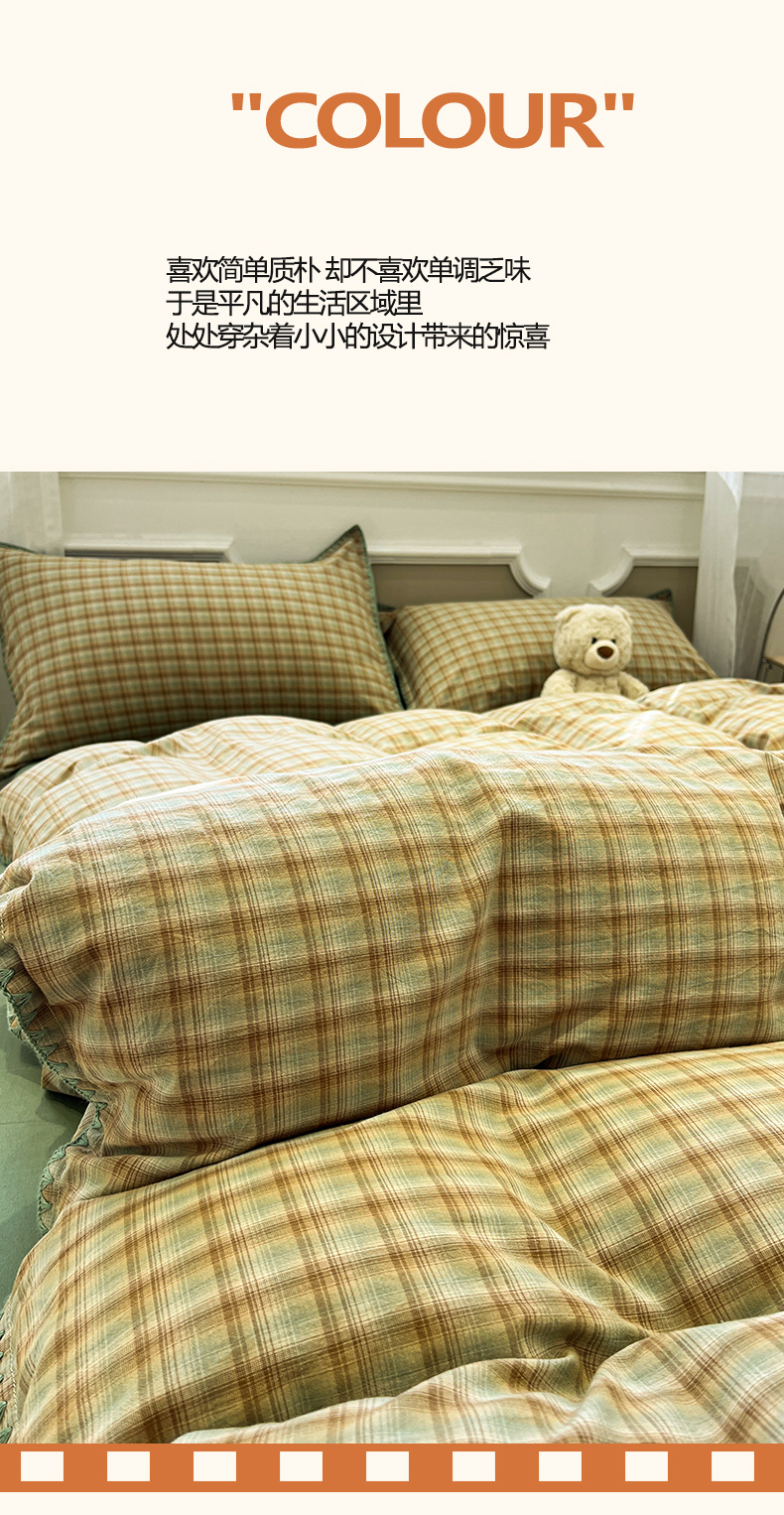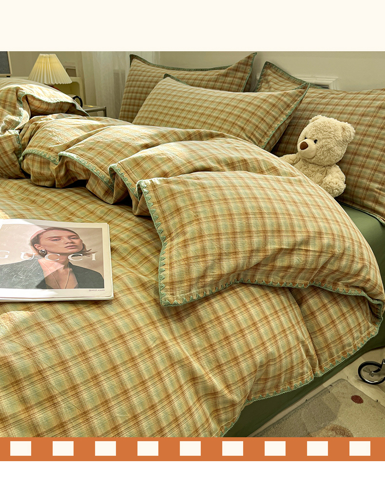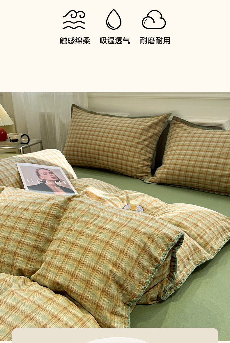 商品名称:莱茵家居 2026新款A类全棉色织水洗棉格子贝壳边套件-愫格系列 愫格-松绿