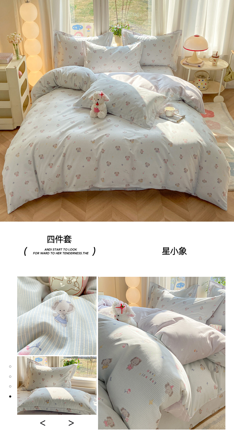 当前位置: 91家纺网 > 商品网购 > 床品套件 > 四件套 > 全棉普通四件套 > 朵安家纺 2026春夏新款12868全棉纯棉斜纹印花四件套 星小象