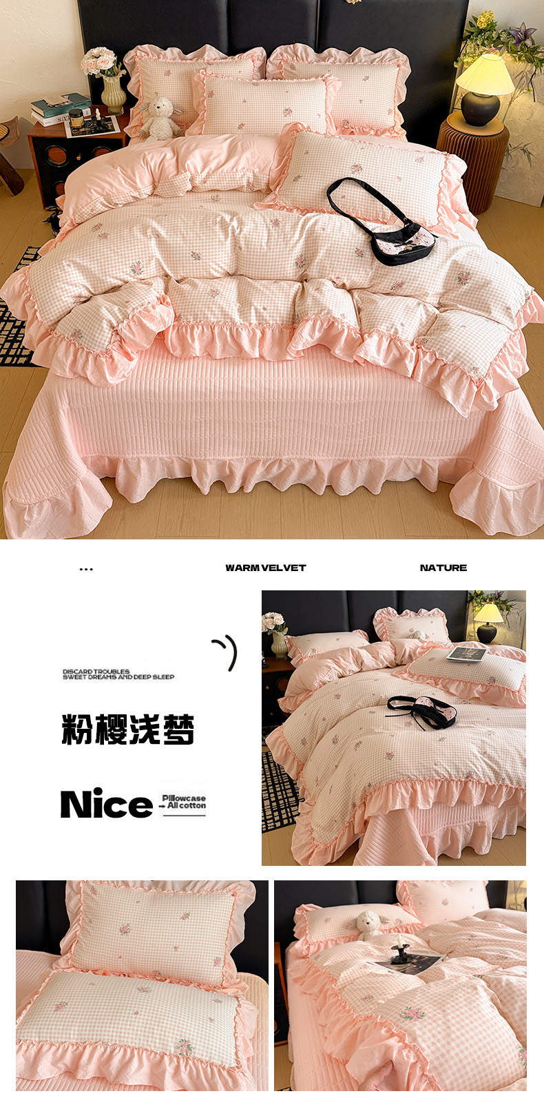 (总)金梦拉家纺 2026新款云感皱皱纱泡泡纱韩式床盖大花边四件套,爱心点点,豹纹南瓜,豹纹小熊,草莓,粉樱浅梦,海棠,咖调,可爱萌物,蓝色蝴蝶结,玫瑰花开,南瓜多多,柠檬蝴蝶结,素韵,甜甜草莓,条纹爱心,小樱桃,紫调草莓,紫韵,包装图仅做展示不可下单