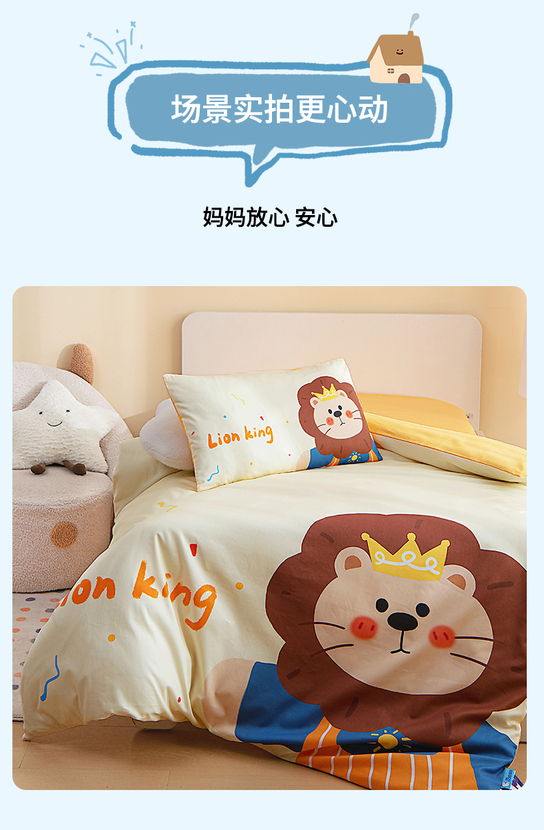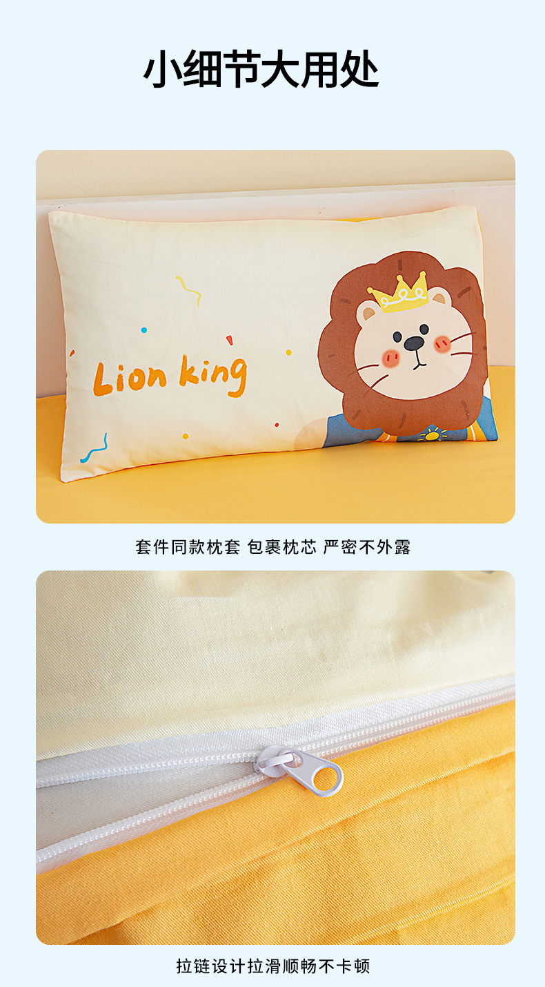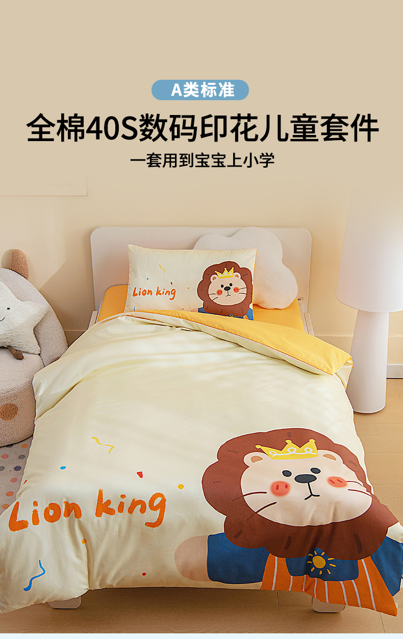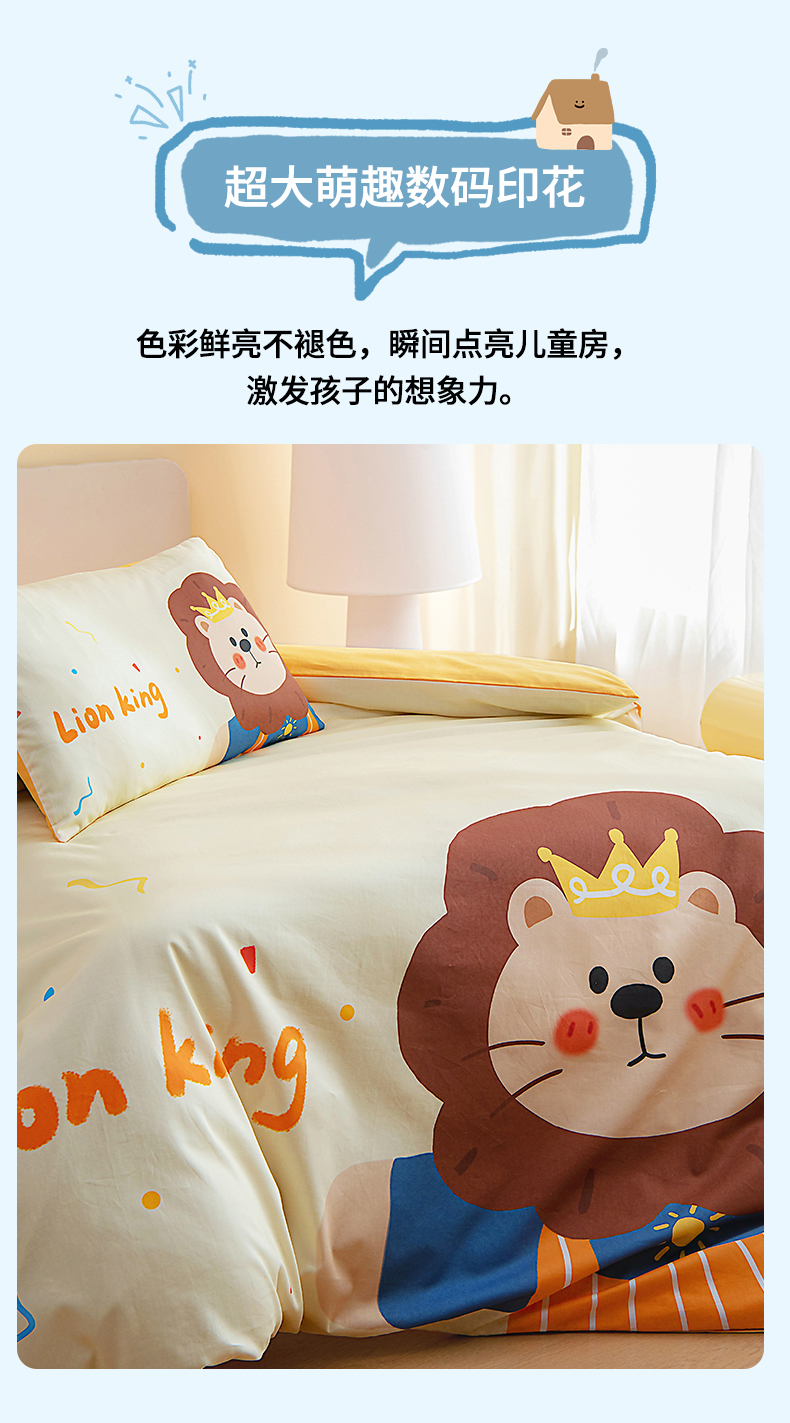 当前位置: 91家纺网 > 商品网购 > 床品套件 > 四件套 > 全棉普通四件套 > 御棉坊 2026新款A类40S全棉数码印花-萌萌季系列幼儿园儿童套件 萌萌狮子王