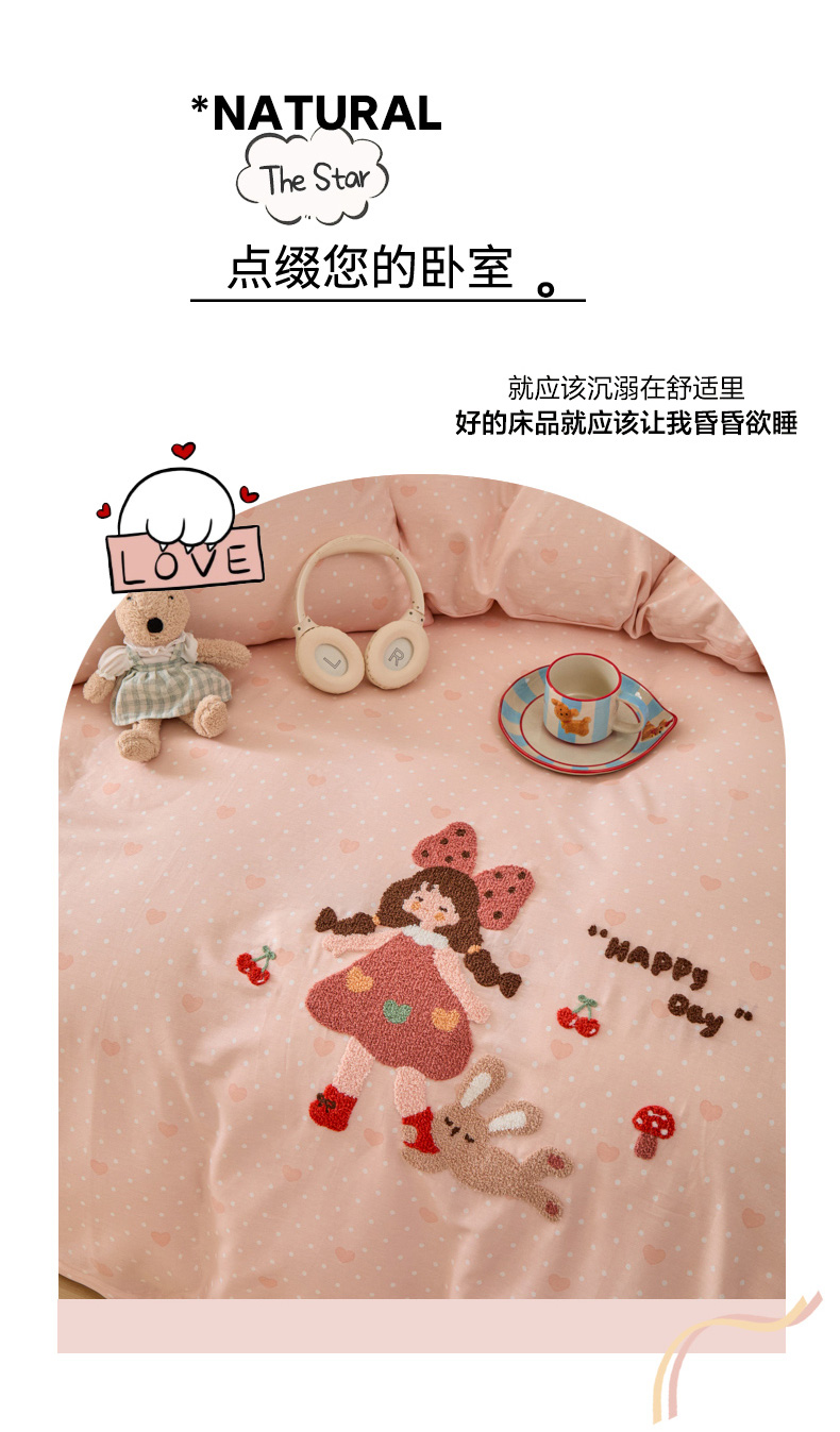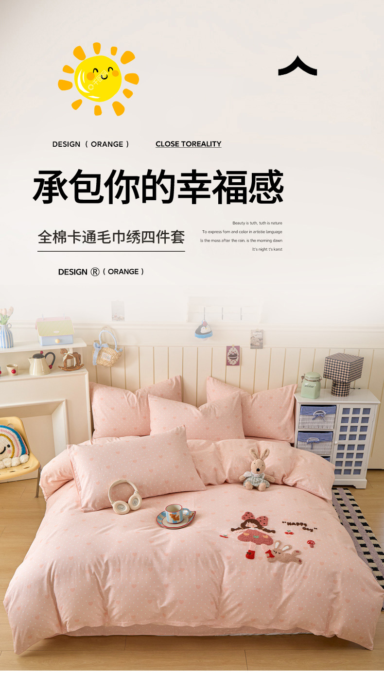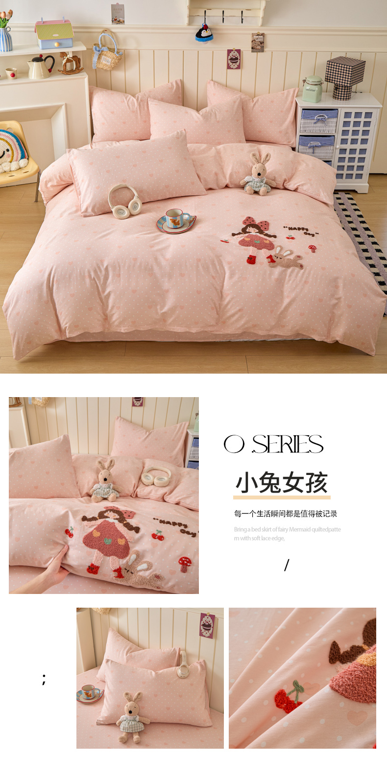 倾慕家纺 2026新款全棉卡通毛巾绣系列四件套 小兔女孩