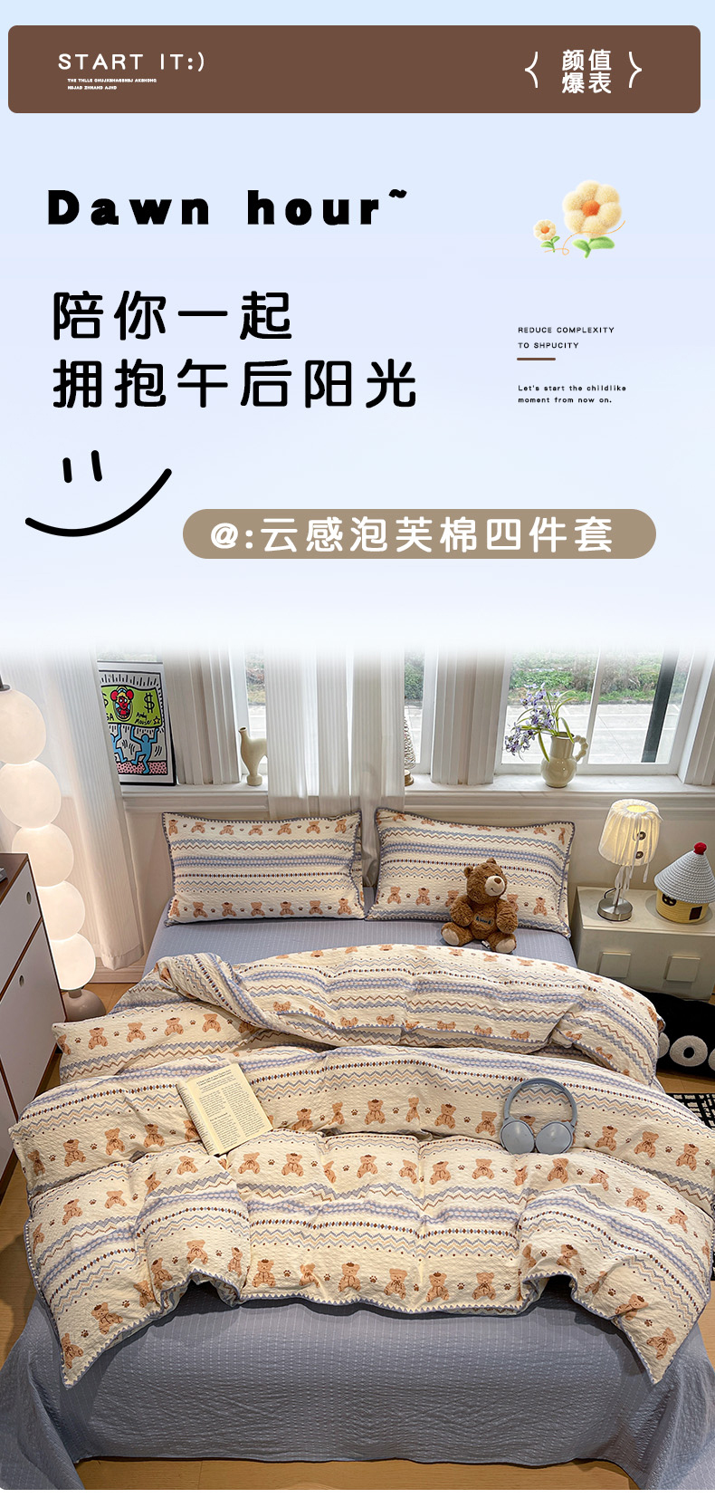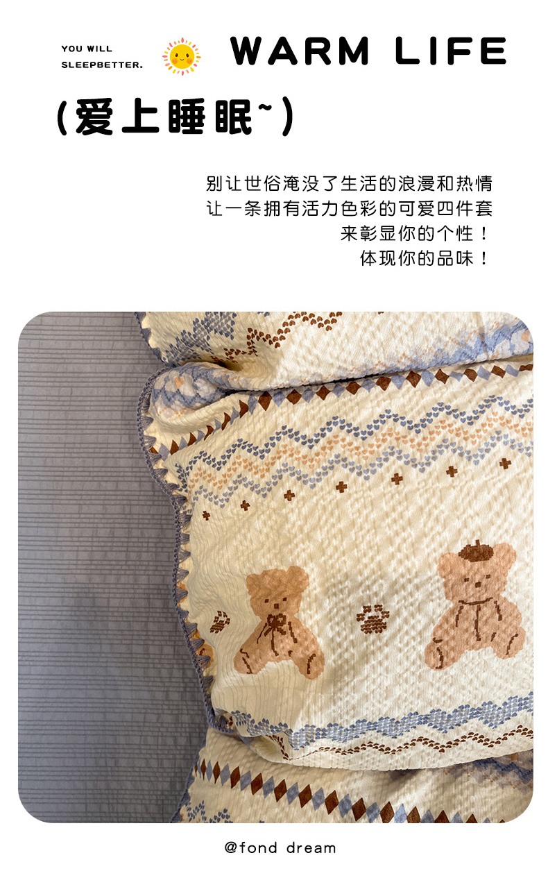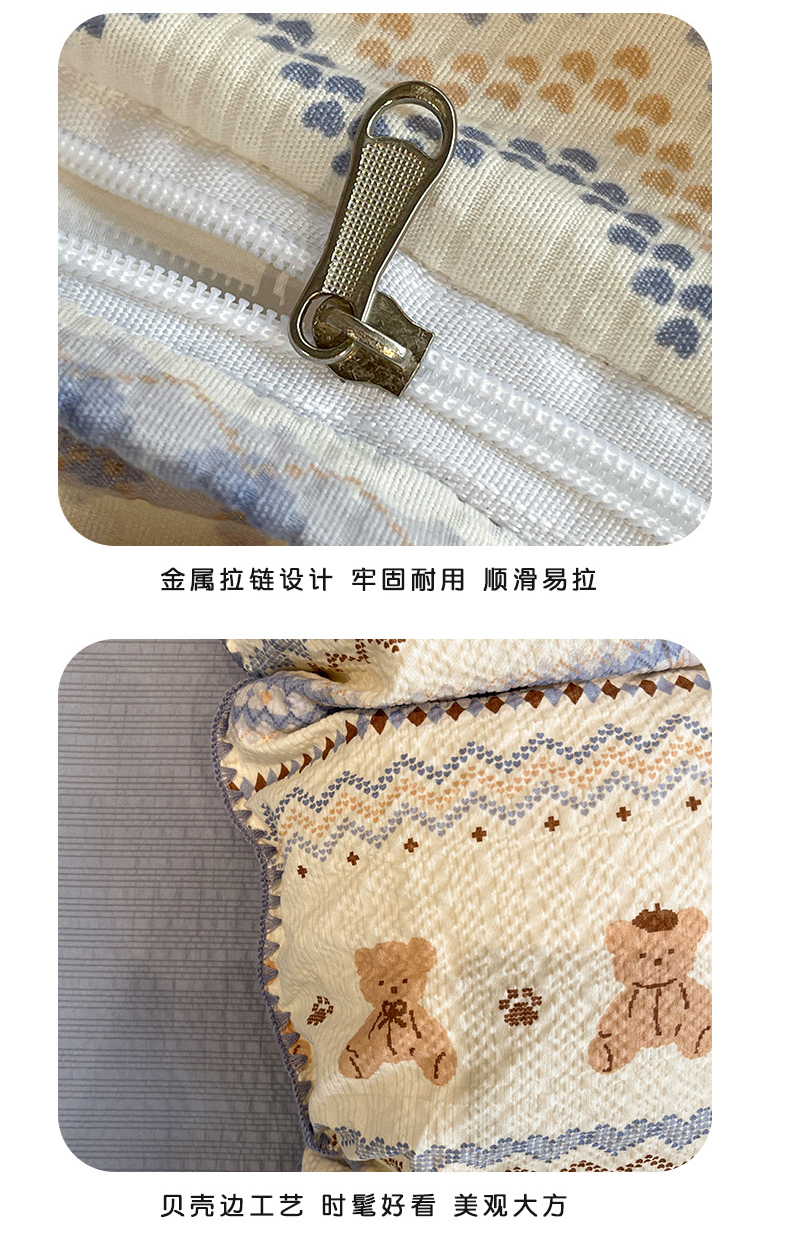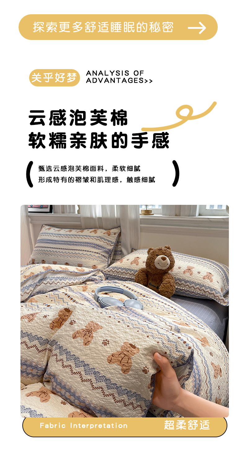 仟网汇 2026新款云感泡芙棉小清新印花贝壳边四件套 萌趣小熊