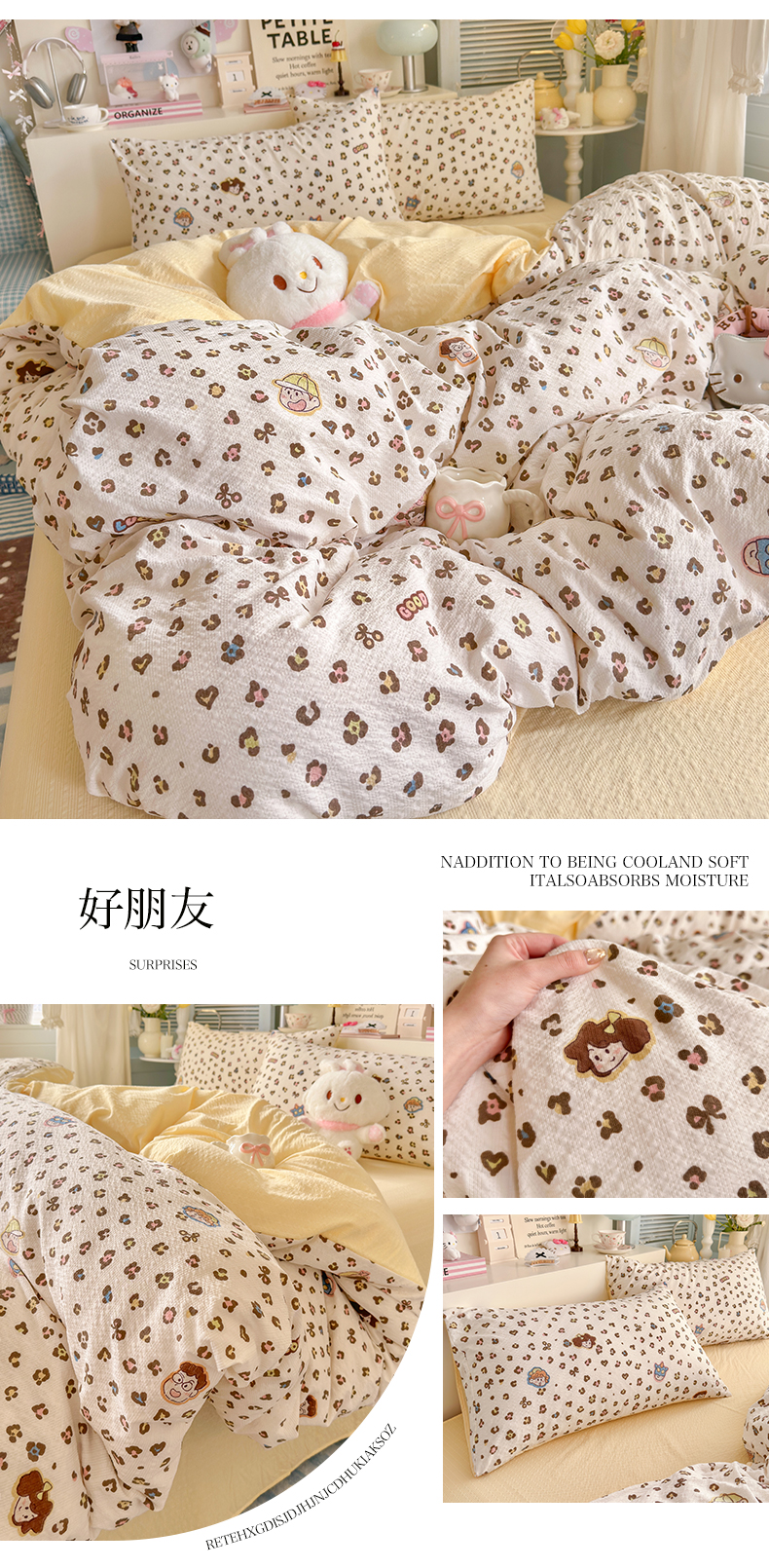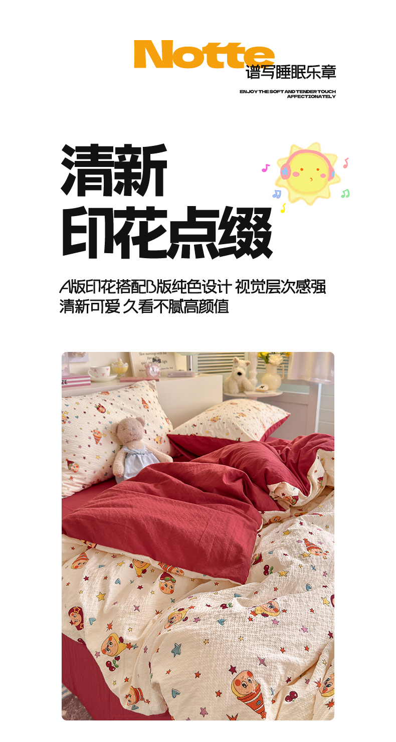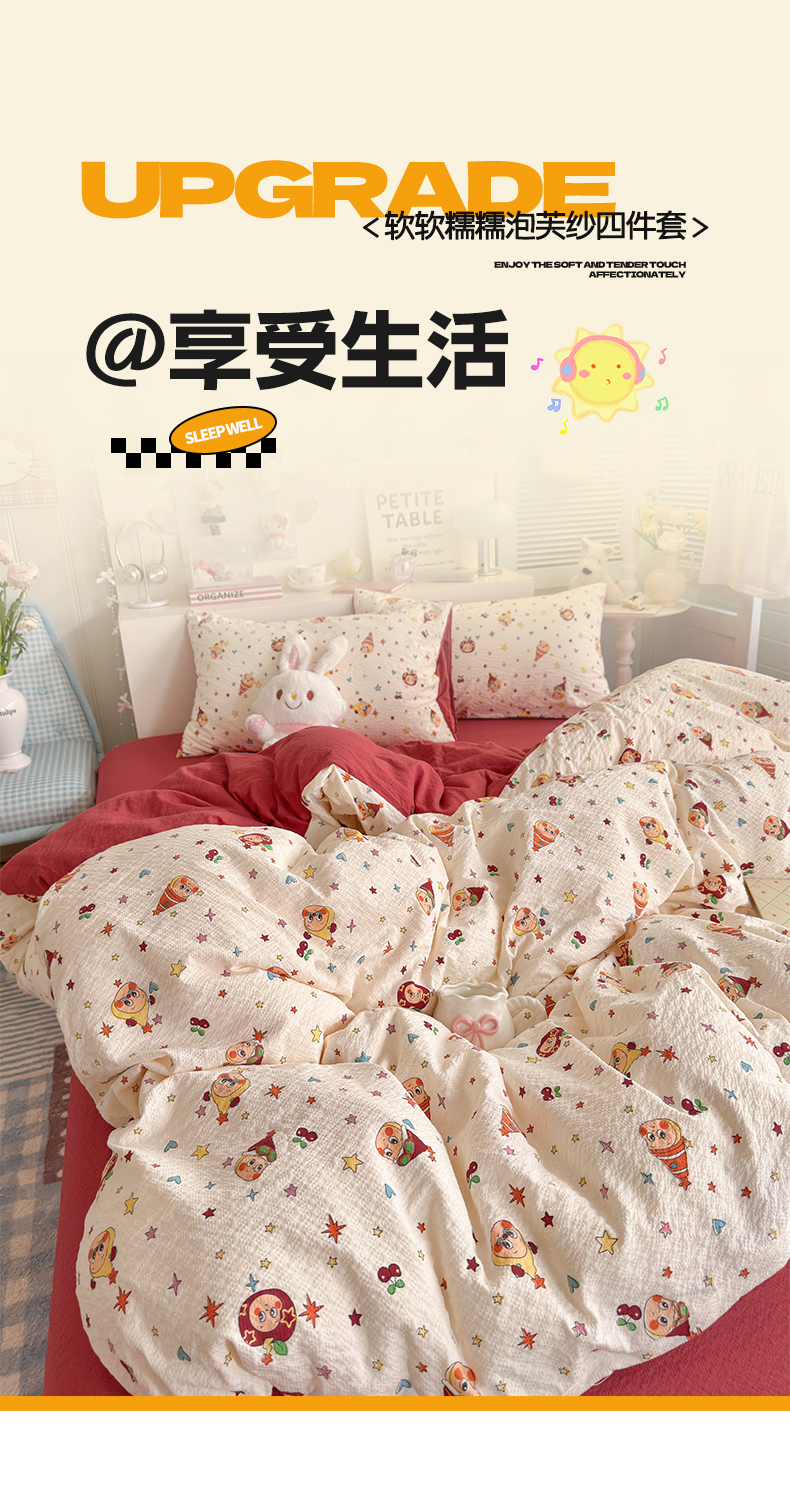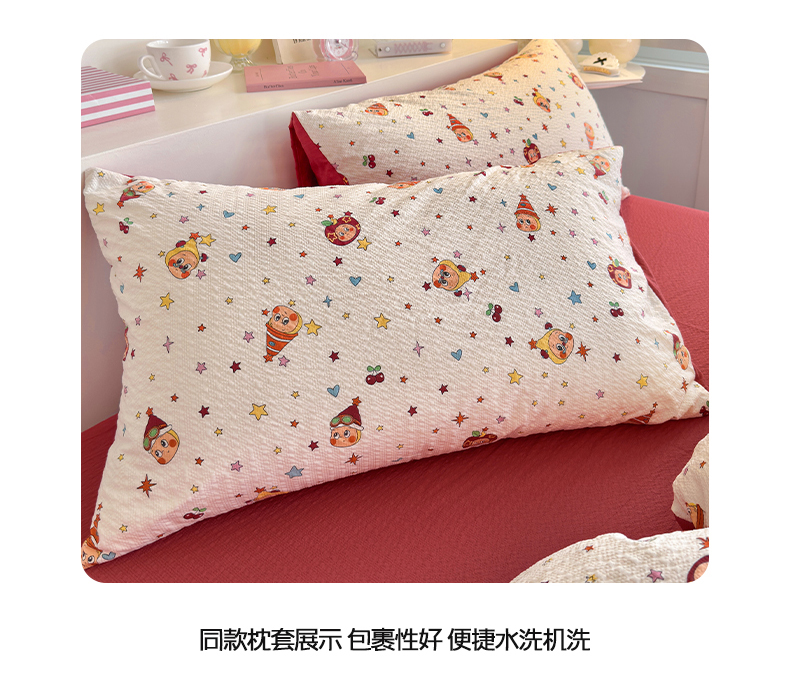 当前位置: 91家纺网 > 商品网购 > 床品套件 > 四件套 > 双层纱四件套 > 铺尚美家纺 2026新款小清新110g高品质直播热卖款A类泡芙棉双层纱四件套 苹果星星人-红
