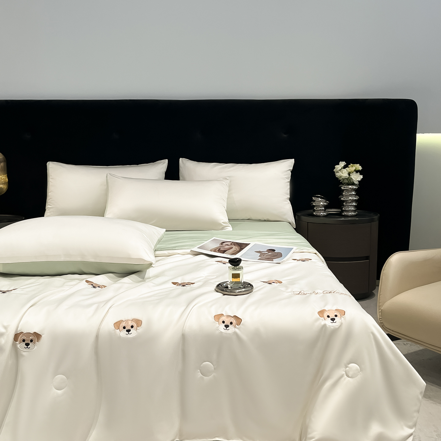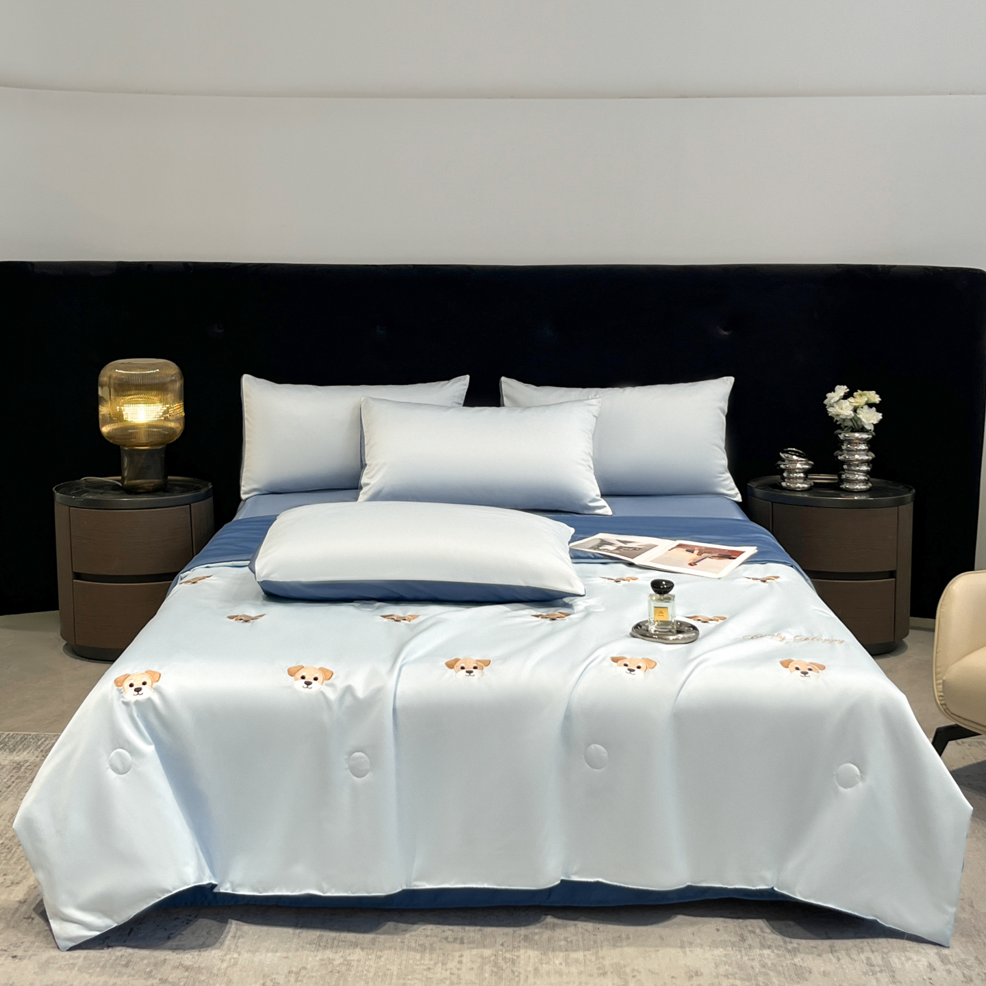 当前位置: 91家纺网 > 商品网购 > 床品套件 > 四件套 > 夏被四件套 > 红嘴企鹅 2026新款水洗冰丝刺绣夏被四件套 夏被-小狗 天兰