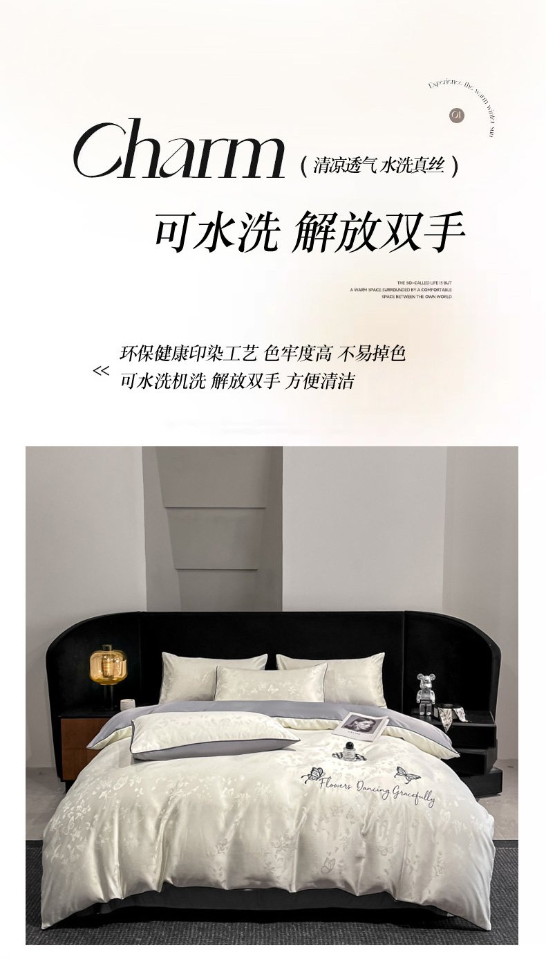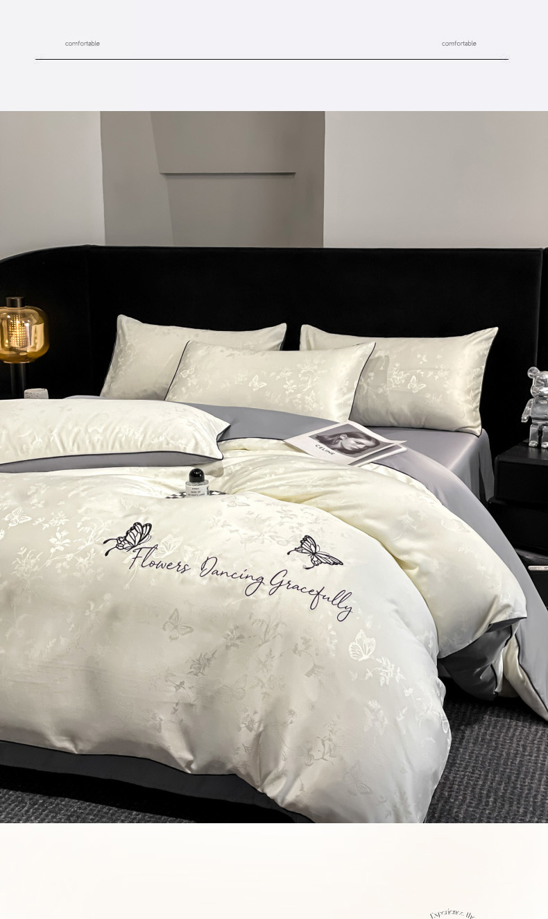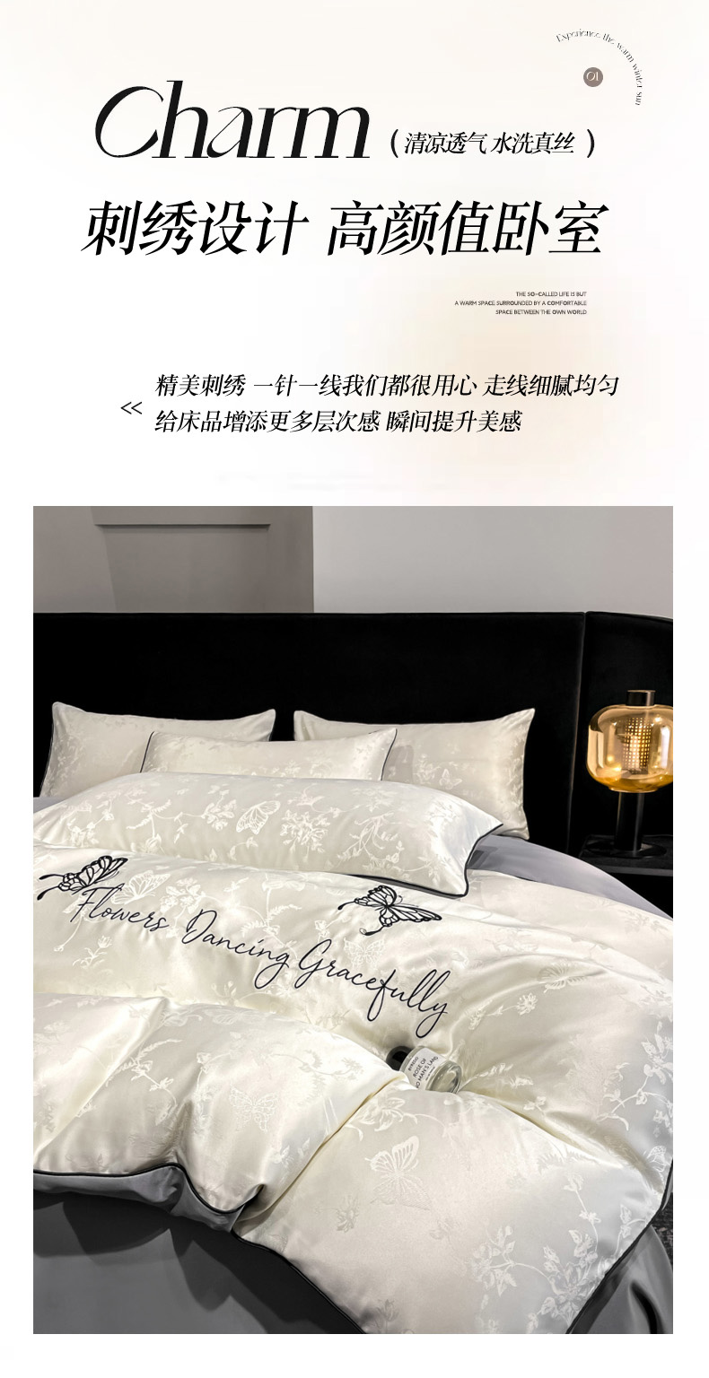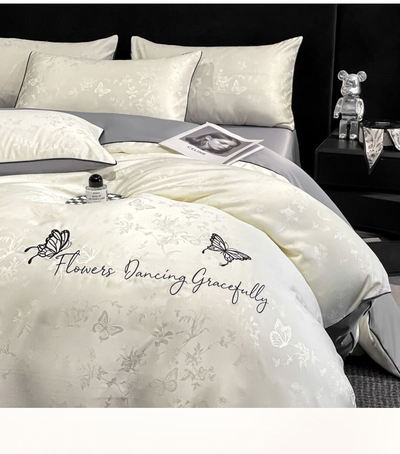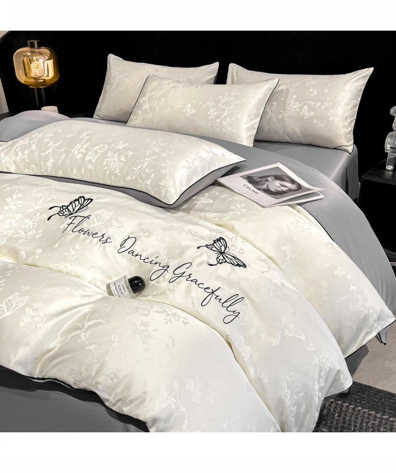 当前位置: 91家纺网 > 商品网购 > 床品套件 > 四件套 > 其它四件套 > 慕澄家纺 2026新款厚织亮丝提花刺绣水洗真丝四件套 蝶恋花-白+灰