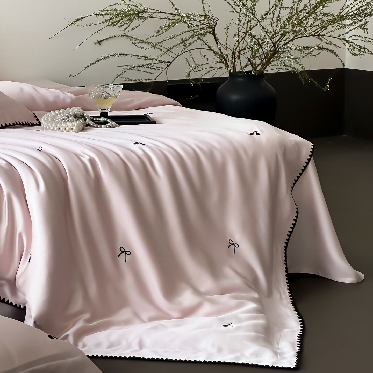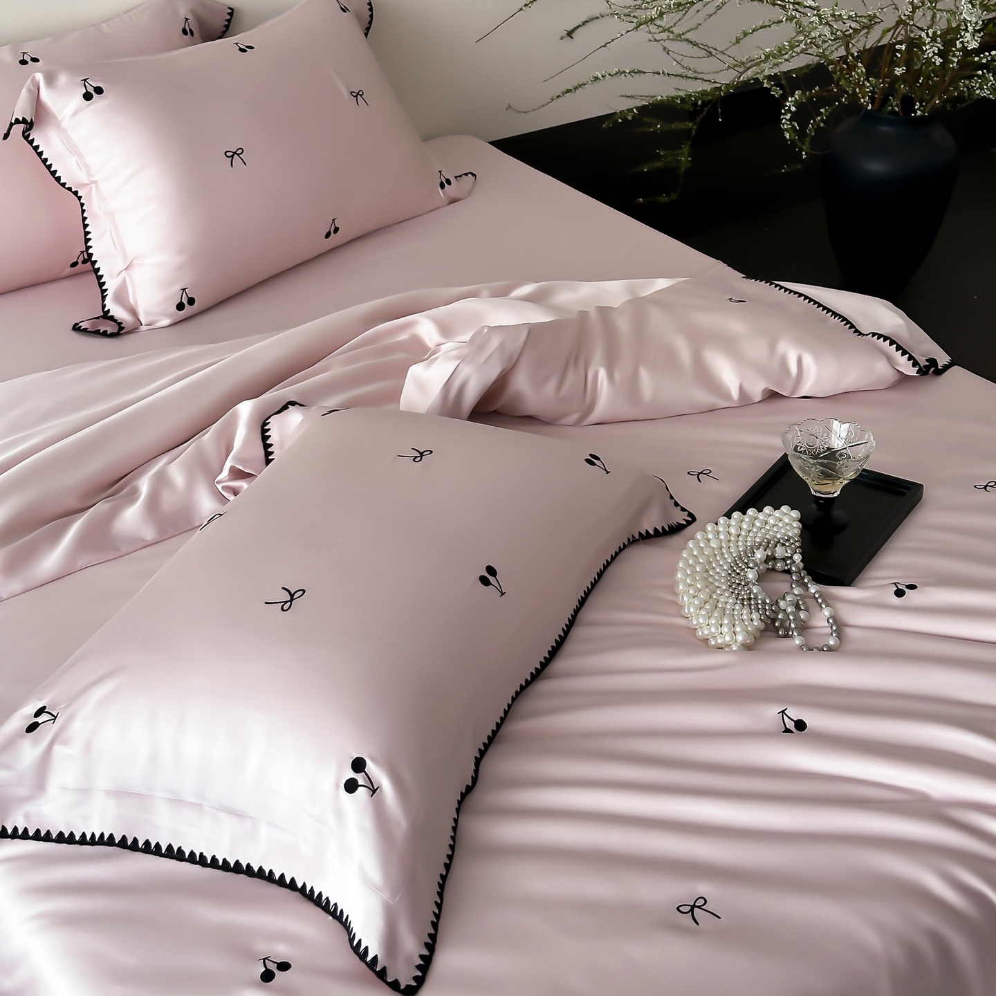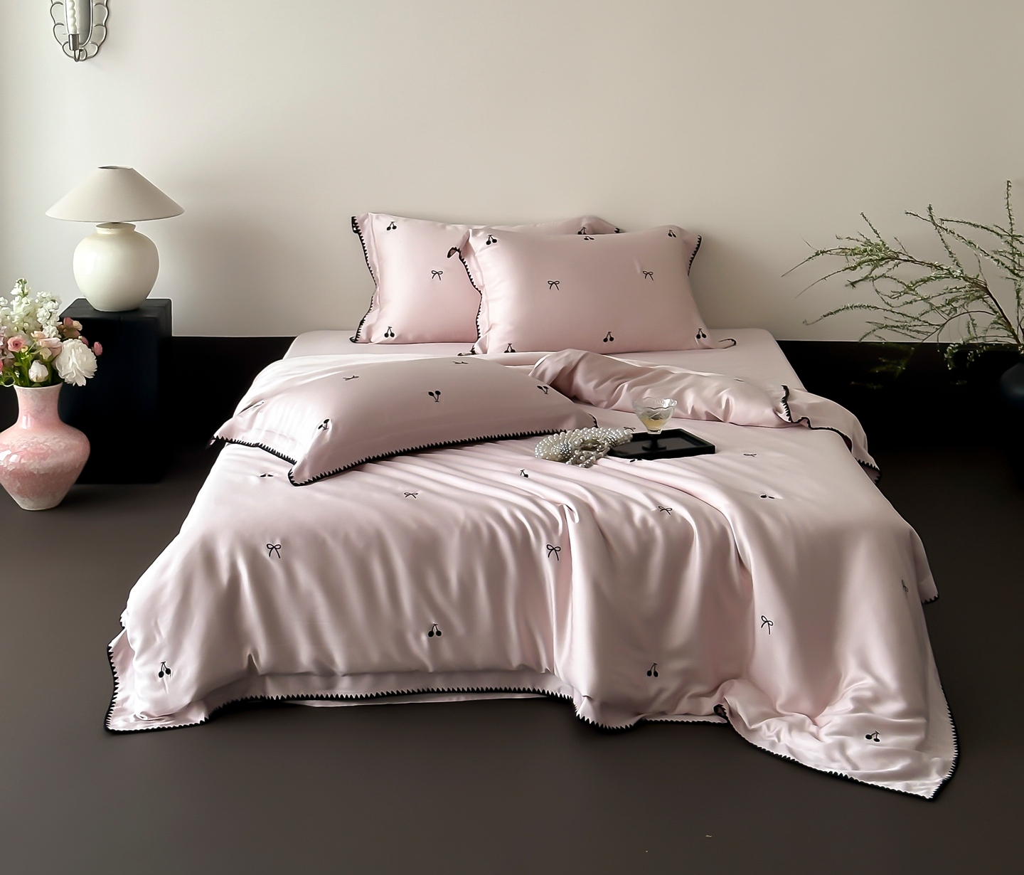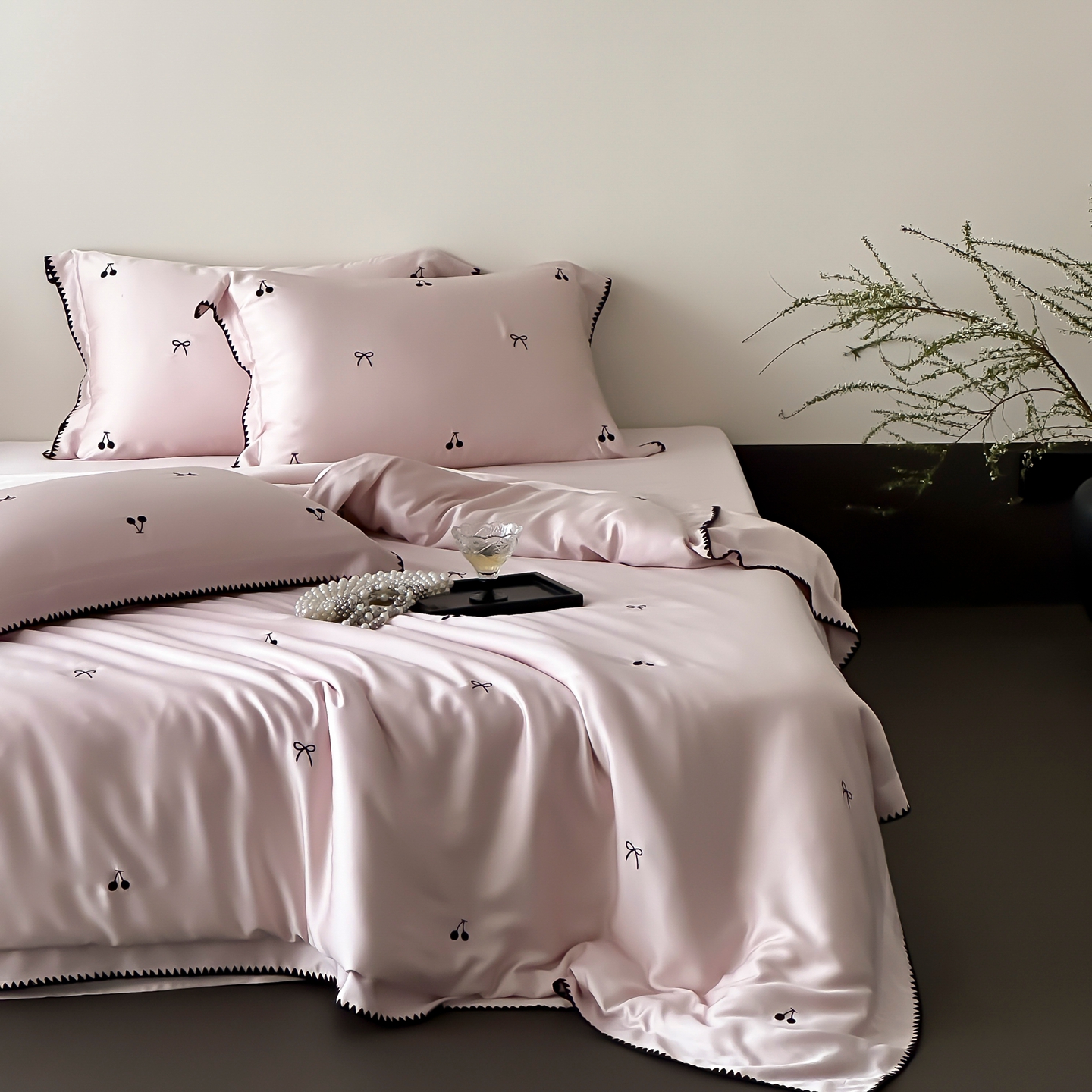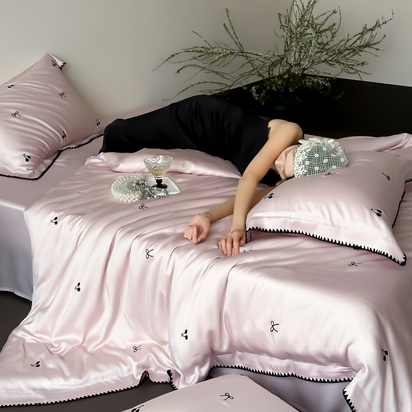 商品名称:时亿家居 2026春夏新款兰精天丝四件套-黑樱梦境 粉