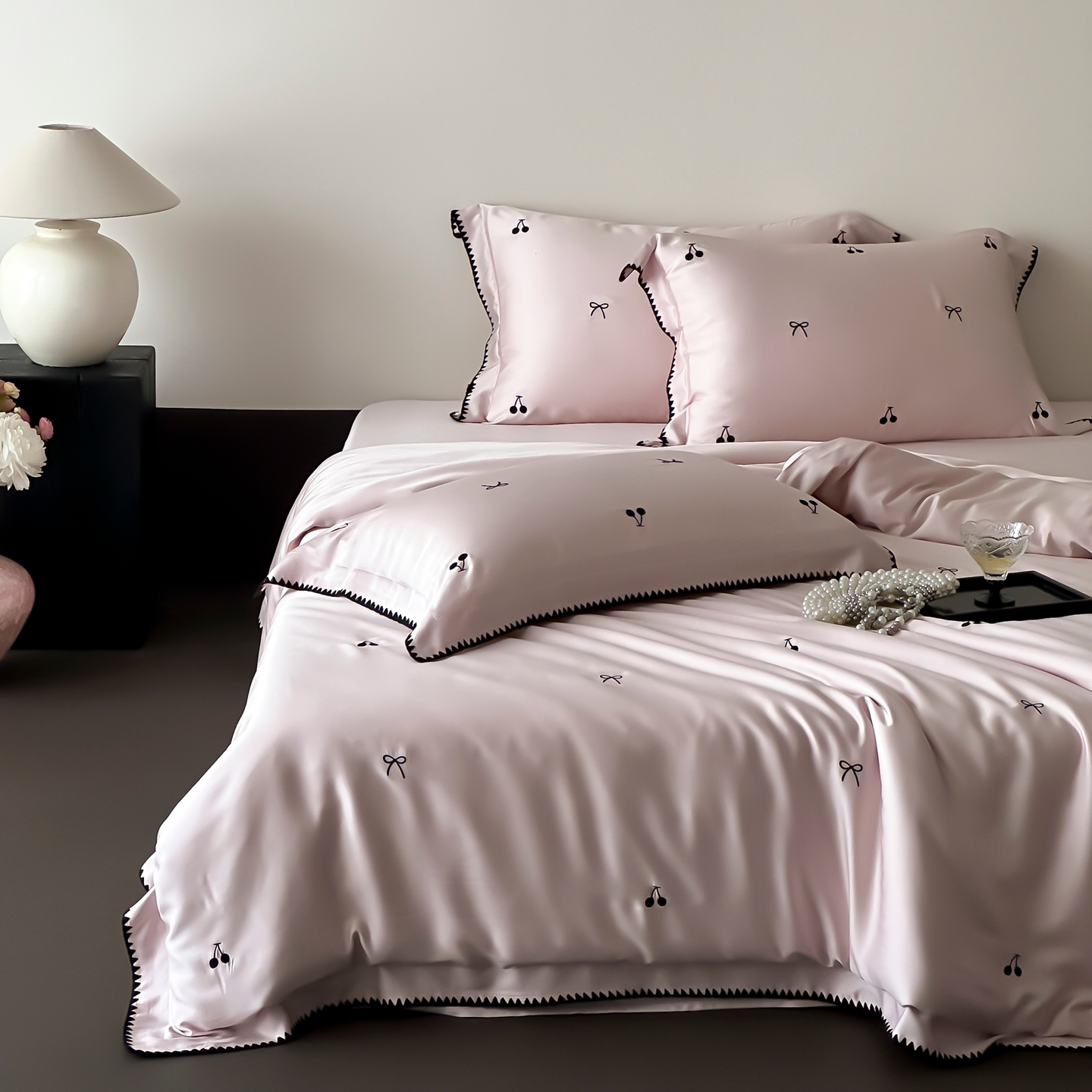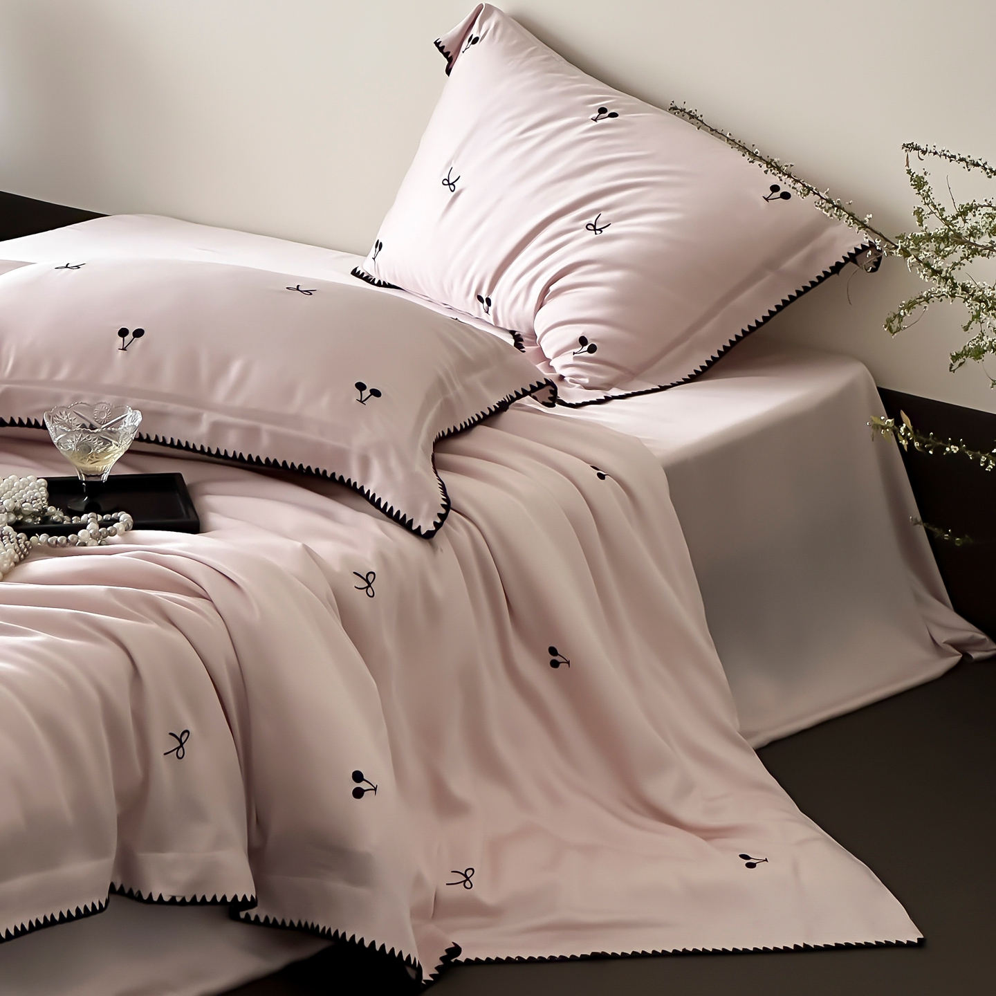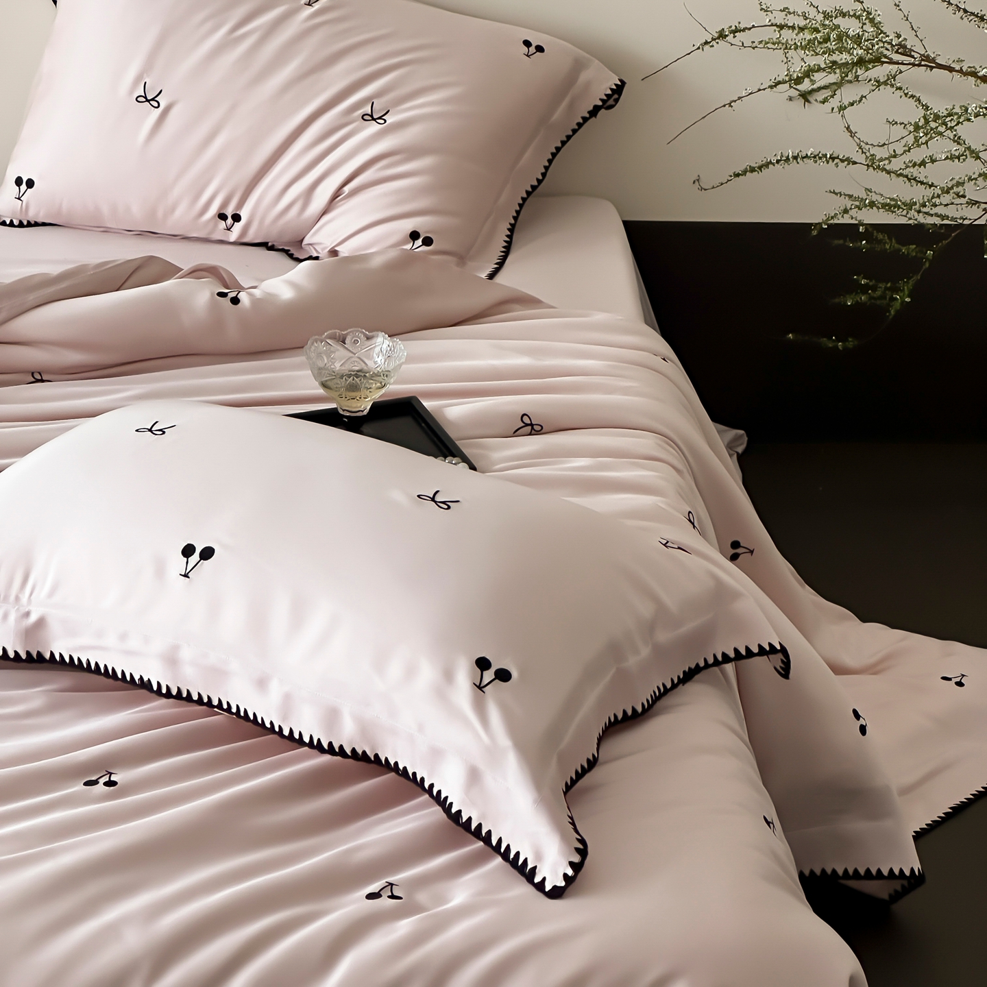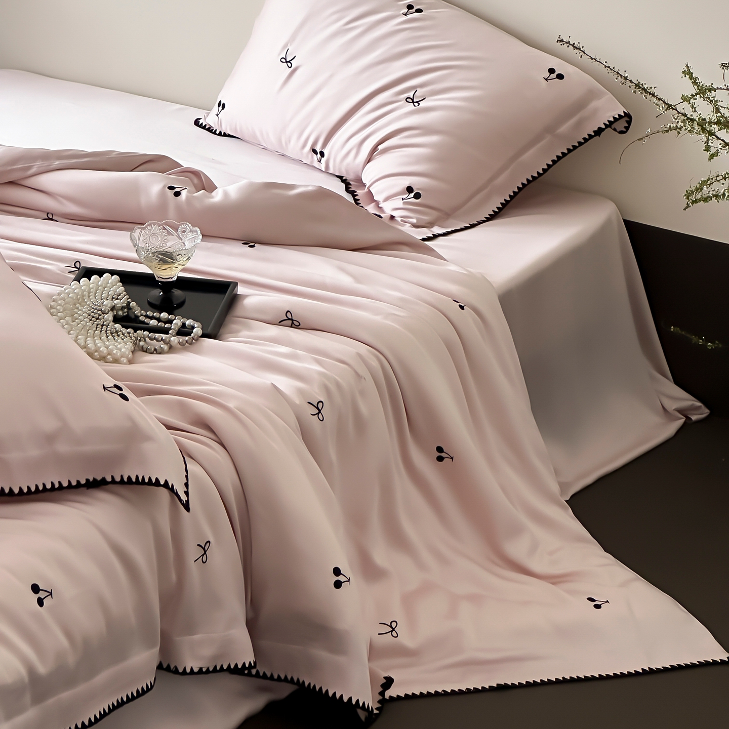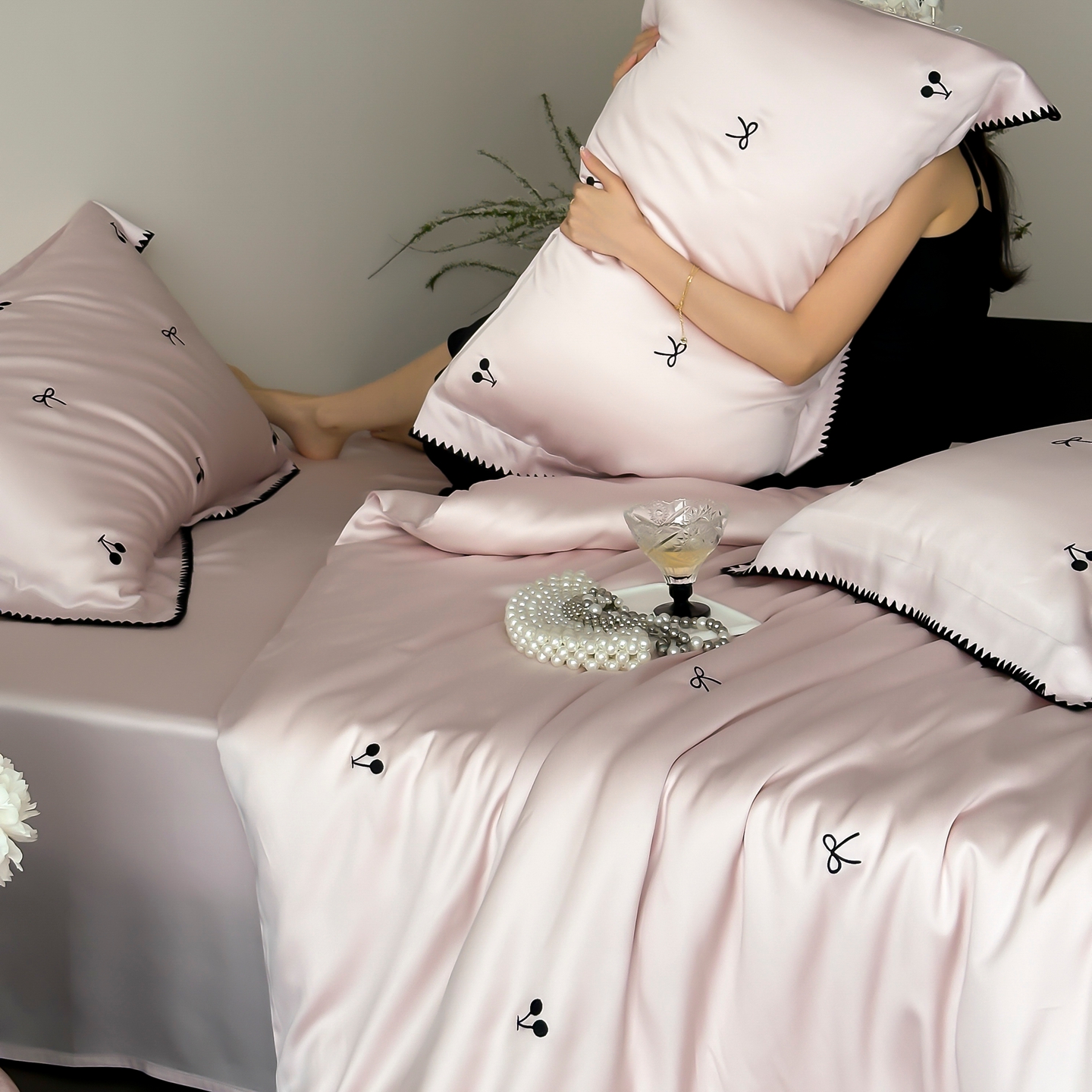 商品名称:时亿家居 2026春夏新款兰精天丝四件套-黑樱梦境 粉