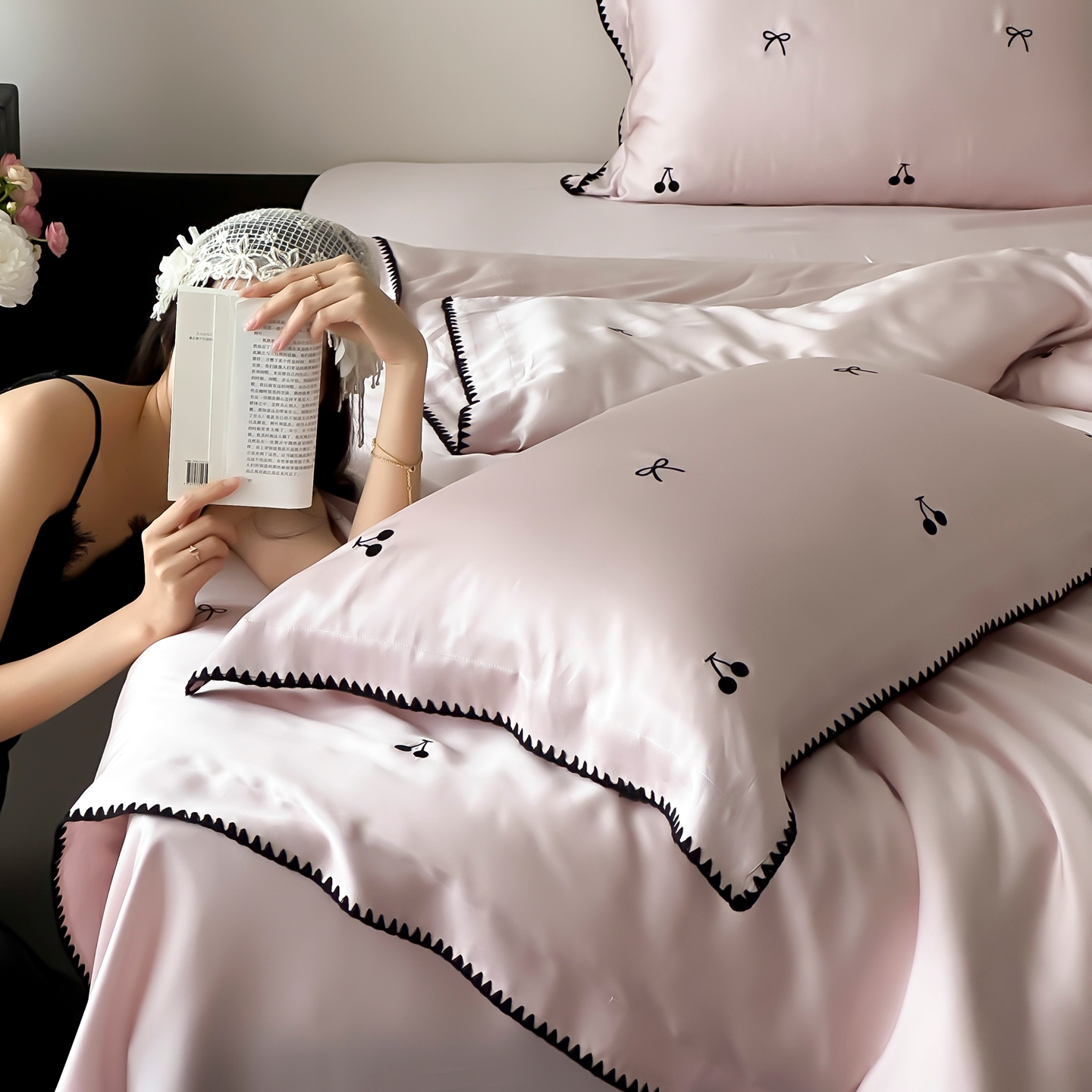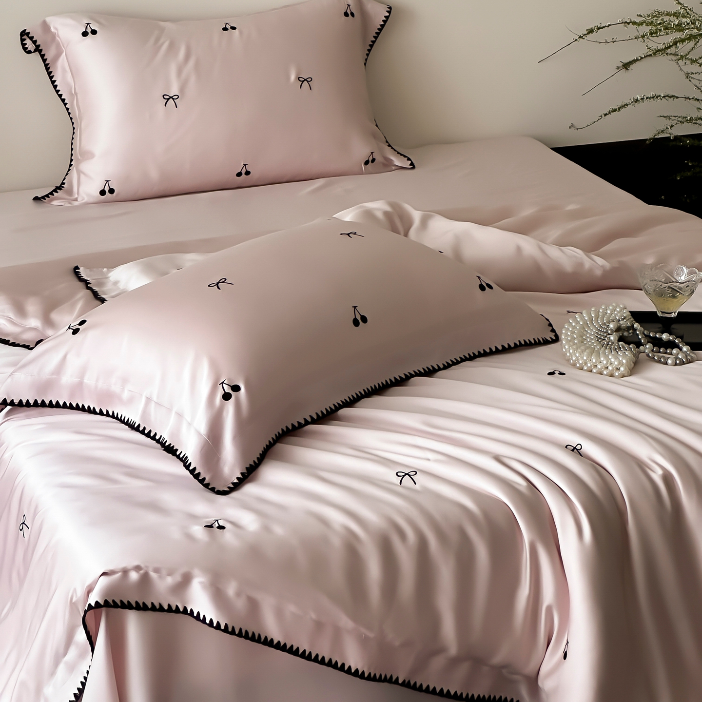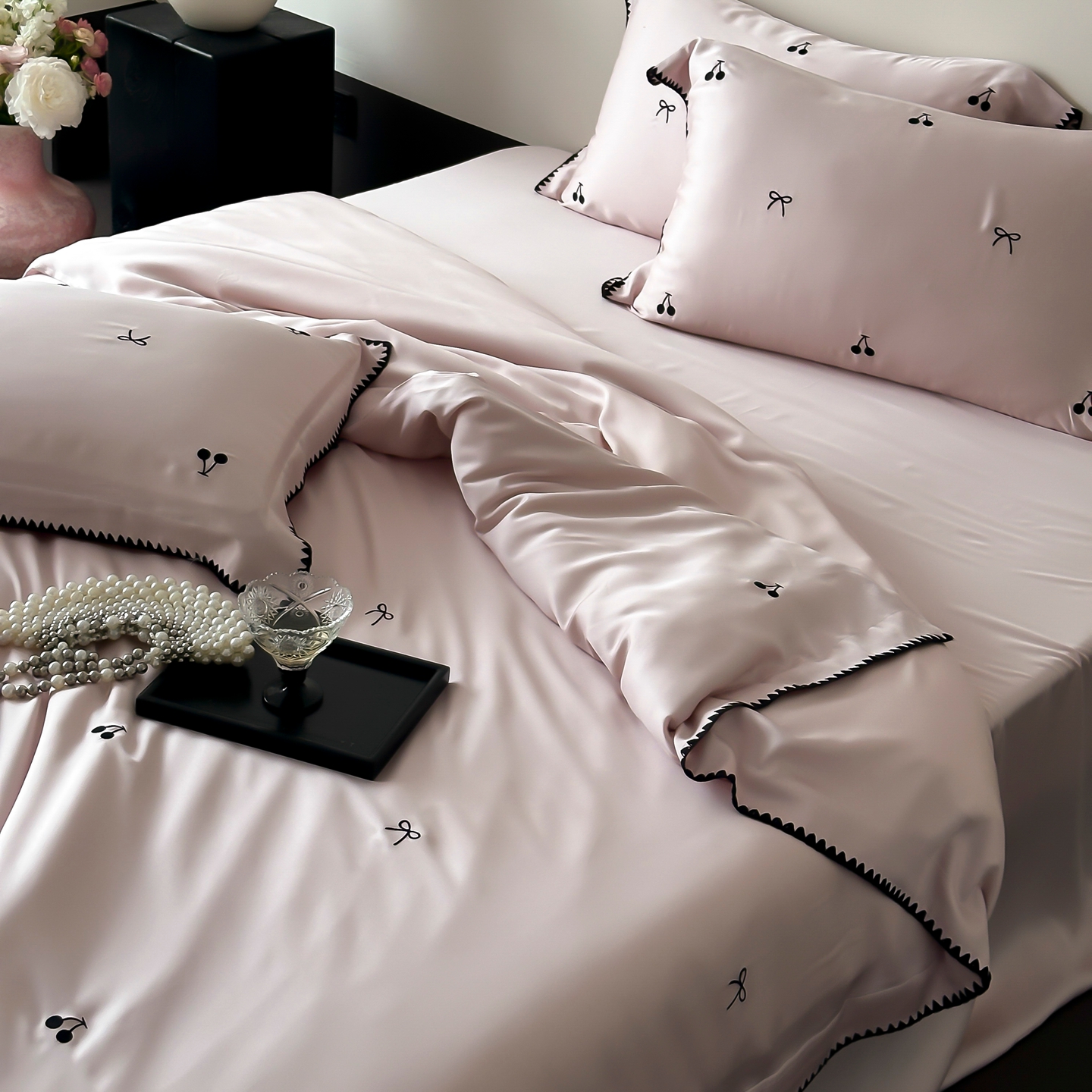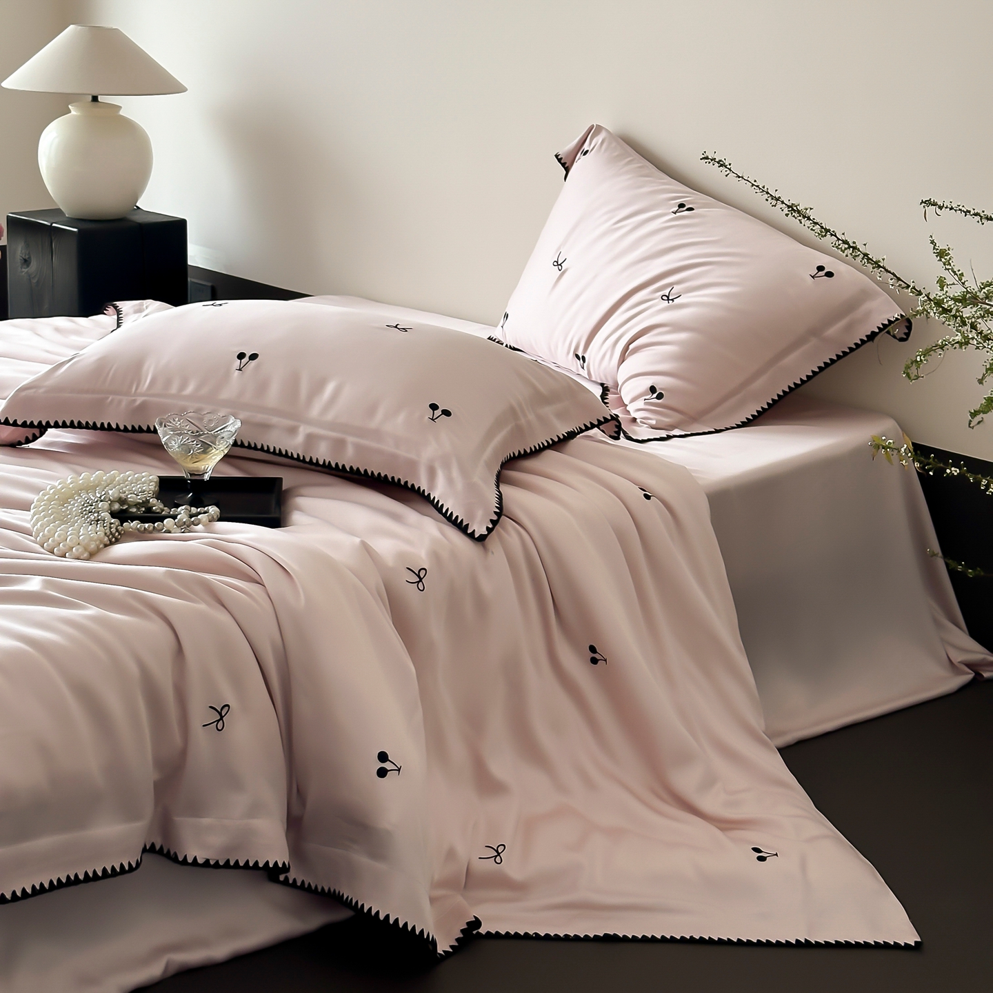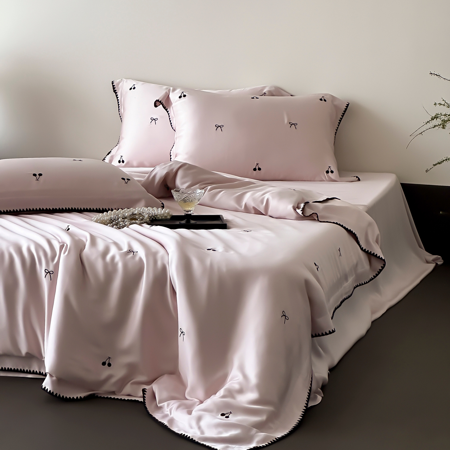 商品名称:时亿家居 2026春夏新款兰精天丝四件套-黑樱梦境 粉