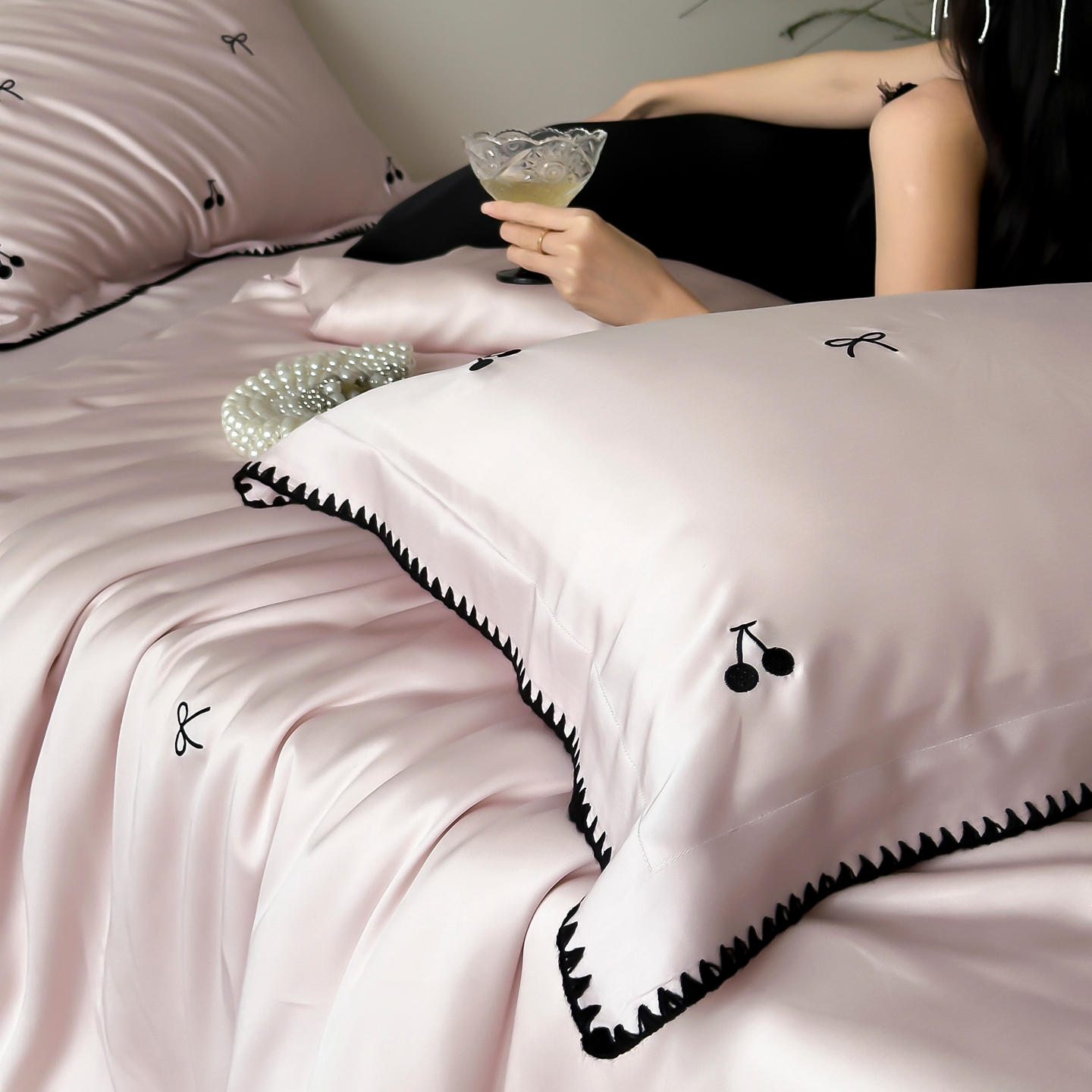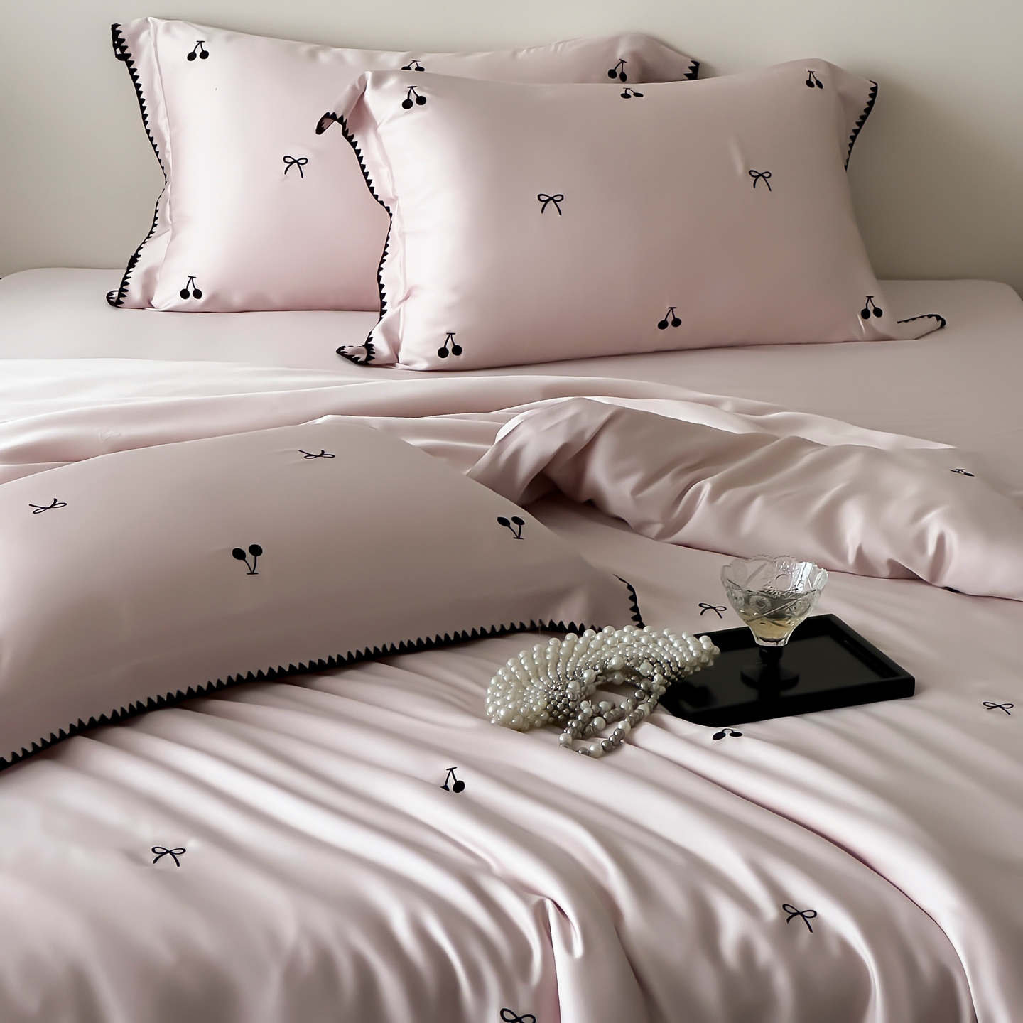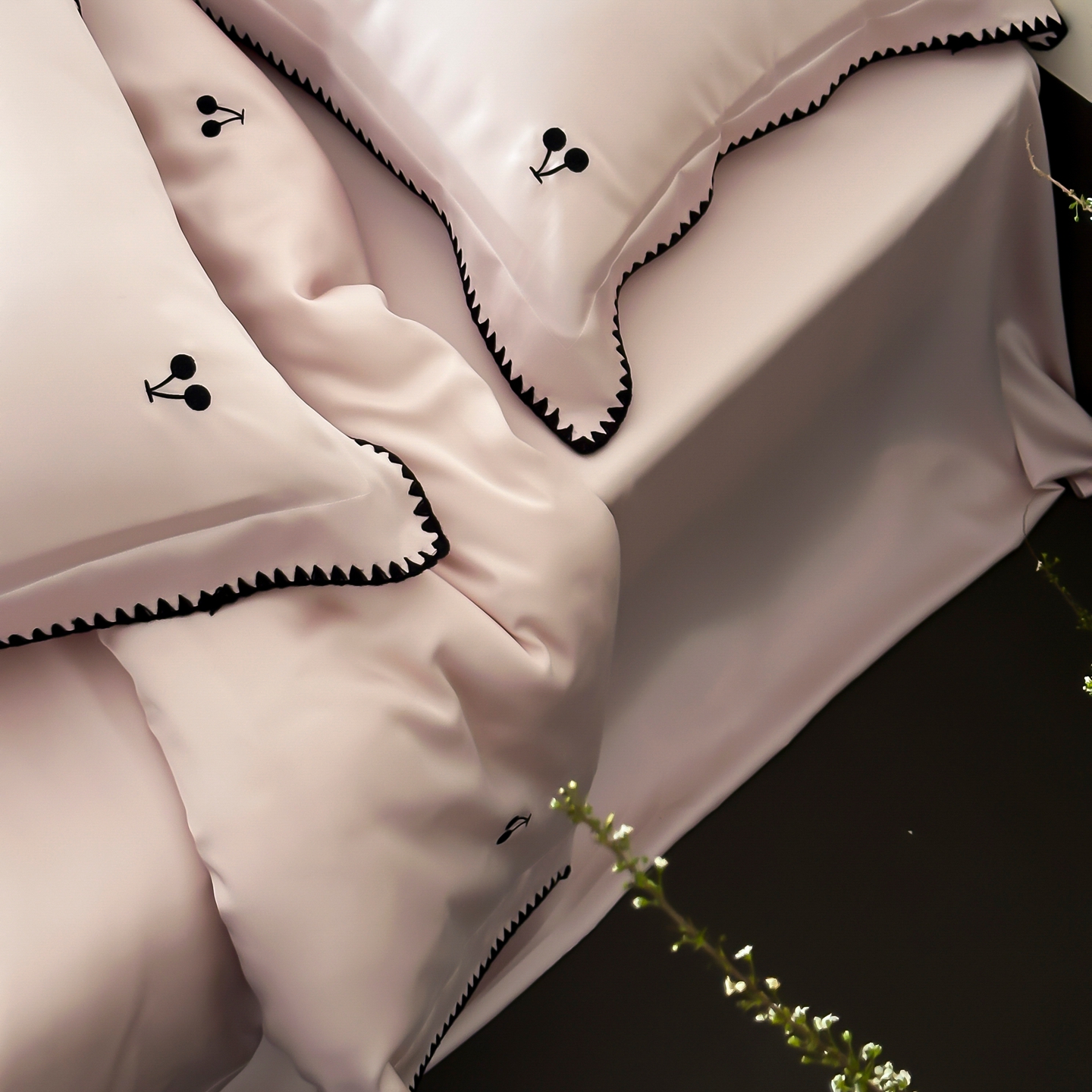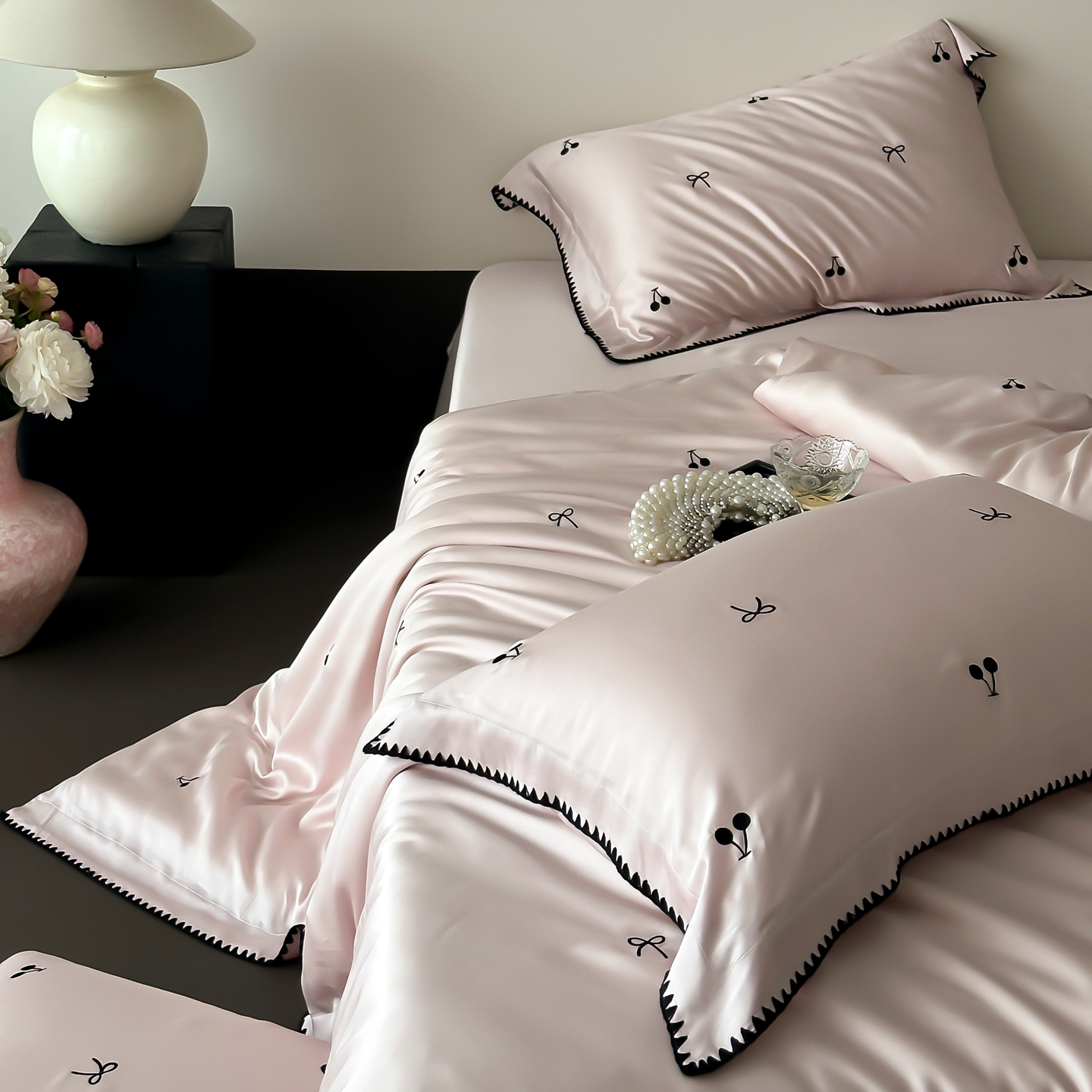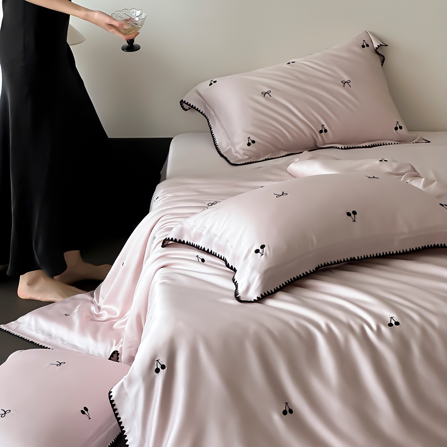 商品名称:时亿家居 2026春夏新款兰精天丝四件套-黑樱梦境 粉