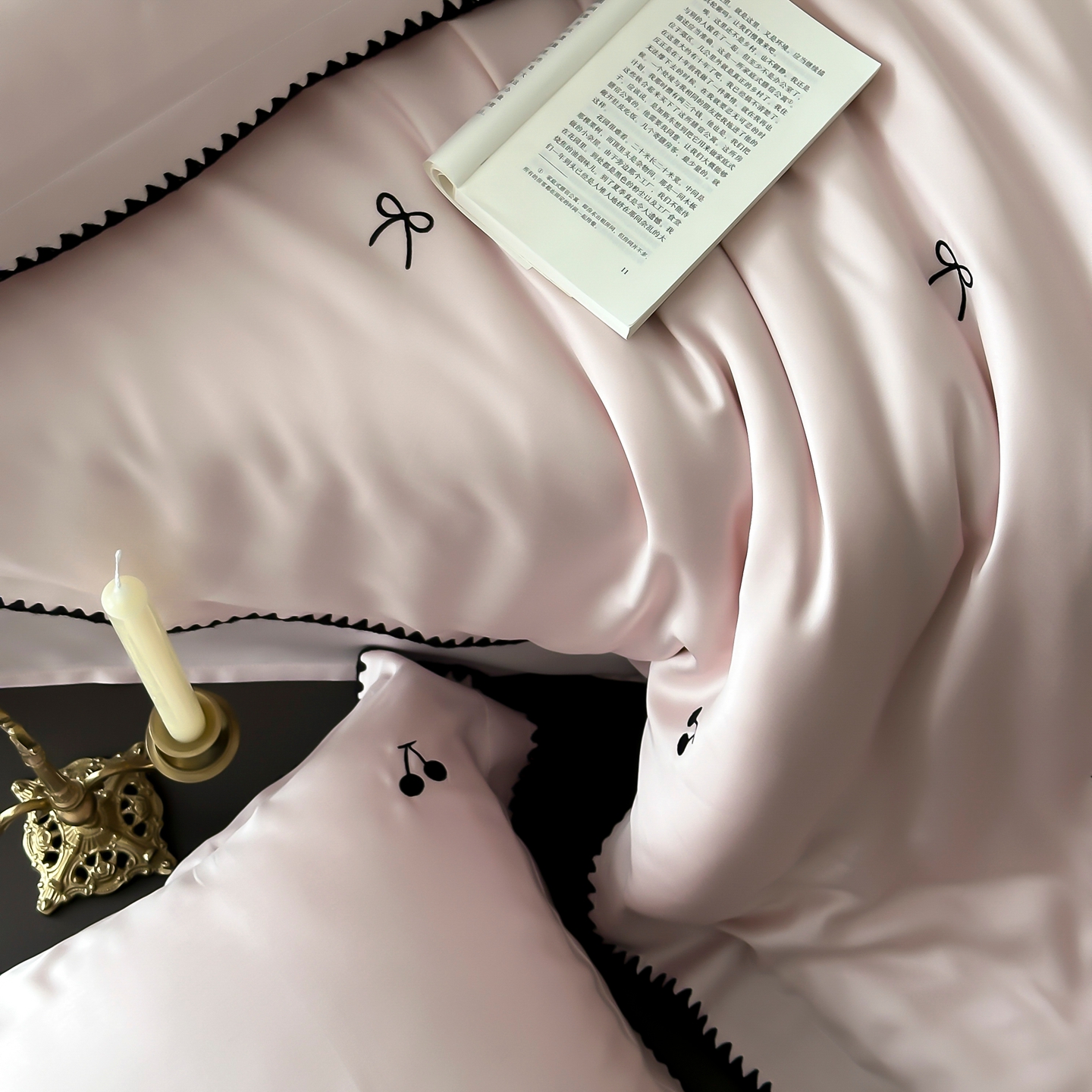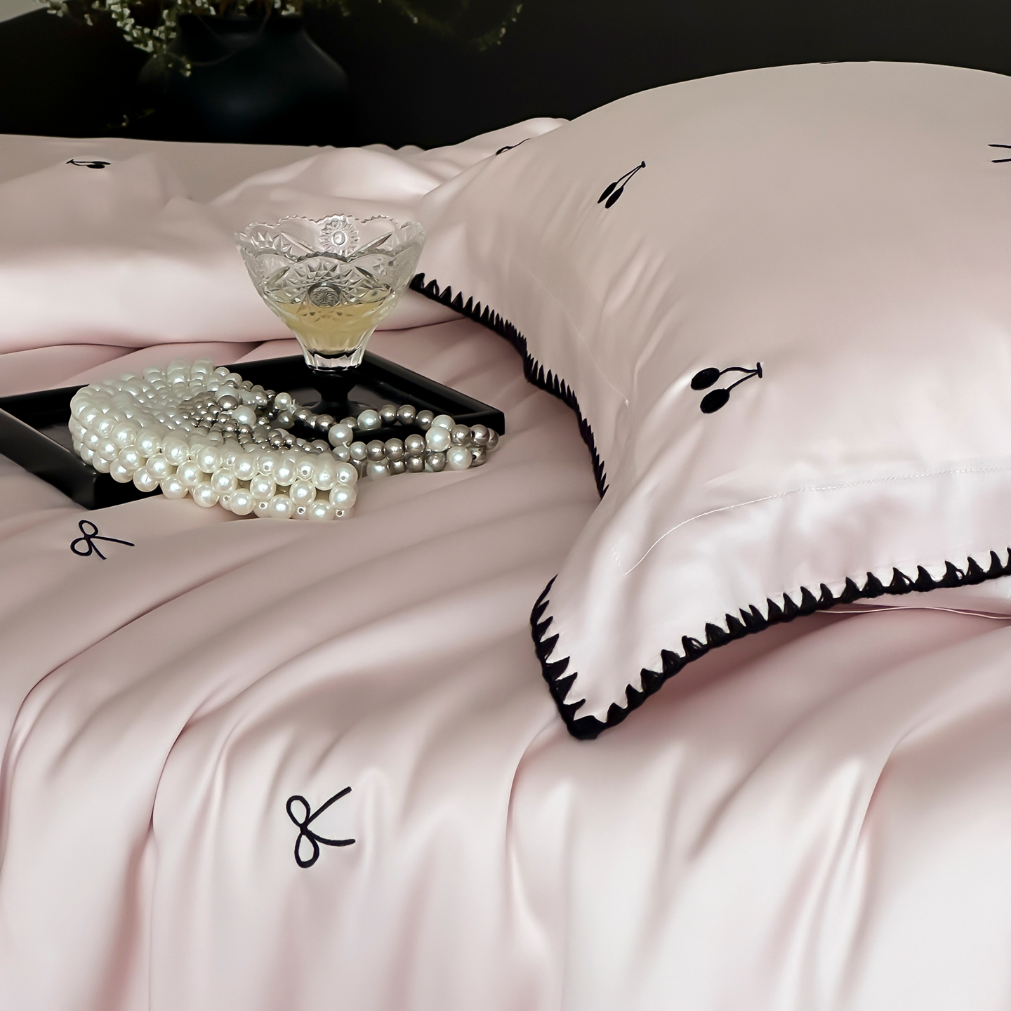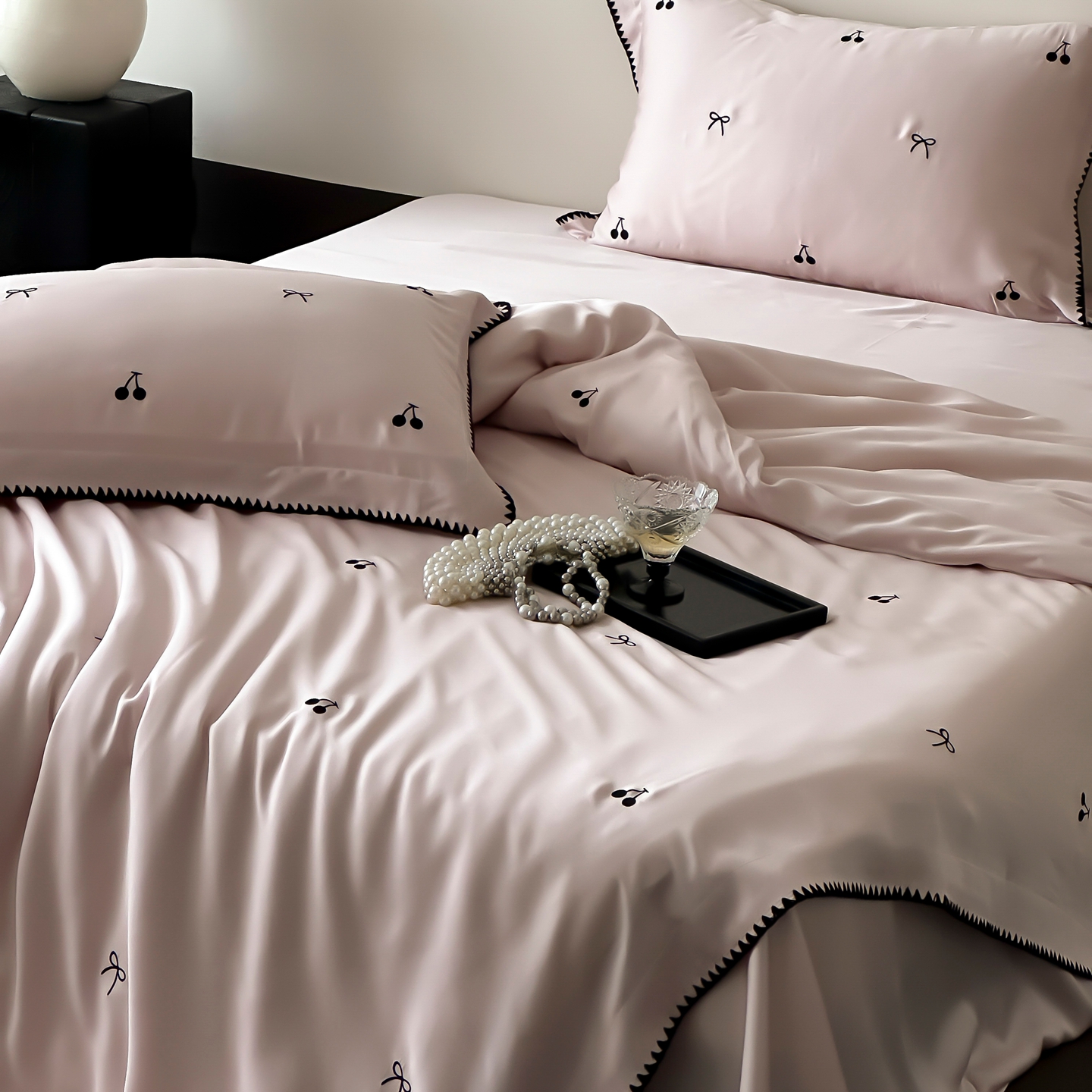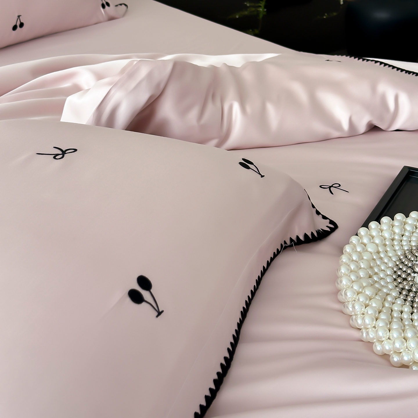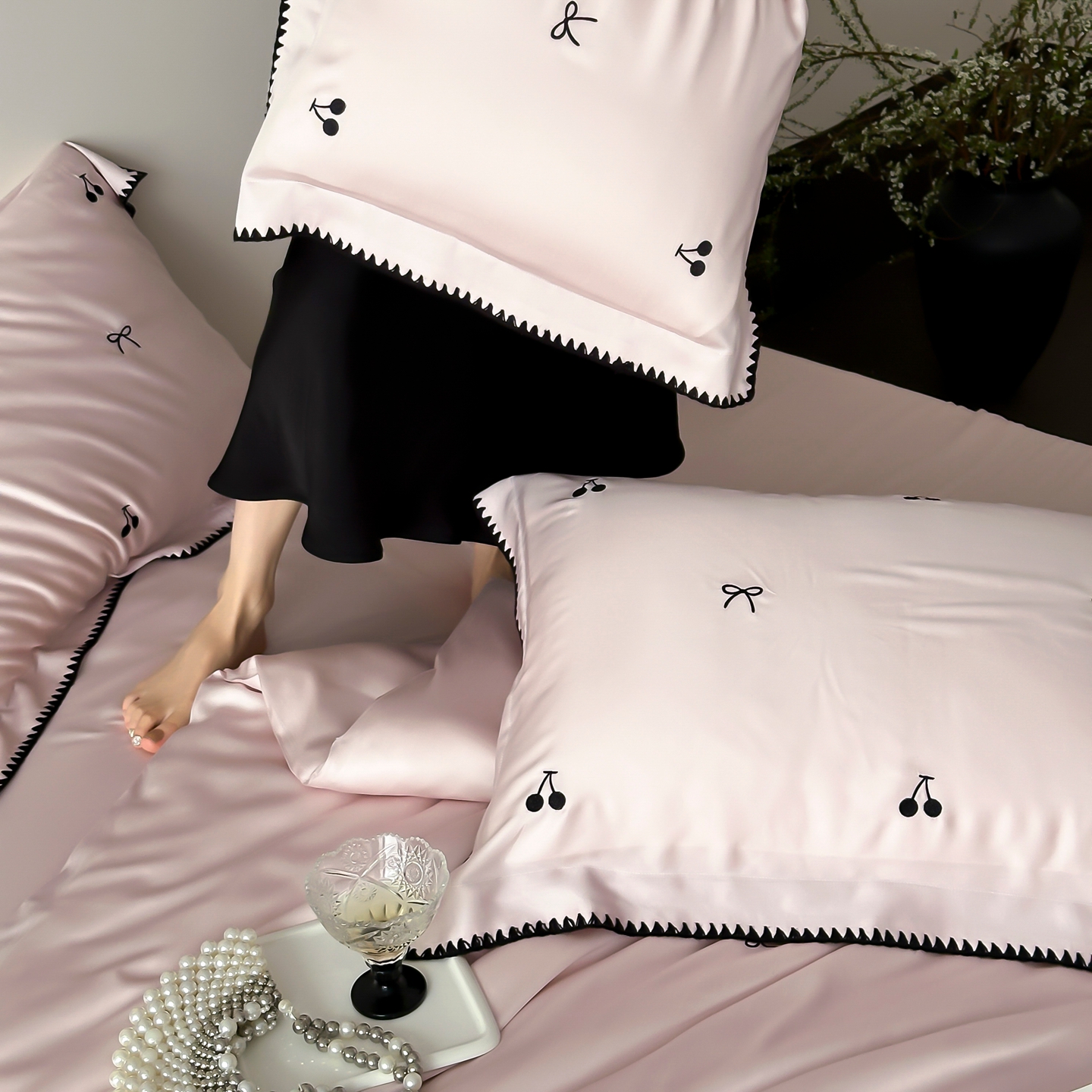 商品名称:时亿家居 2026春夏新款兰精天丝四件套-黑樱梦境 粉