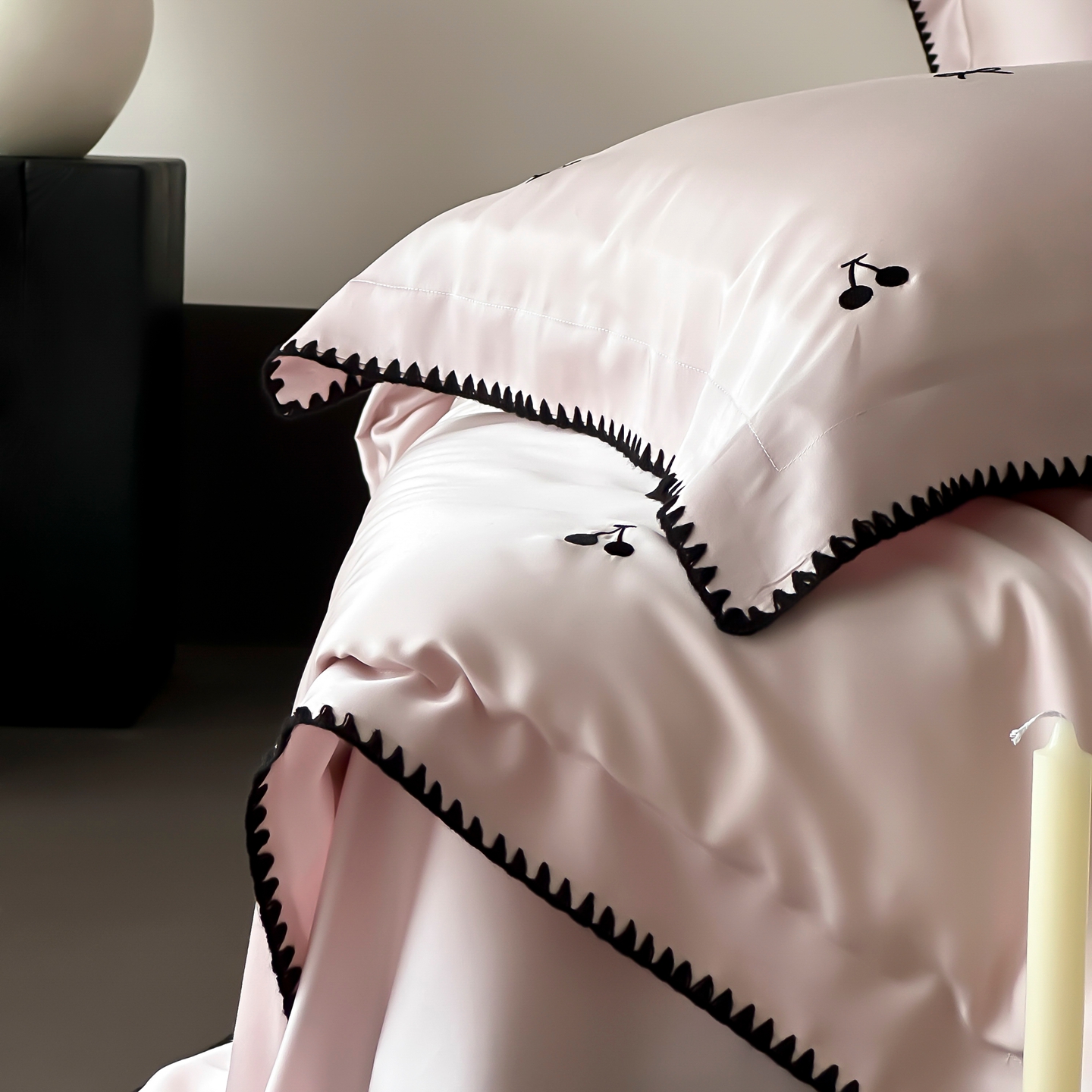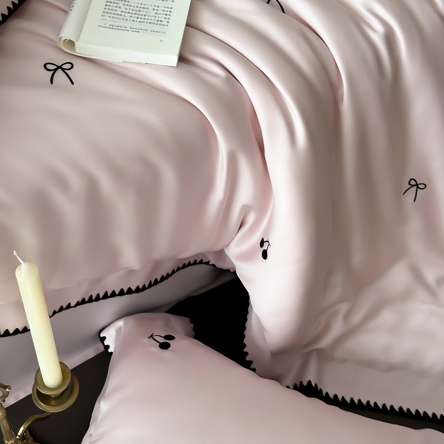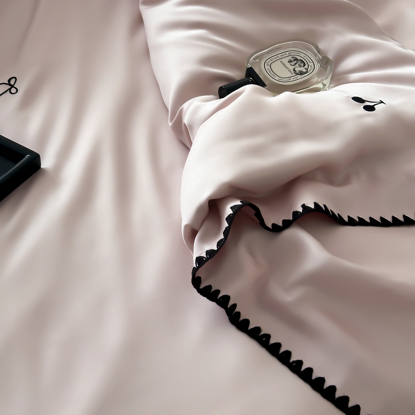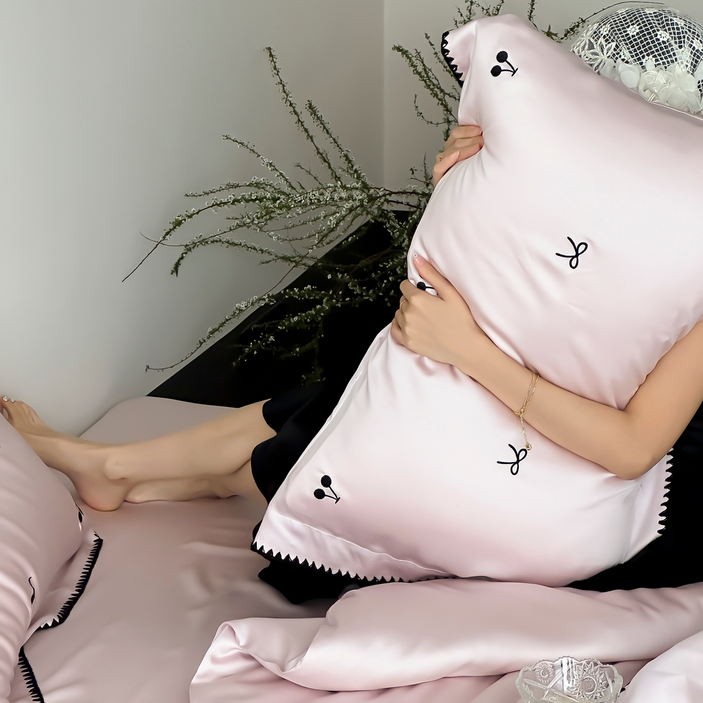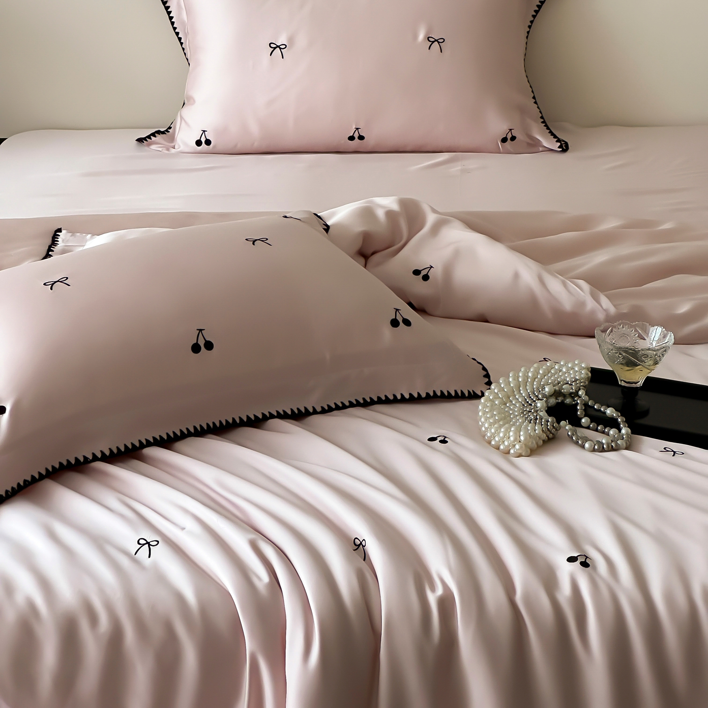 商品名称:时亿家居 2026春夏新款兰精天丝四件套-黑樱梦境 粉