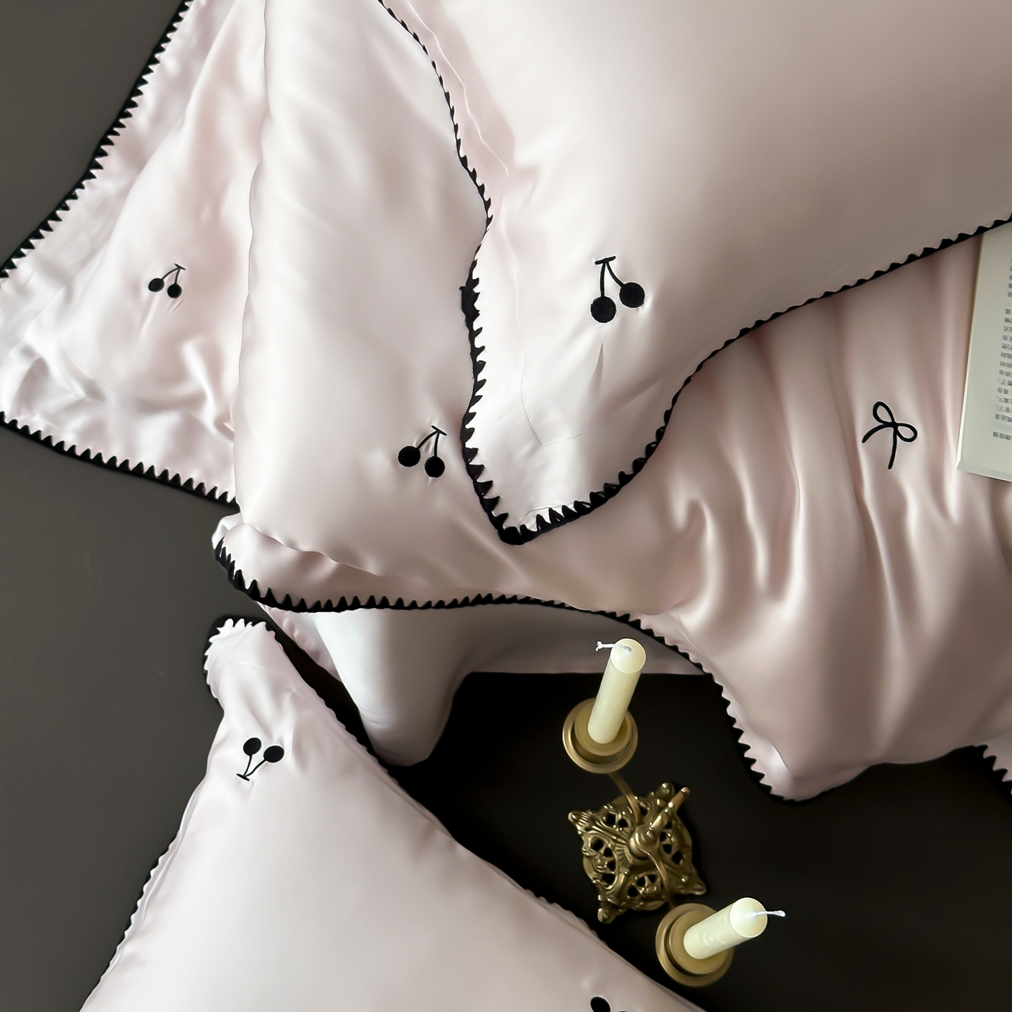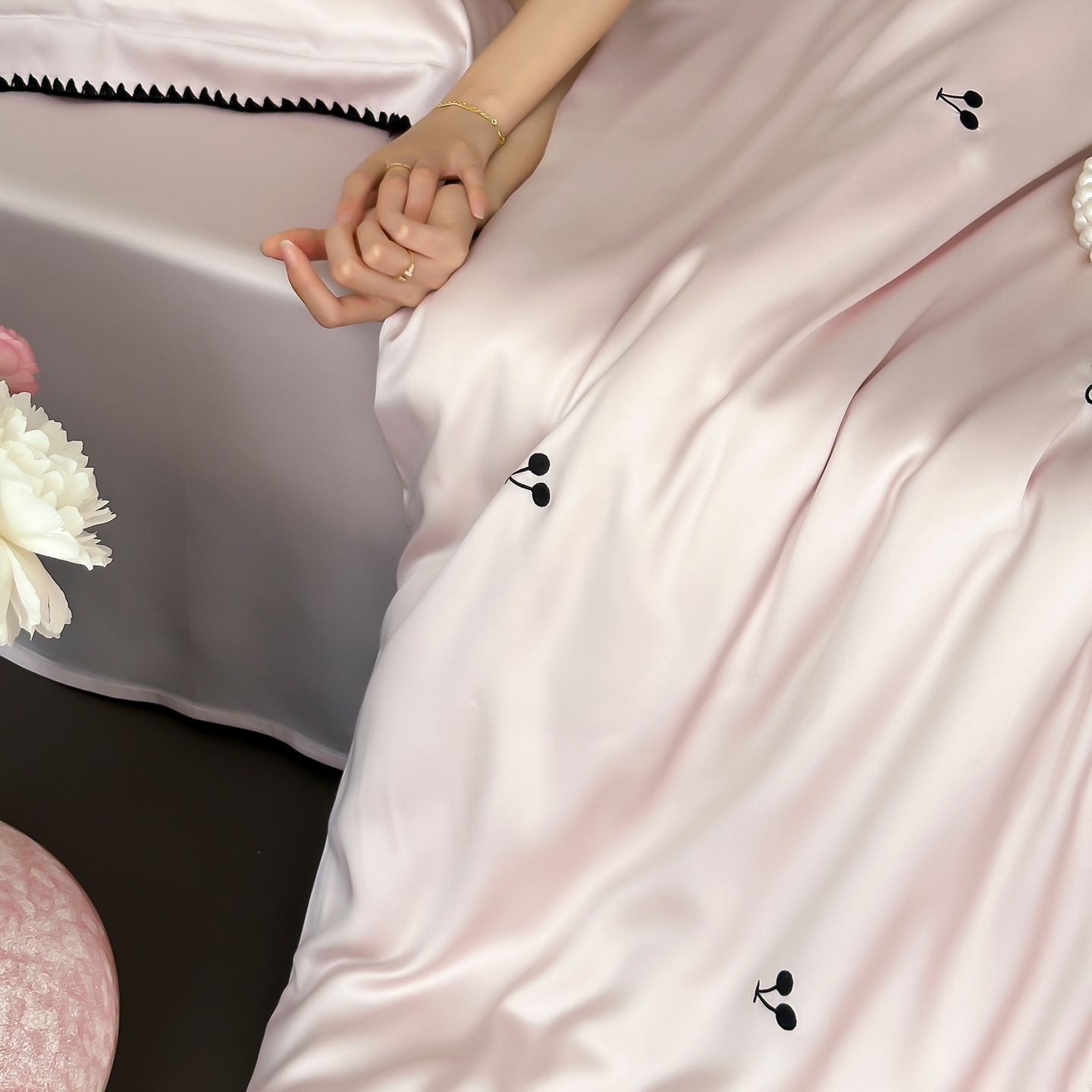 (总)时亿家居 2026春夏新款兰精天丝四件套-黑樱梦境,白,粉,灰色,蓝,香槟,紫色