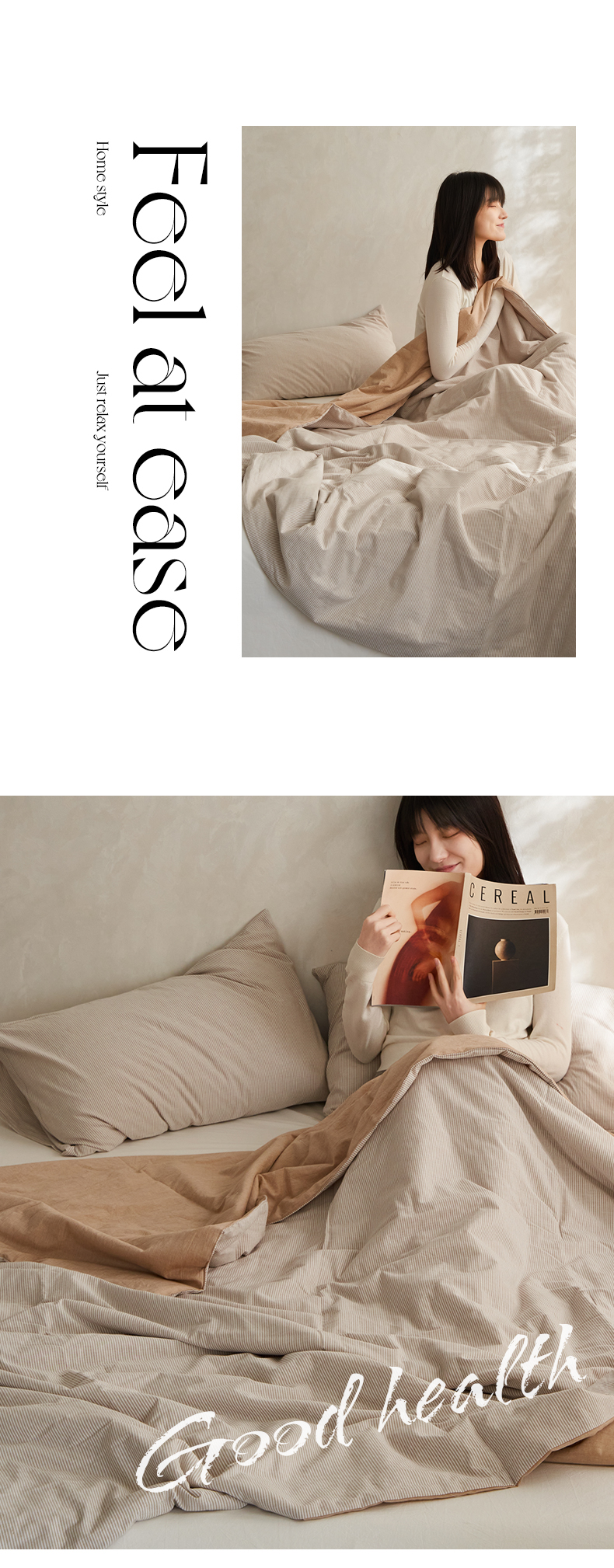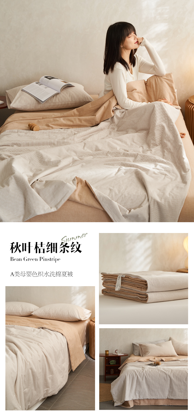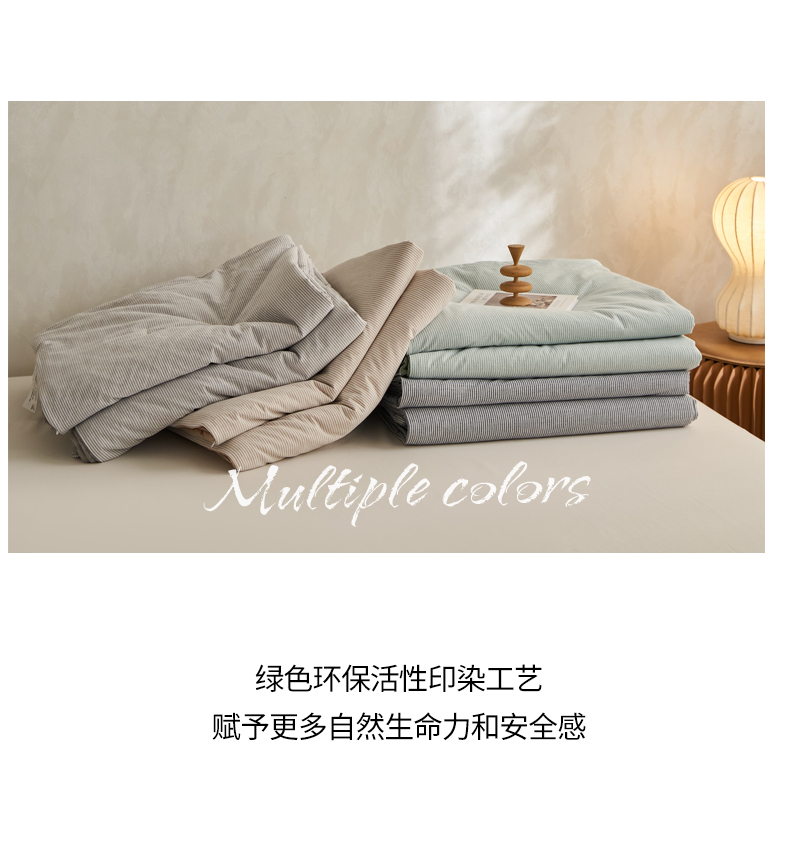 (总)千朵森 2026新款A类全棉色织水洗棉夏被夏被四件套,豆绿细条纹,牛仔蓝细条纹,秋叶桔细条纹,沙杏灰细条纹,叠拍图