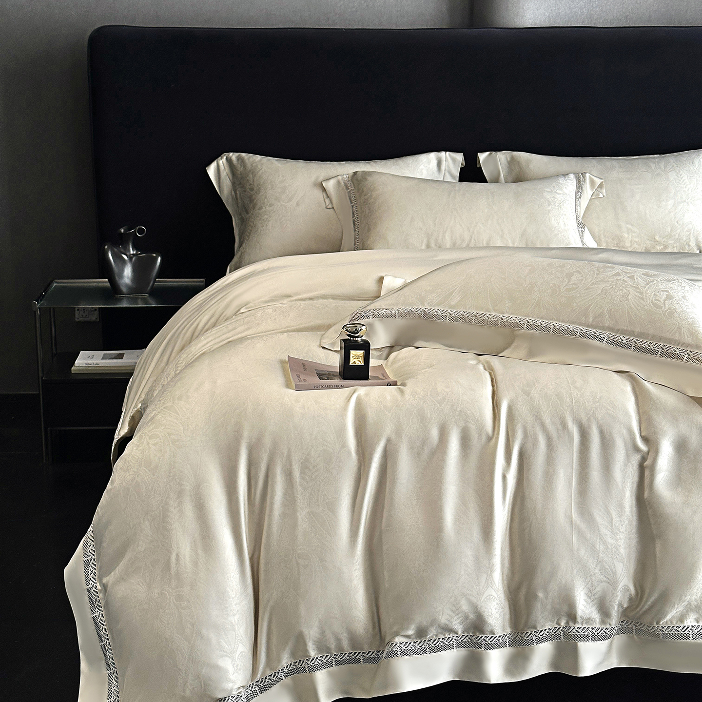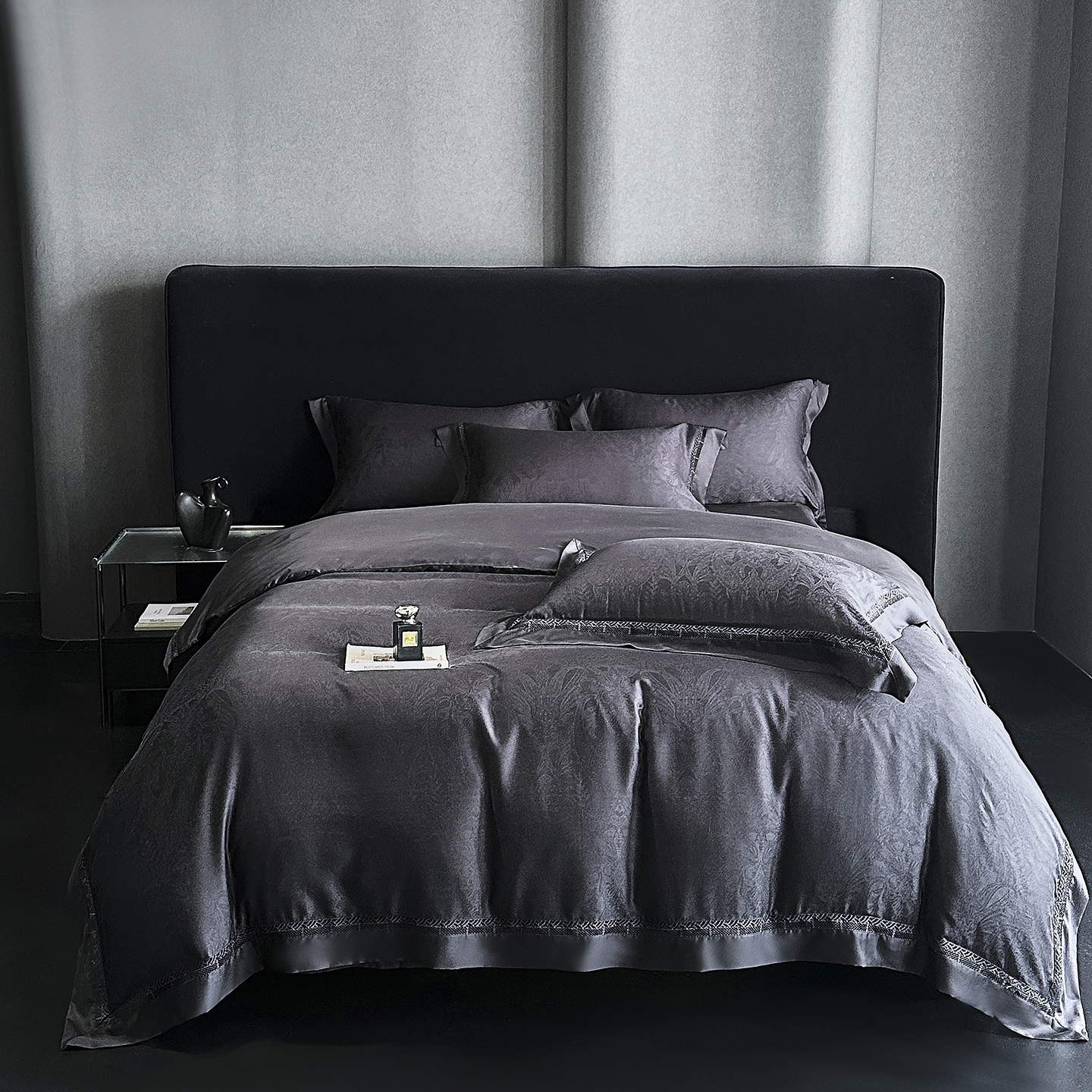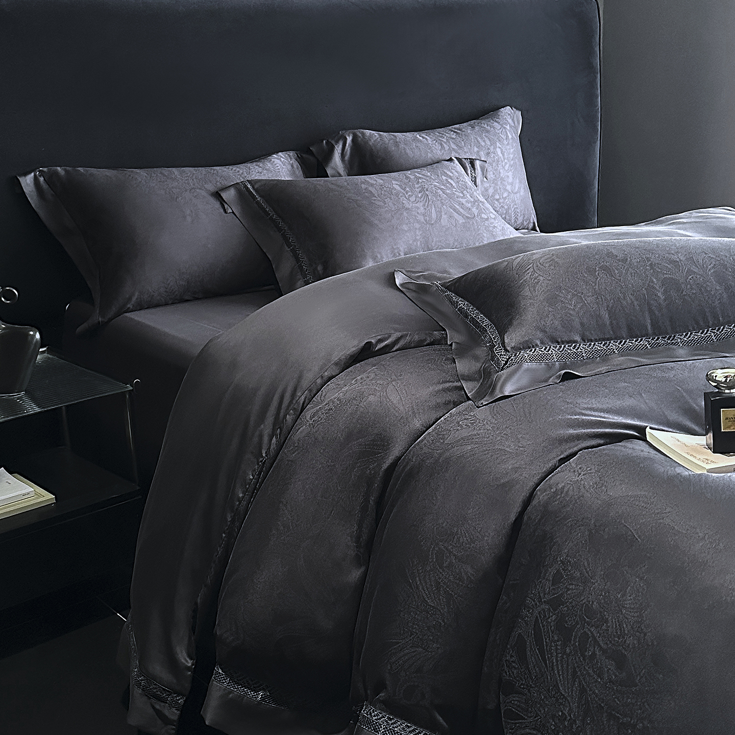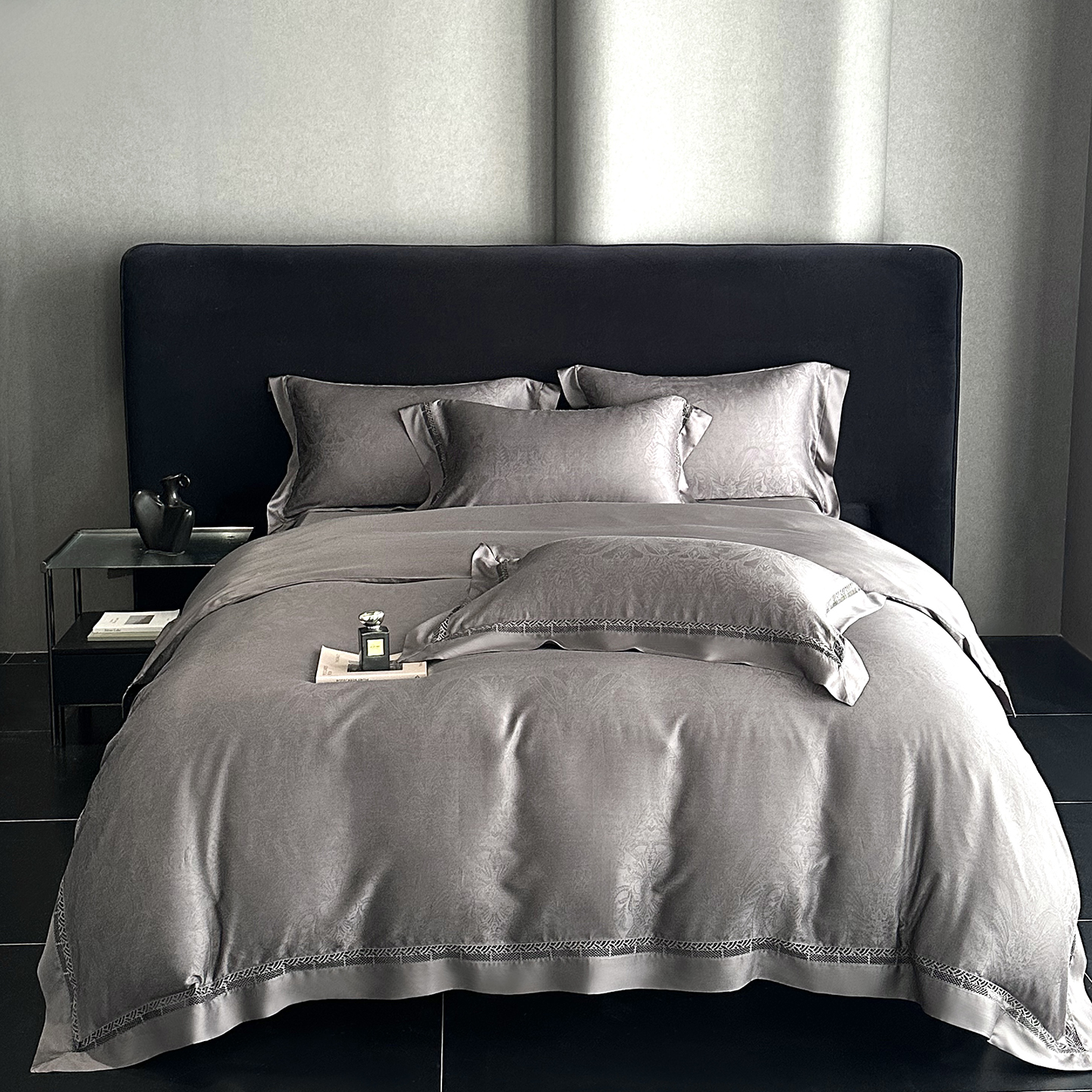 (总)南通朵美纺织品有限公司 2026新款100支天丝镂空提花斐庭系列四件套,斐庭(粉玉),斐庭(黑灰),斐庭(米白),斐庭(浅灰)