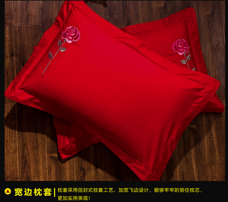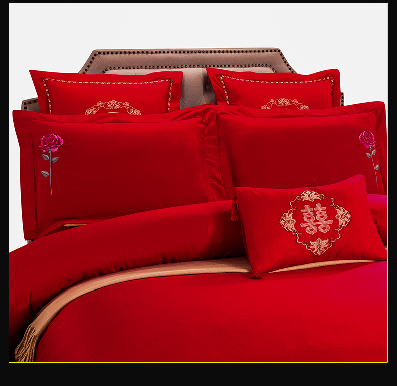 慕她家纺 简约婚庆四件套大红色刺绣全棉纯棉六多件套爱情玫瑰