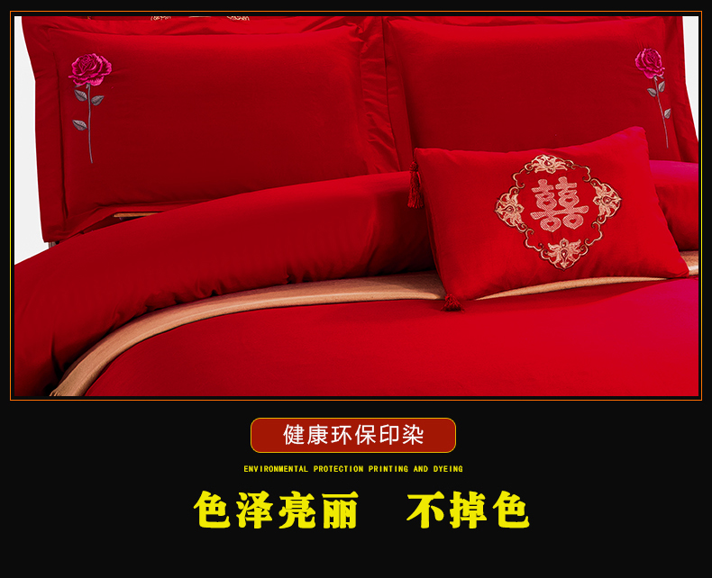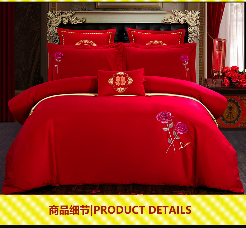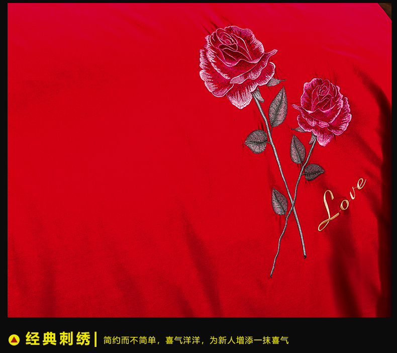 商品名称:慕她家纺 简约婚庆四件套大红色刺绣全棉纯棉六多件套爱情玫瑰