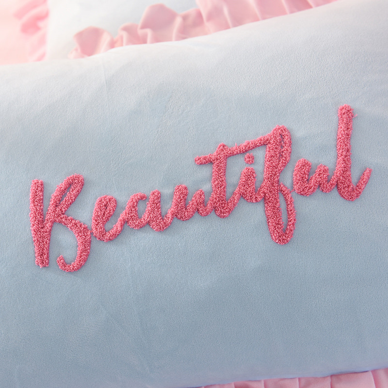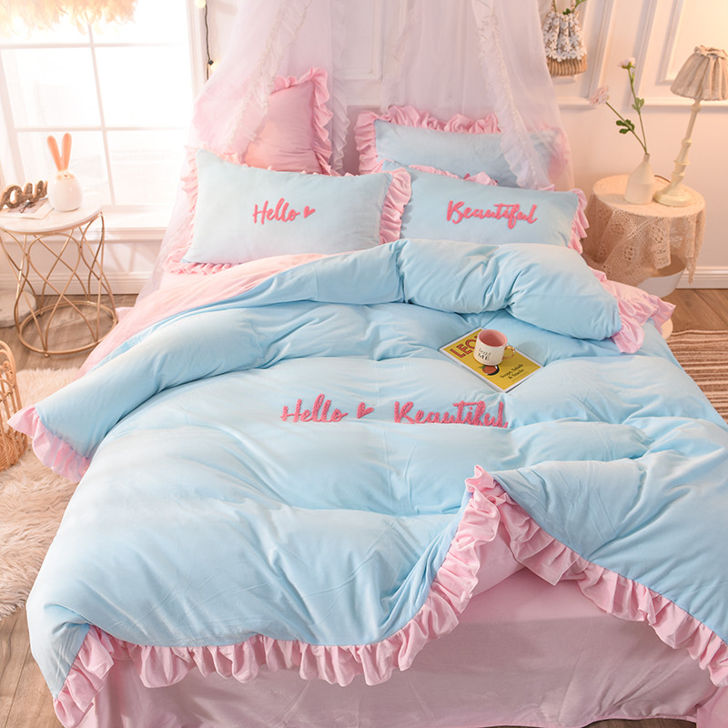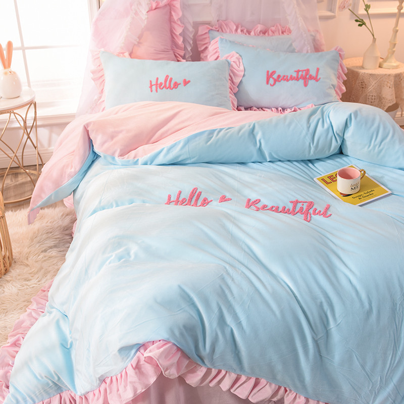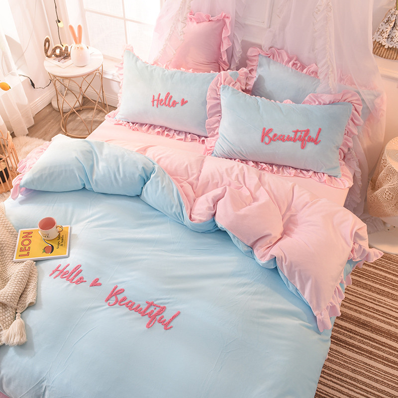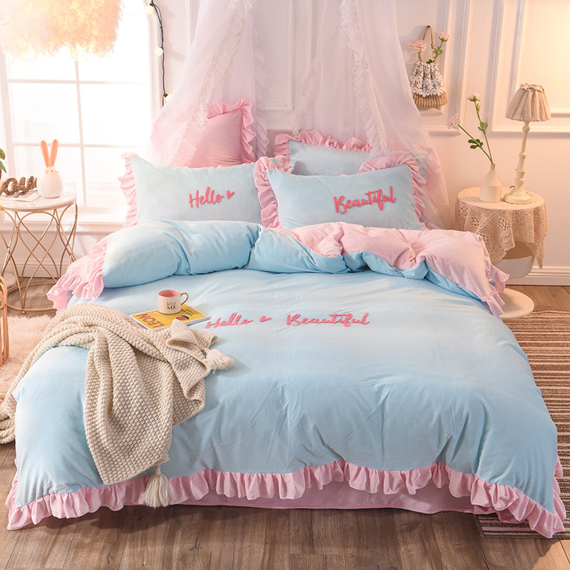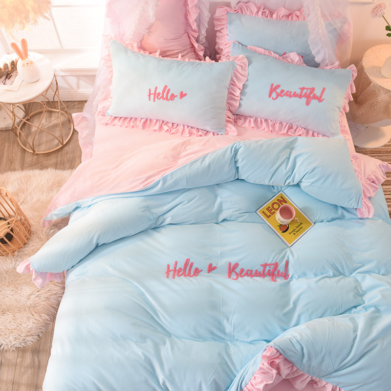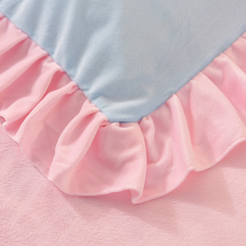 欧冠2019水晶绒宝宝绒花边款和毛巾绣款四件套毛巾绣慕蓝粉