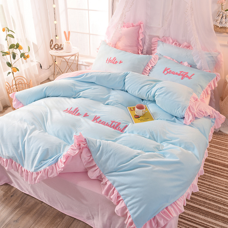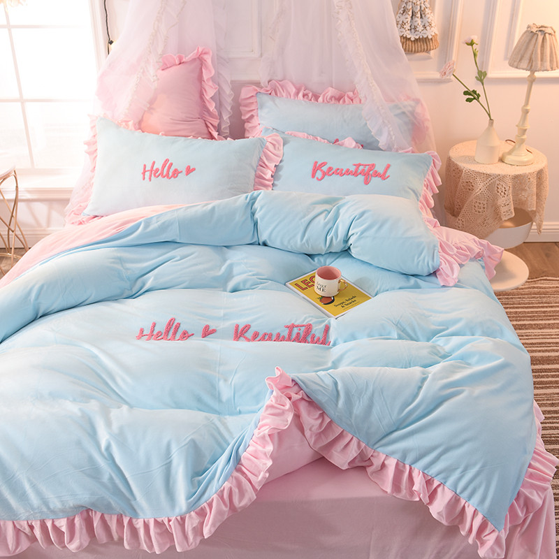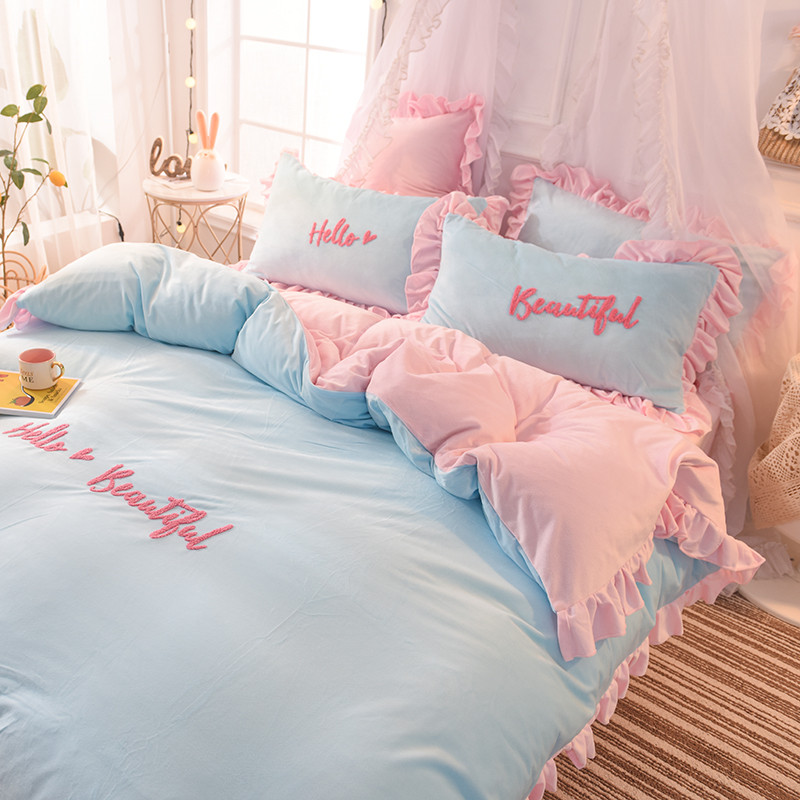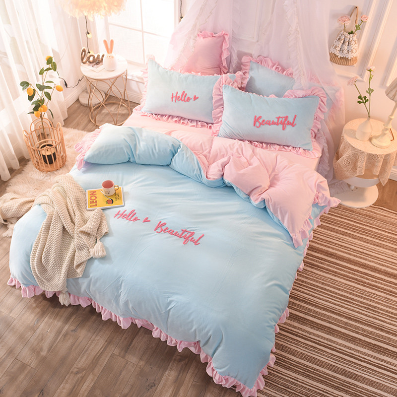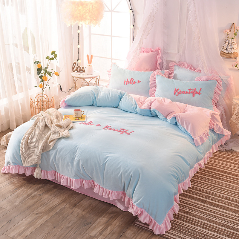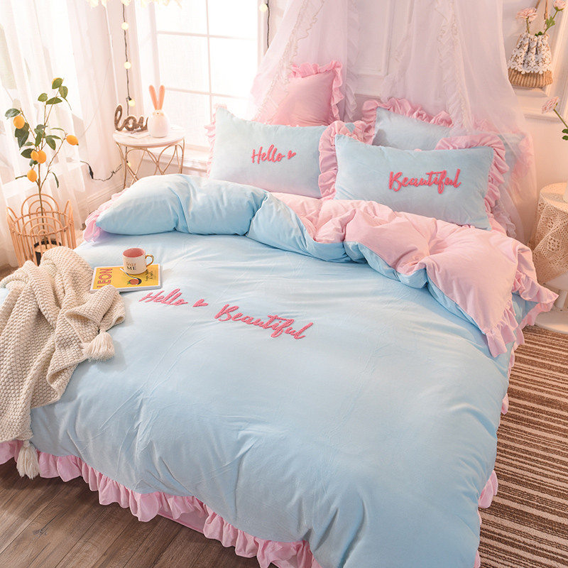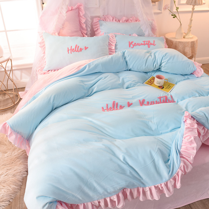 欧冠2019水晶绒宝宝绒花边款和毛巾绣款四件套毛巾绣慕蓝粉