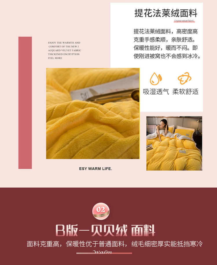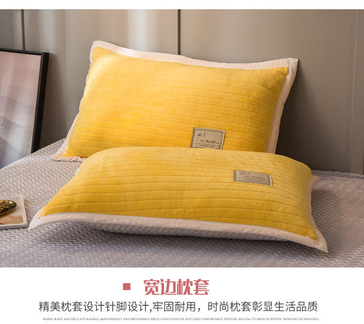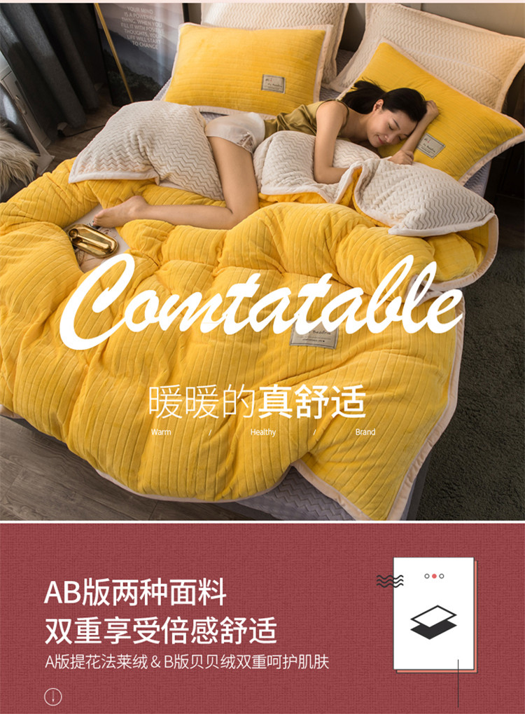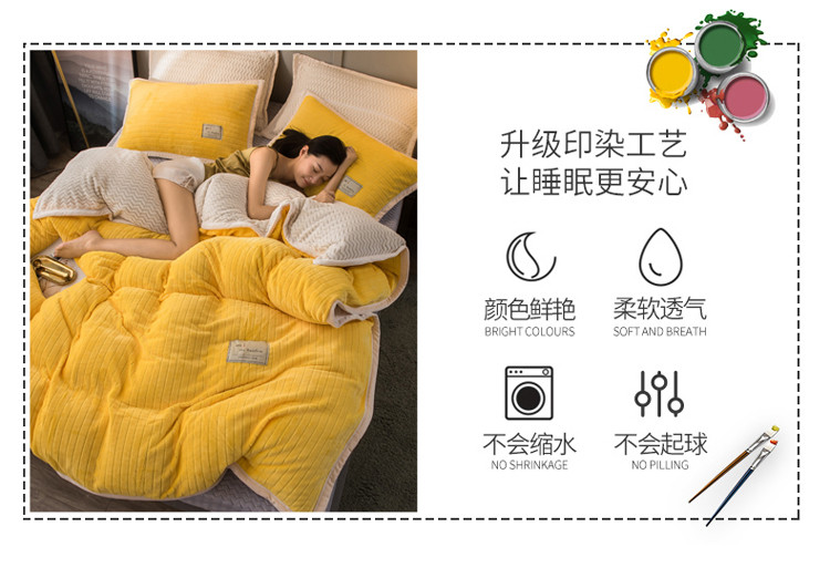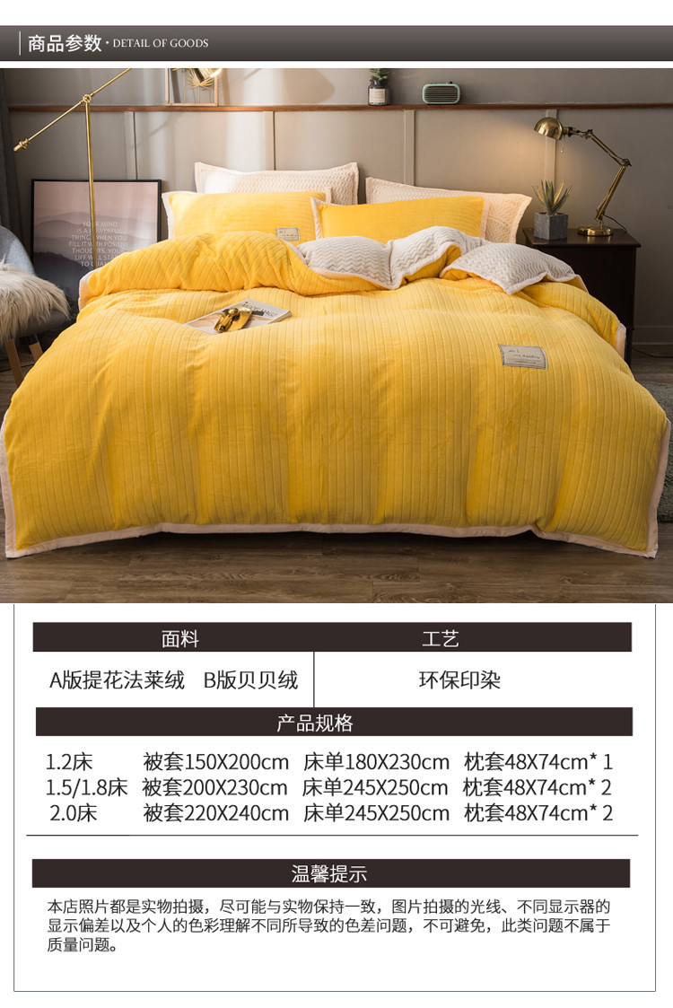 商品名称:欧冠 2019提花法莱绒加贝贝绒加厚四件套 亮黄白